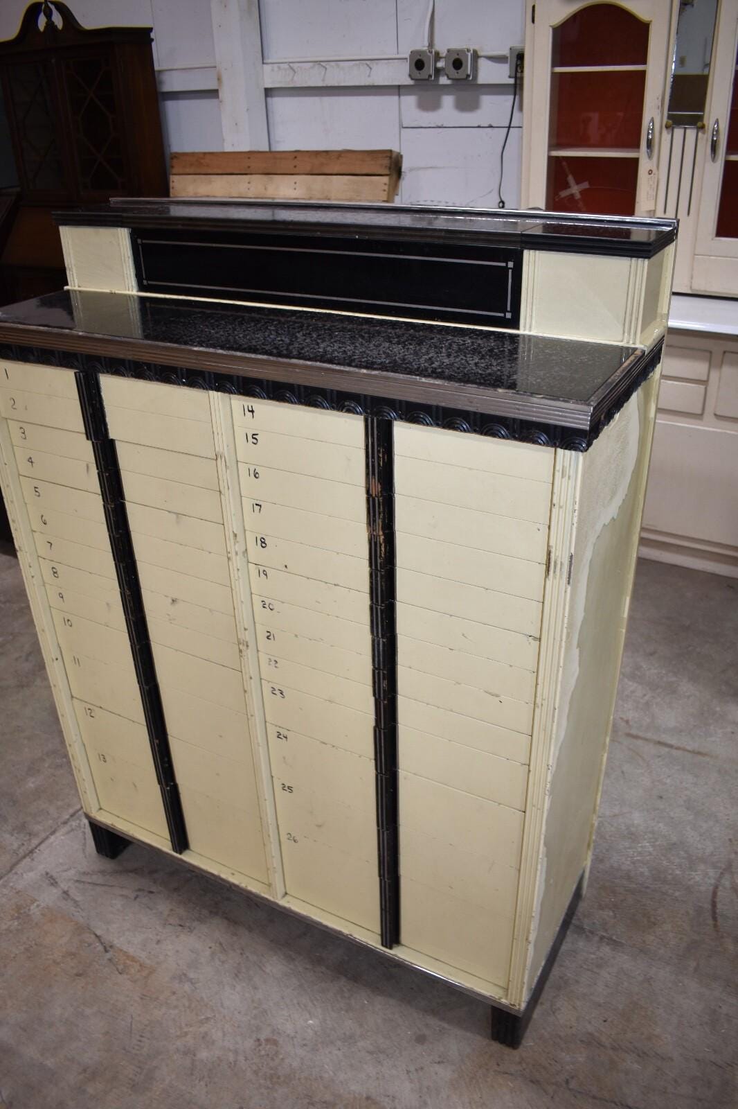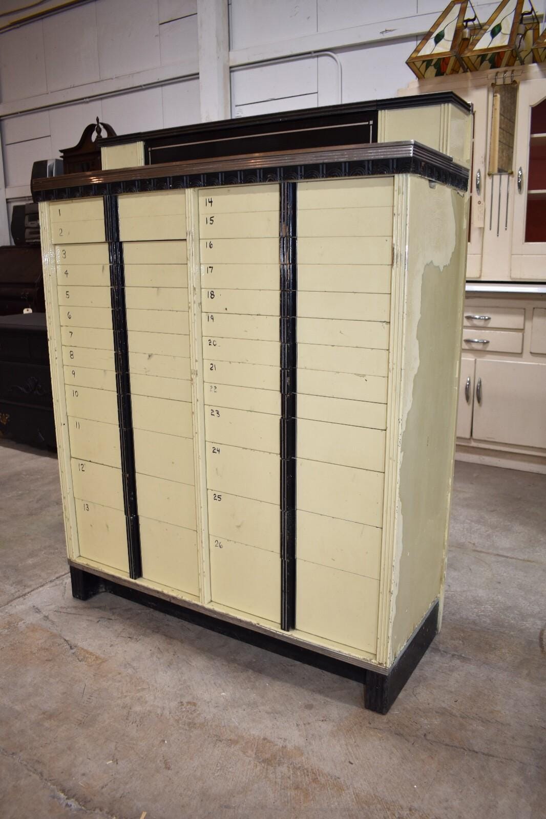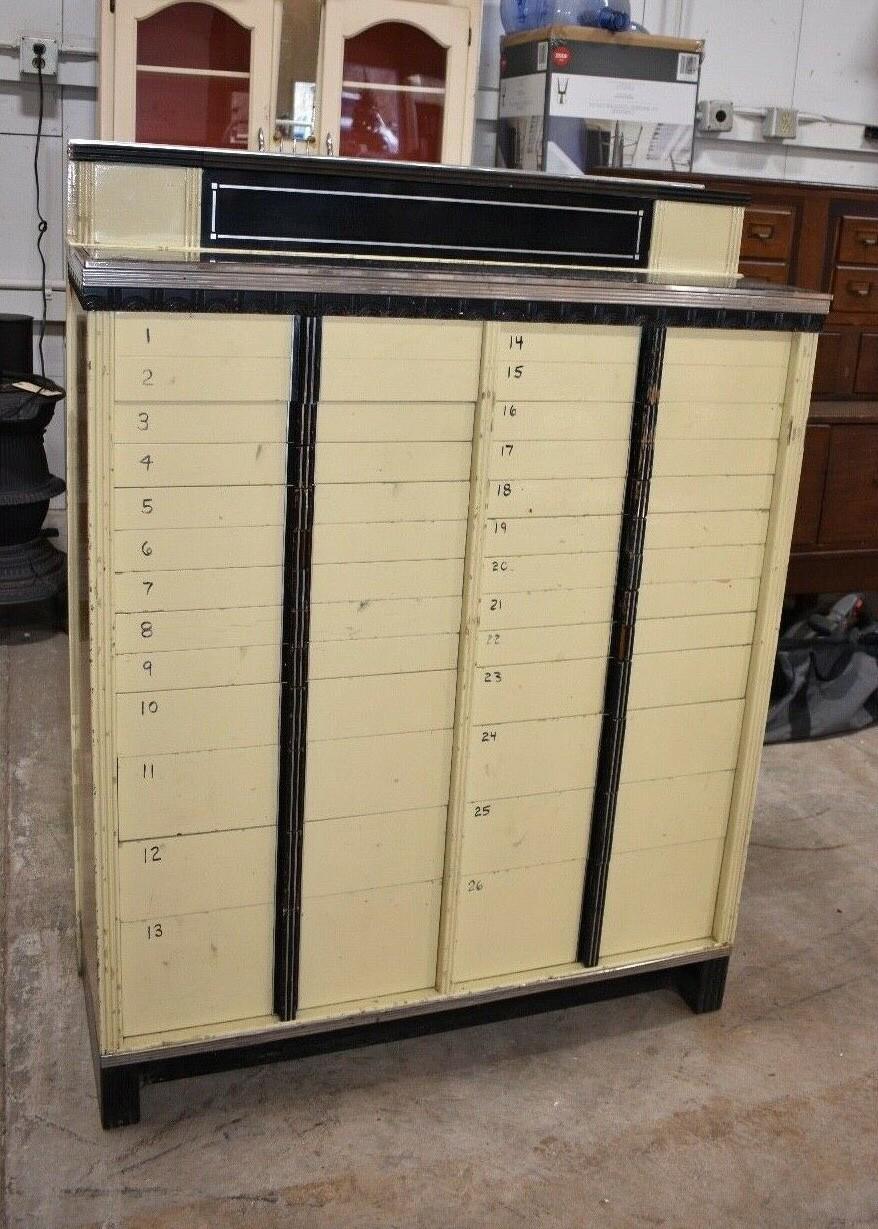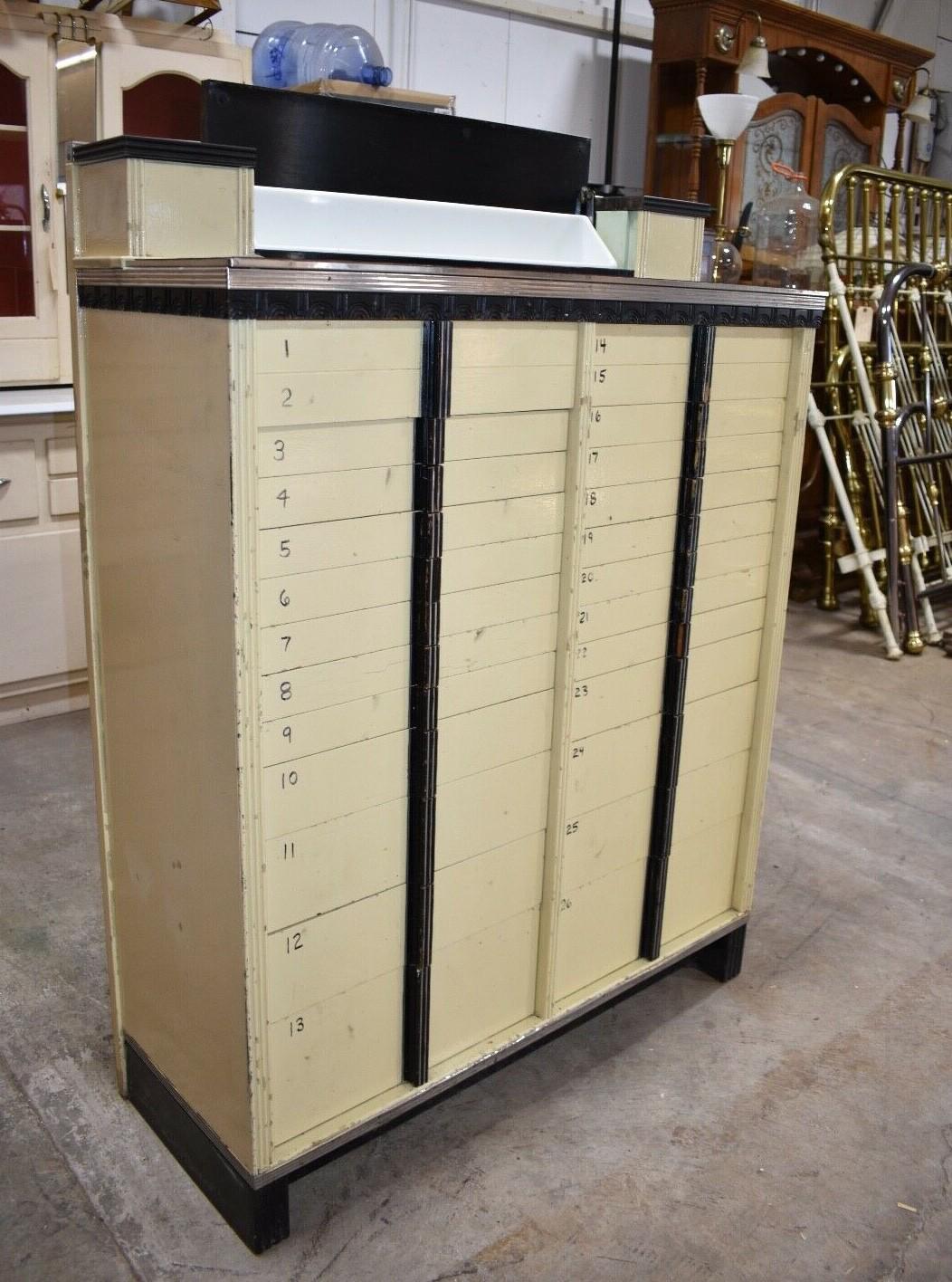26 Drawers! Flip top upper areas. Some of the drawers have milk glass trays. *the numbers that were added with marker may possibly be able to be removed.