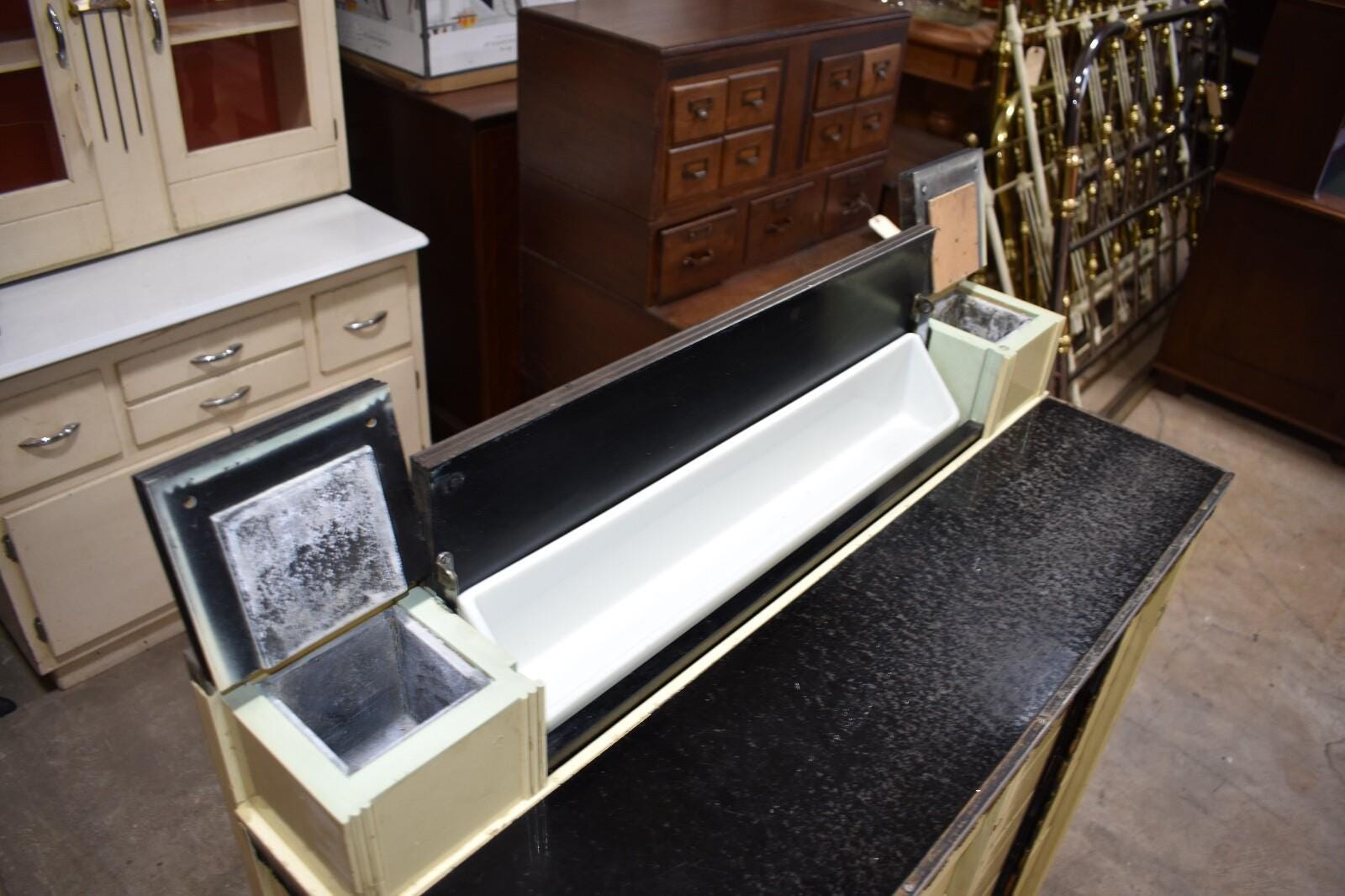 Condition: Nice antique patina which shows some of wear from age/use. Scratches, bumps, marks, stains, etc. See photos. Chips to paint. Missing a small piece of molding on the work top area, on edge.