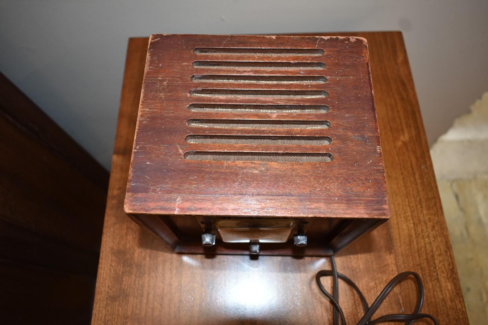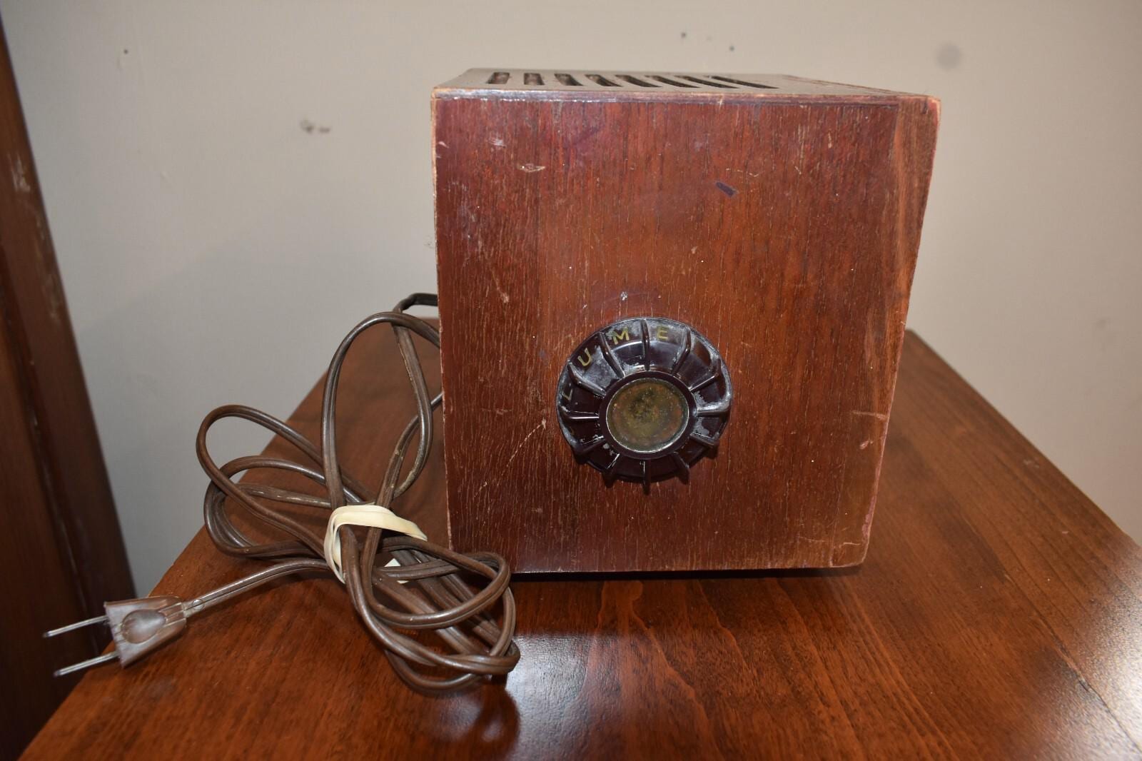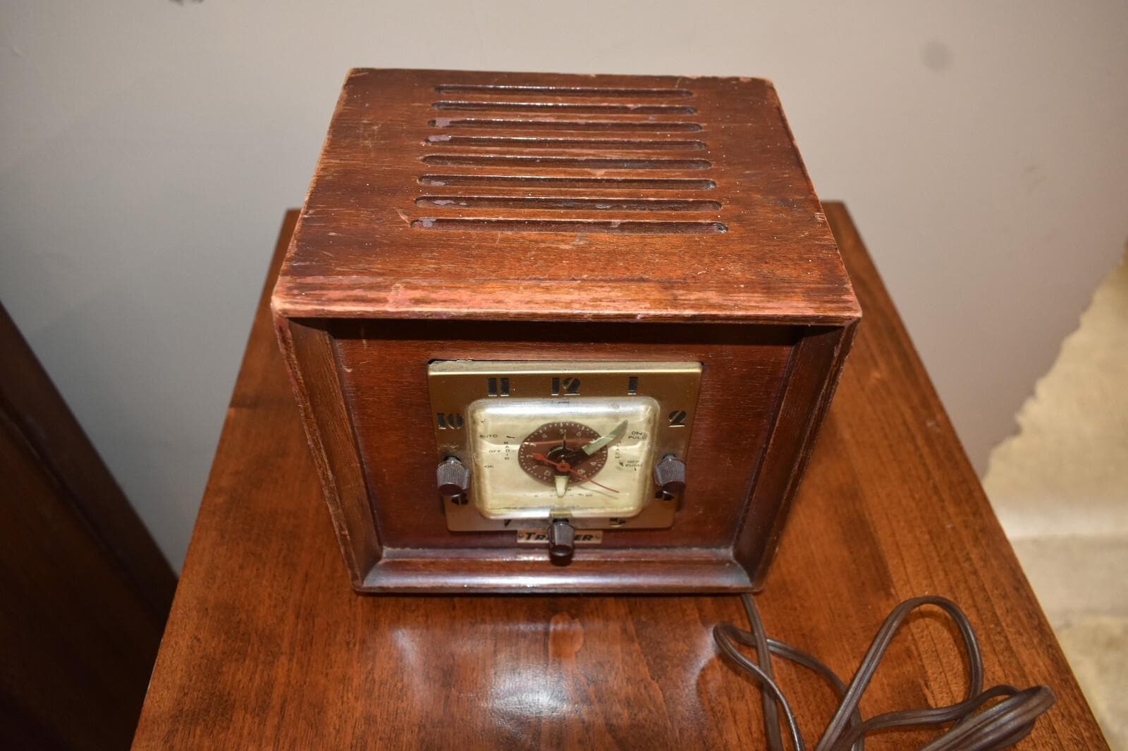 Condition: Overall good. It was plugged in and the second hand does spin, but we dont know if the radio works or if it keeps good time. The case has some wear and tear but overall good antique condition.