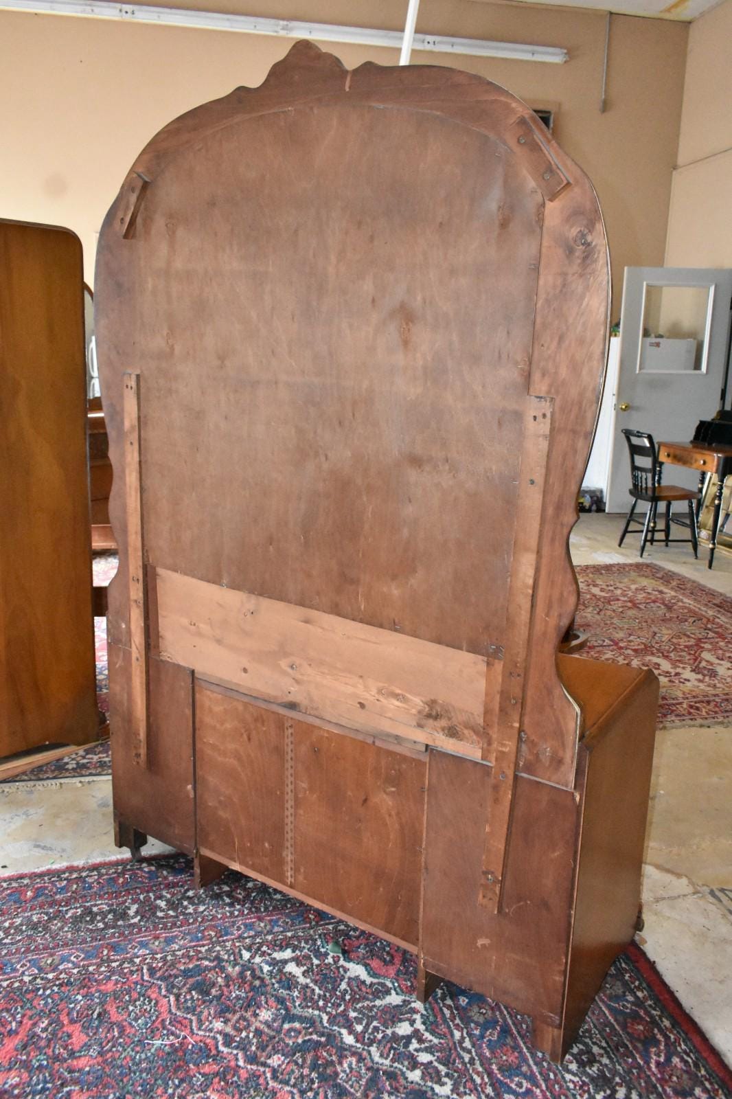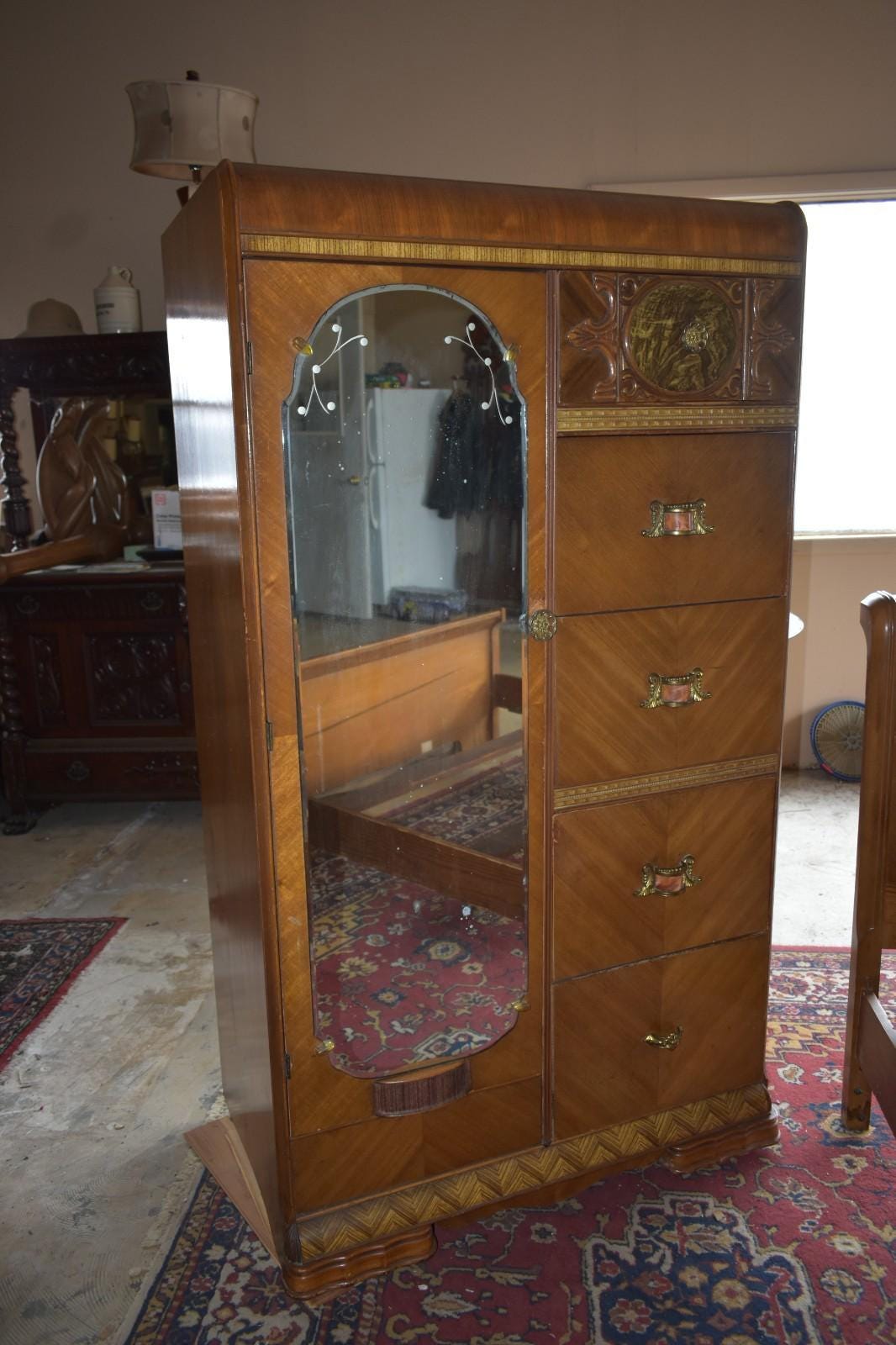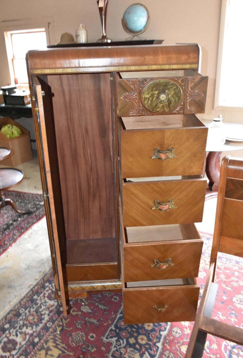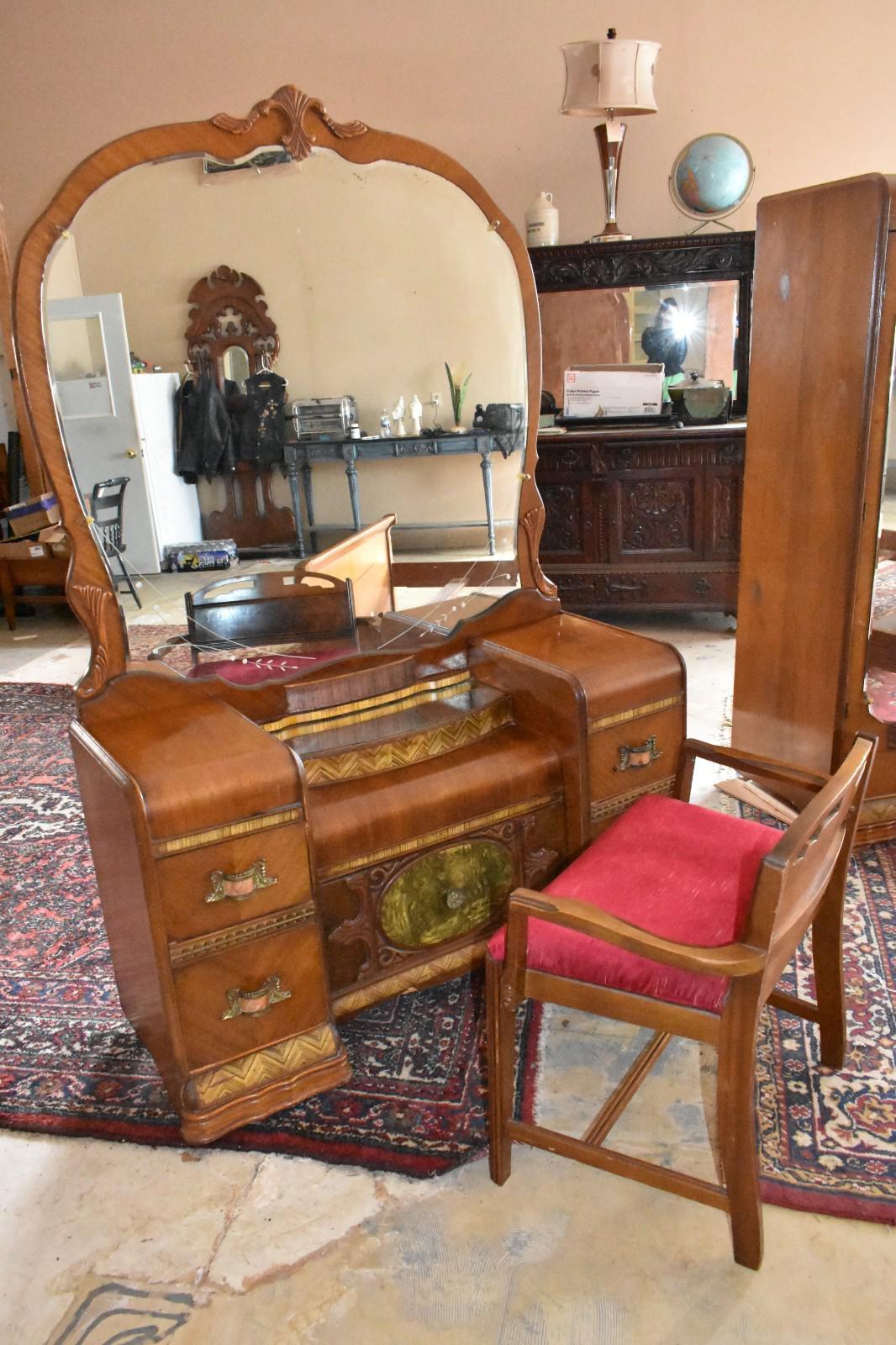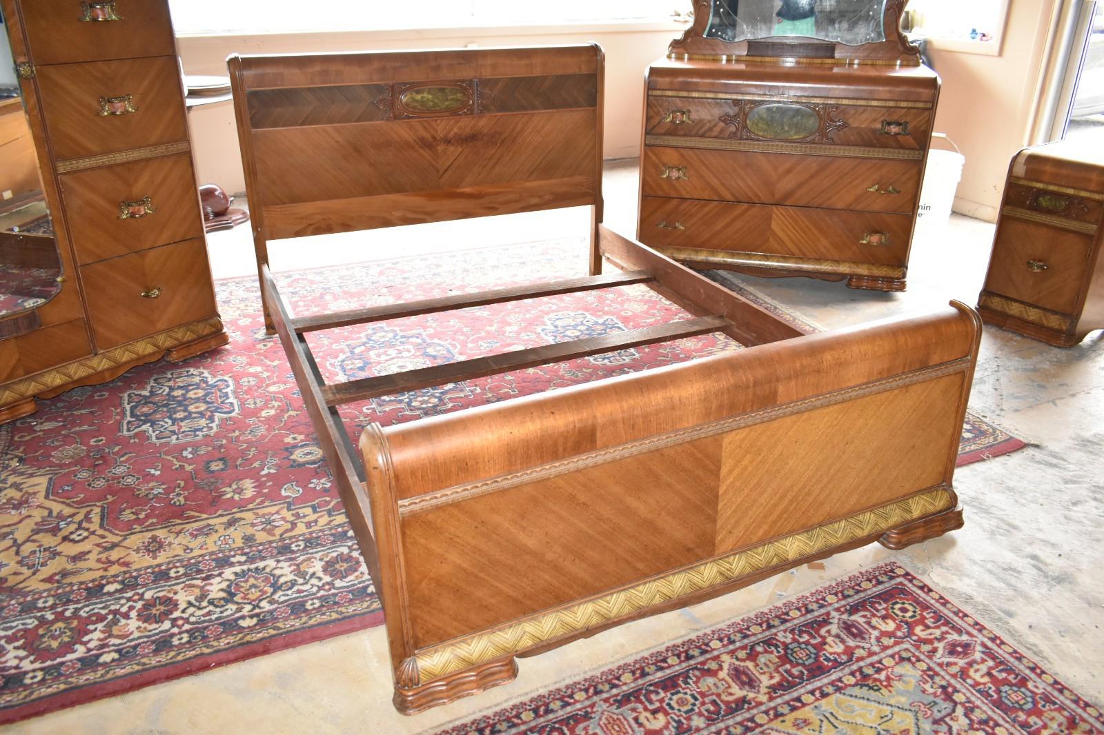 Offered is a beautiful Antique Art Deco Waterfall Bedroom Set, circa 1930s, showcasing classic Depression-era waterfall styling with curved edges, dramatic bookmatched veneers, chevron patterns, and original brass hardware.