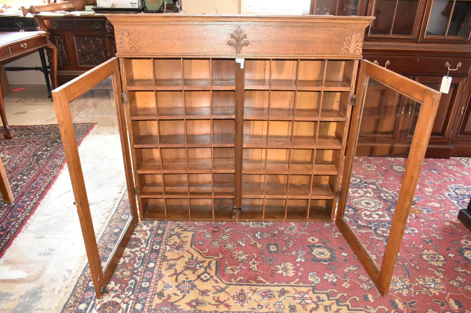 Antique Barber Shop Mug Cabinet – Oak, Glass Doors, Individual Cubby Storage