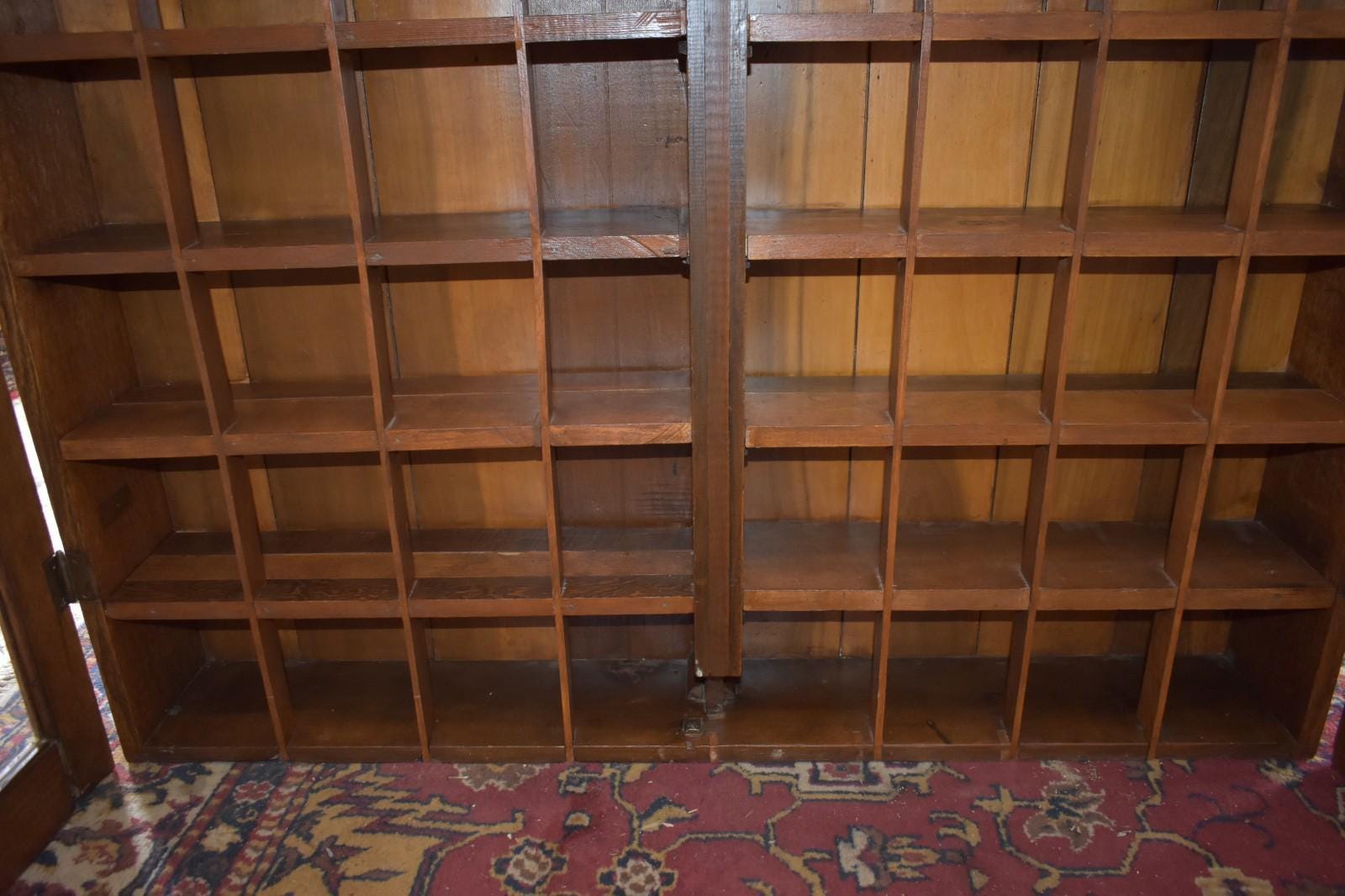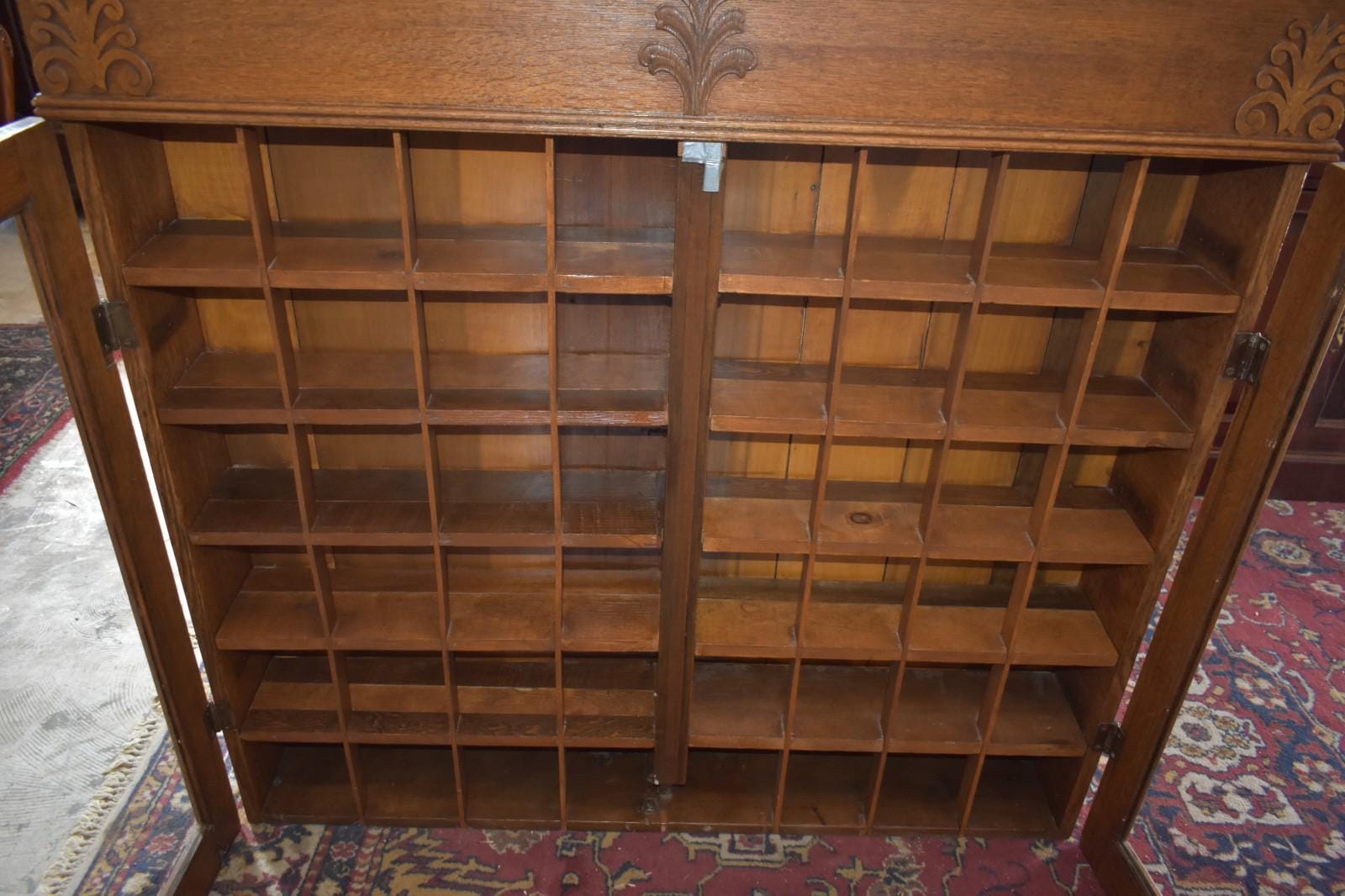 These cabinets were traditionally used in early 20th-century barber shops to store individual shaving mugs, brushes, and personal grooming items for regular customers. The interior is divided into numerous evenly sized cubbies, each originally intended to hold a customer’s mug — a hallmark feature of true barber shop cabinetry.