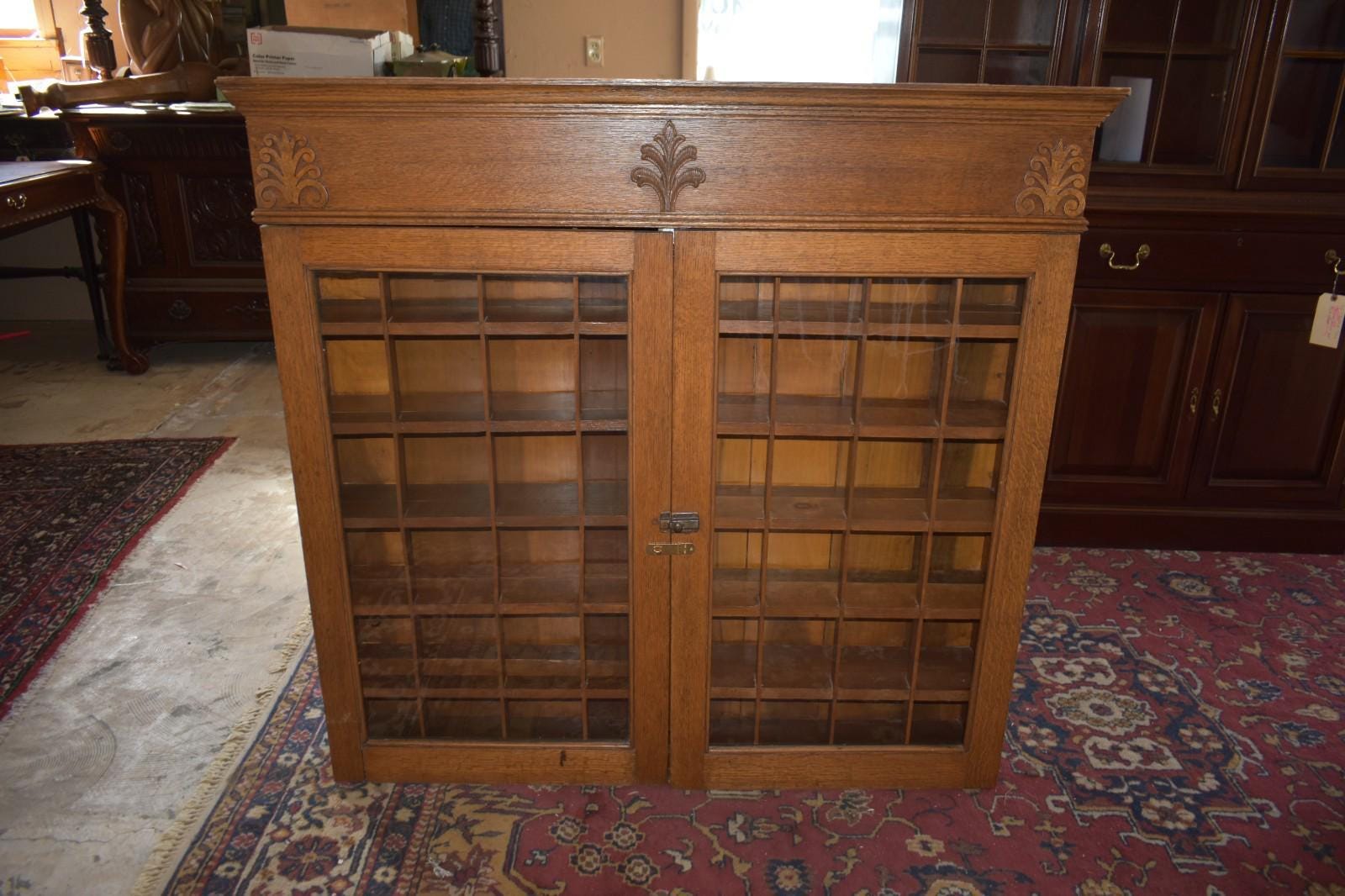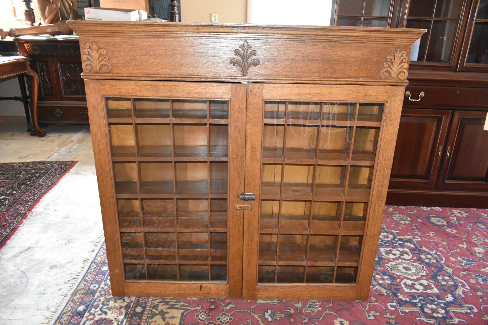 Be the first to review “Antique Barber Shop Mug Cabinet – Oak, Glass Doors, Individual Cubby Storage”