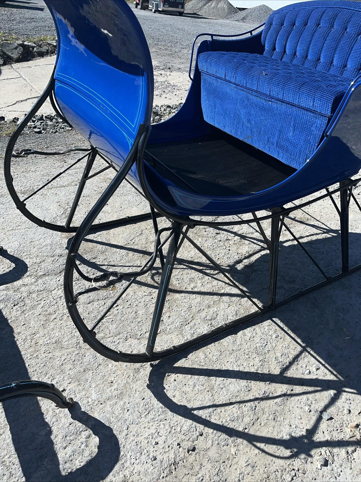 Blue body with light blue striping. Black running gear shafts with blue striping. Blue tufted upholstery..