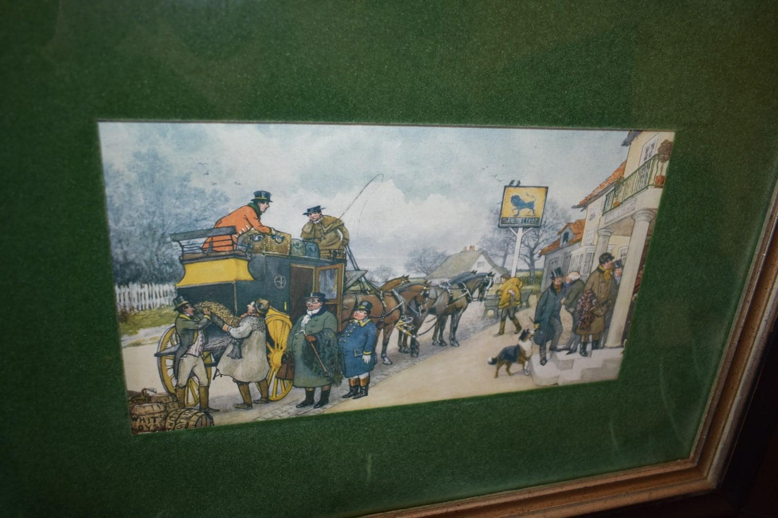 Antique framed print depicting a lively horse-drawn stagecoach and carriage scene, with figures gathered at an inn or roadside stop. The artwork captures classic 19th-century travel imagery and pairs especially well with traditional, equestrian, or historic décor.
