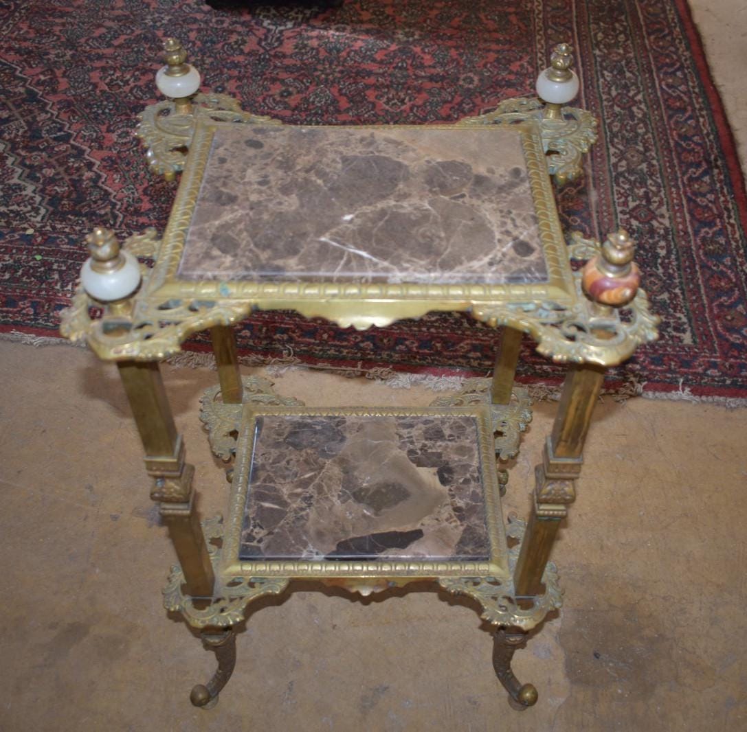 Offered is a brass and marble two-tier side table, executed in the Louis XVI / Belle Époque revival style, inspired by late 19th–early 20th century French decorative arts.