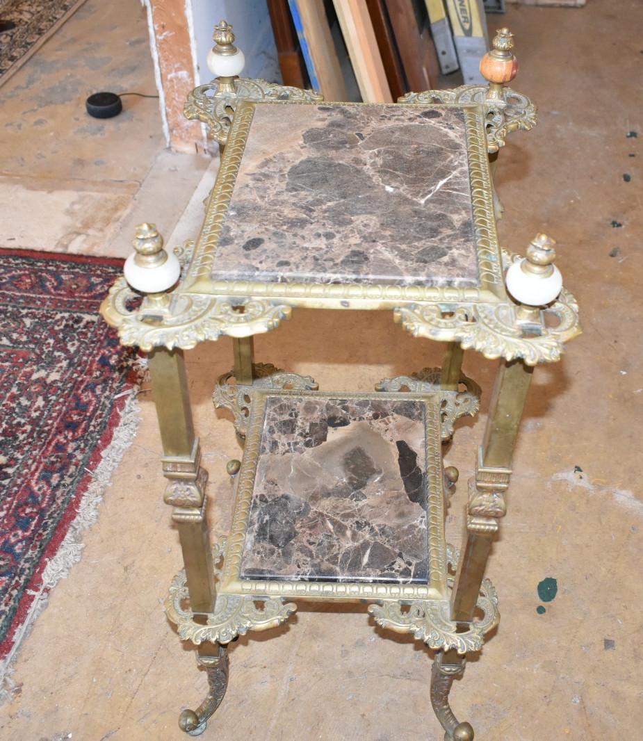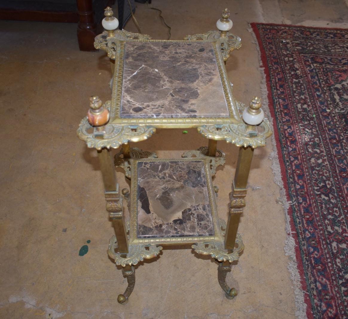 The table features a classical square form with symmetrical proportions, decorative brass framework, and two inset marble surfaces. The design elements—marble panels, classical mounts, finials, and curved feet—reflect the restrained elegance typical of Louis XVI and Belle Époque–inspired furnishings.