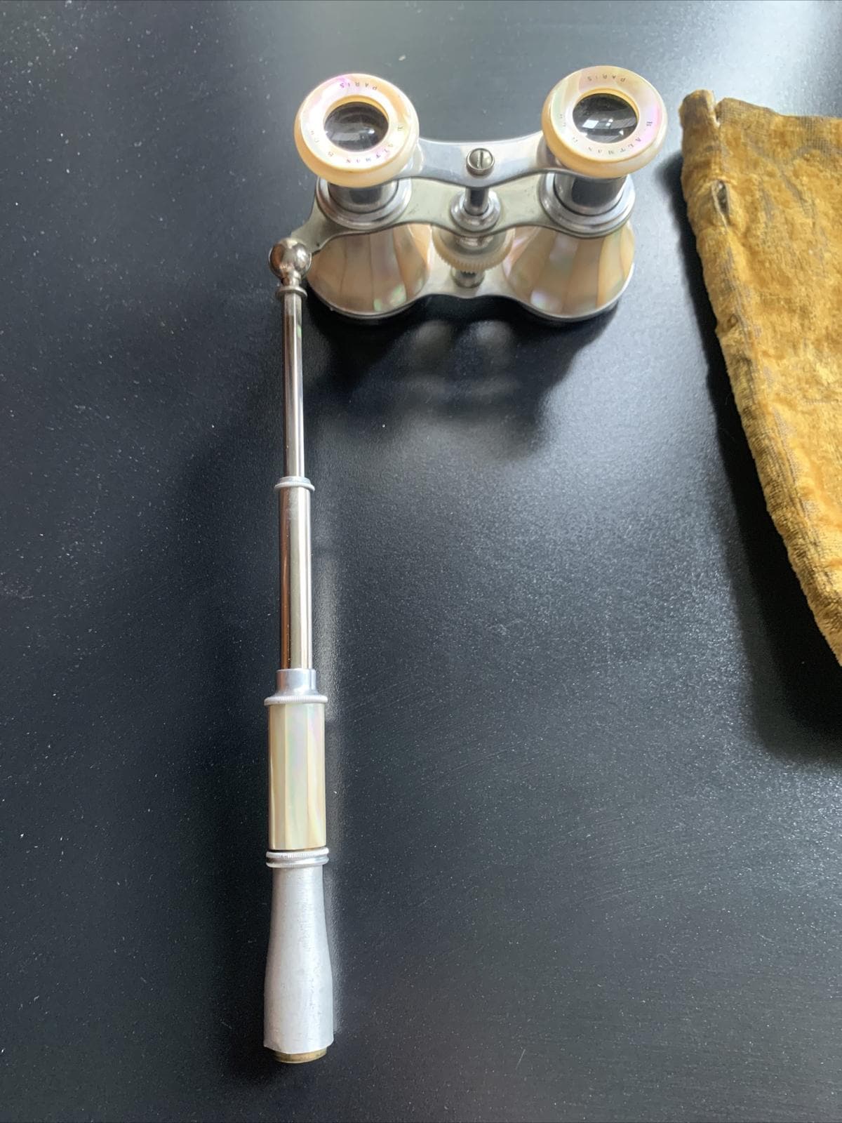 Most likely late 19th century. This is a pair with a telescopic lorgnette handle. All is wrapped in a wonderful Mother of Pearl or Nacre shell with its iridescent qualities. Fully working with good optics. Articulate well.