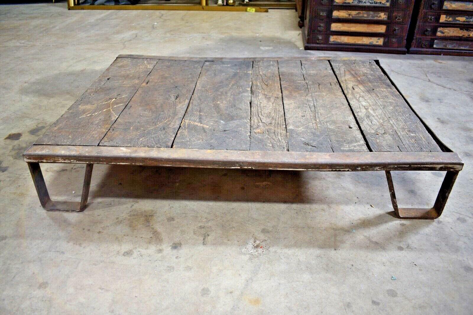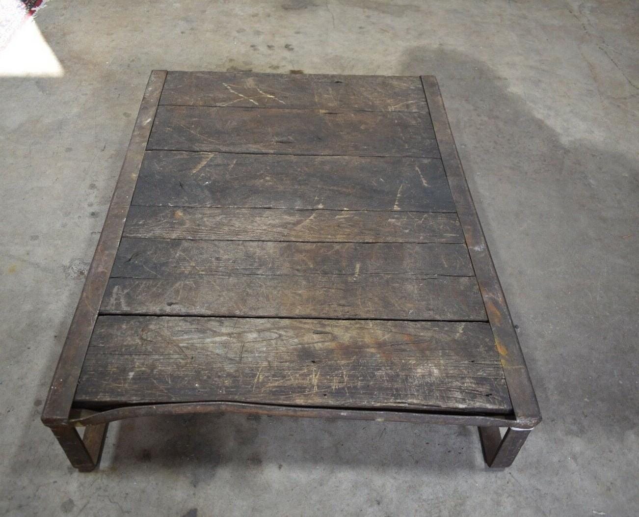 Antique Iron and Oak Slat Train Skid, Industrial Table
