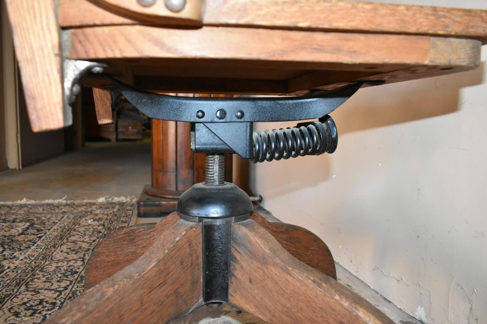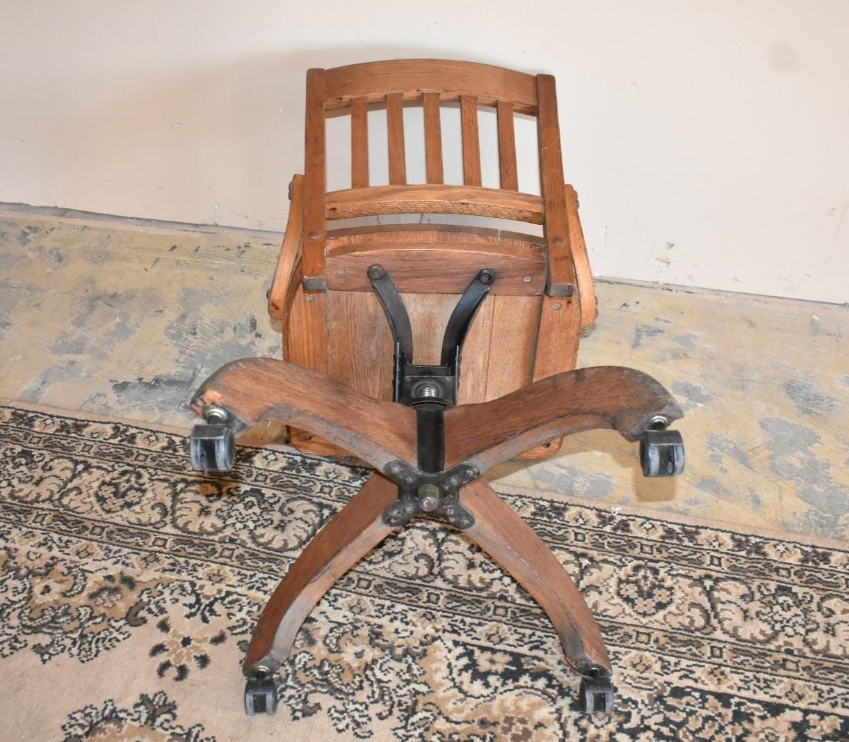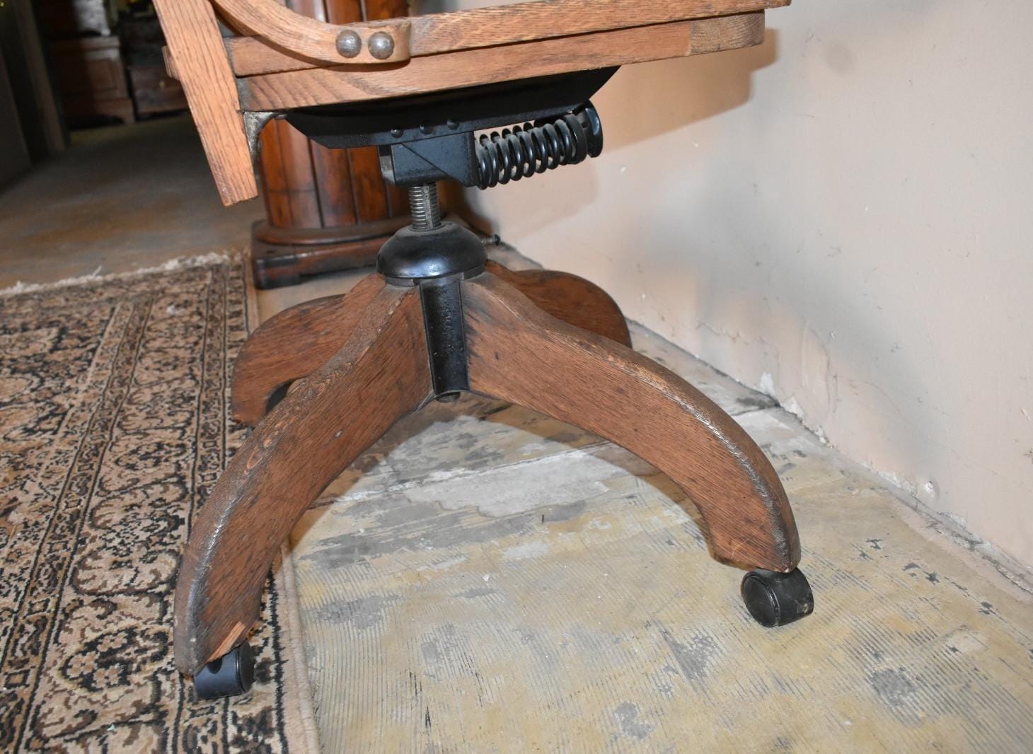Good antique condition with visible wear consistent with age and use. Surface wear, scratches, and patina present throughout, as expected for an antique office chair. Structurally solid and fully functional.