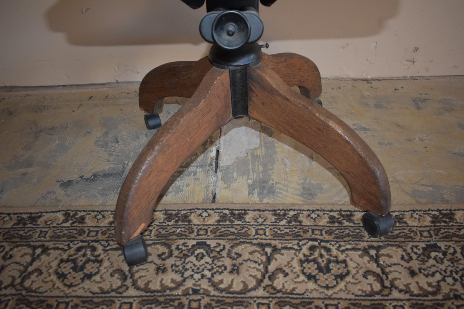 The chair has a slat-back design with a shaped solid oak seat and sturdy four-leg swivel base. Height adjusts via the original metal screw mechanism beneath the seat. Rolls smoothly and swivels freely.