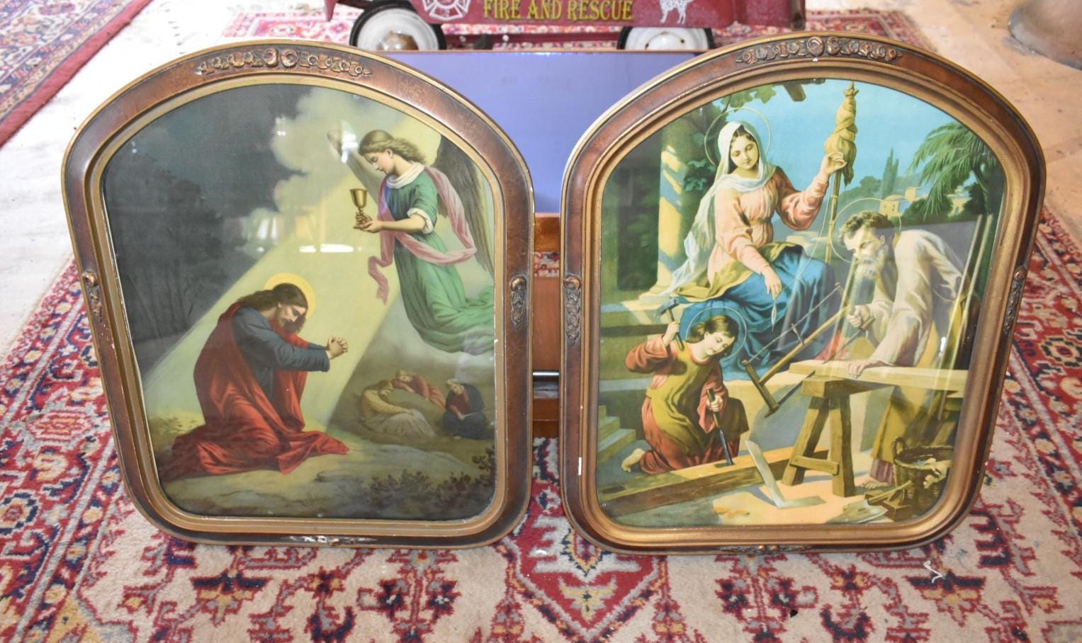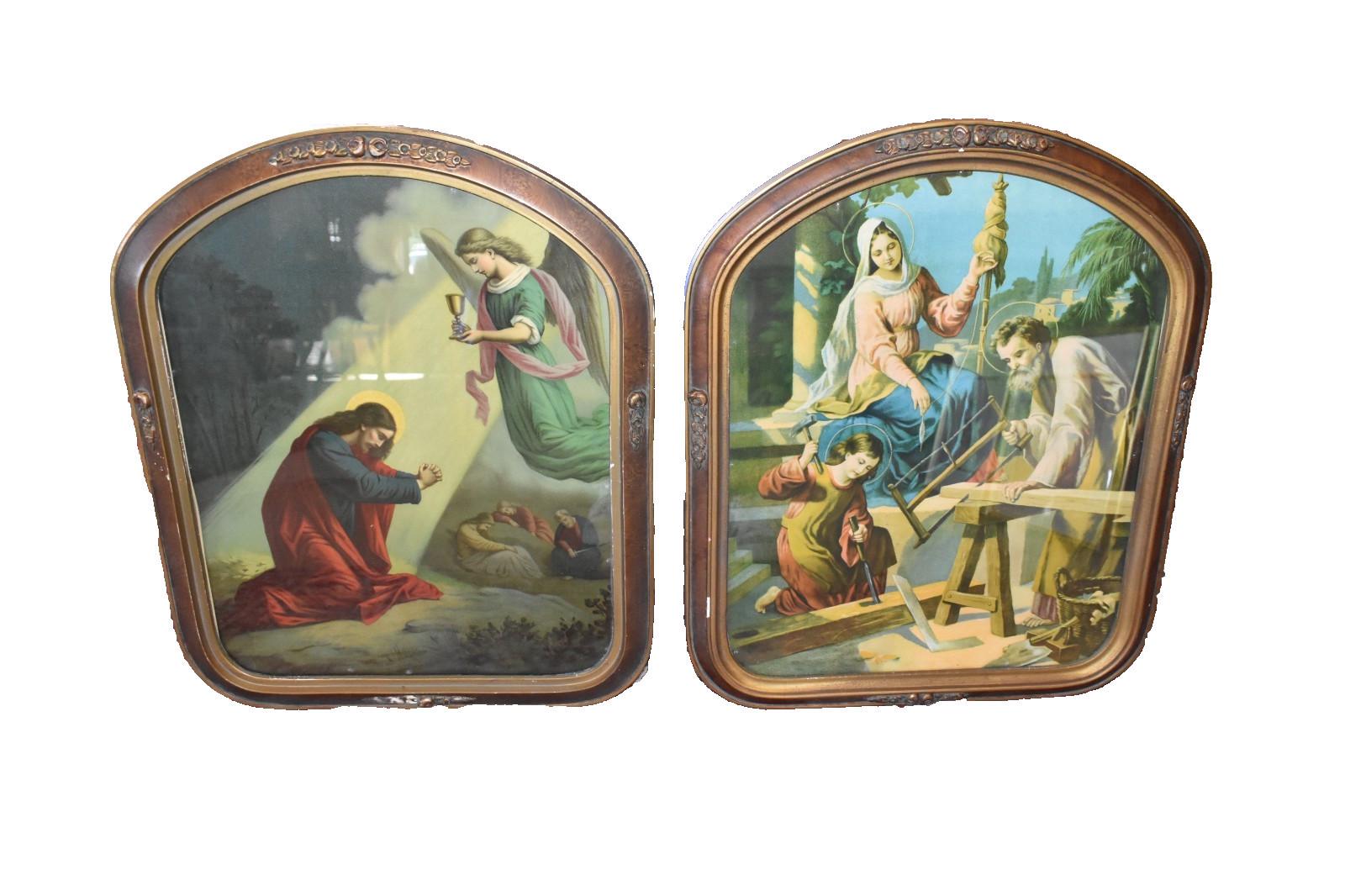 This is a beautiful pair of vintage framed religious lithograph prints, each set in matching arched wooden frames with raised floral accents. The artwork depicts:* Jesus with an angel in the Garden of Gethsemane (receiving the chalice).