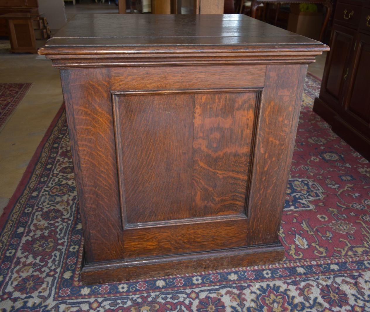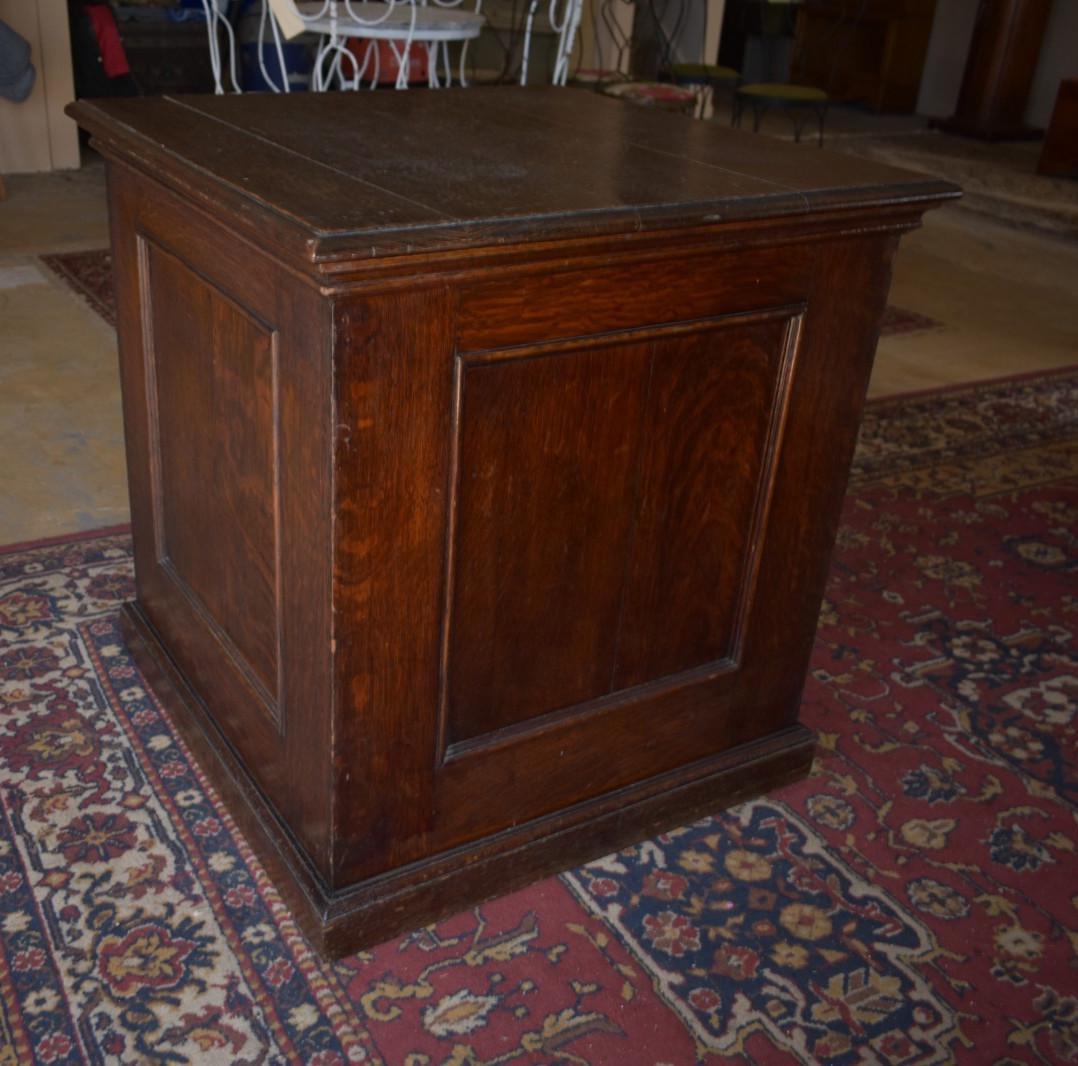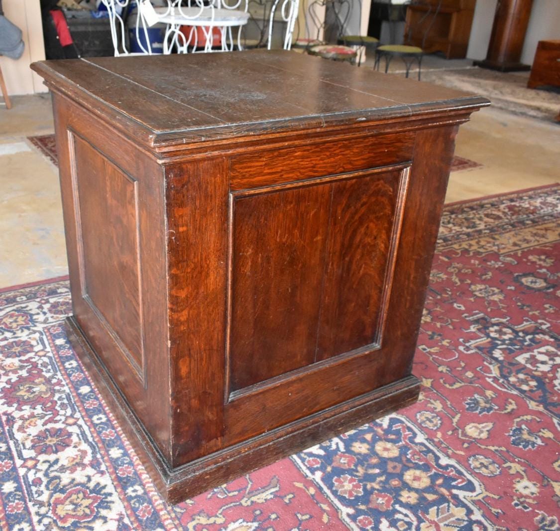 Offered is an antique solid oak stand or pedestal, dating to the late 19th to early 20th century (circa 1890–1910). The piece features raised paneled sides, a thick molded top, and a substantial base, giving it excellent presence and stability typical of period display furniture.