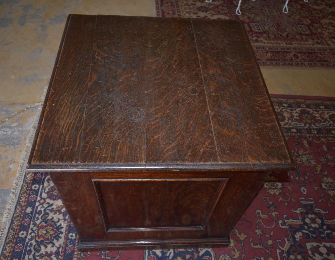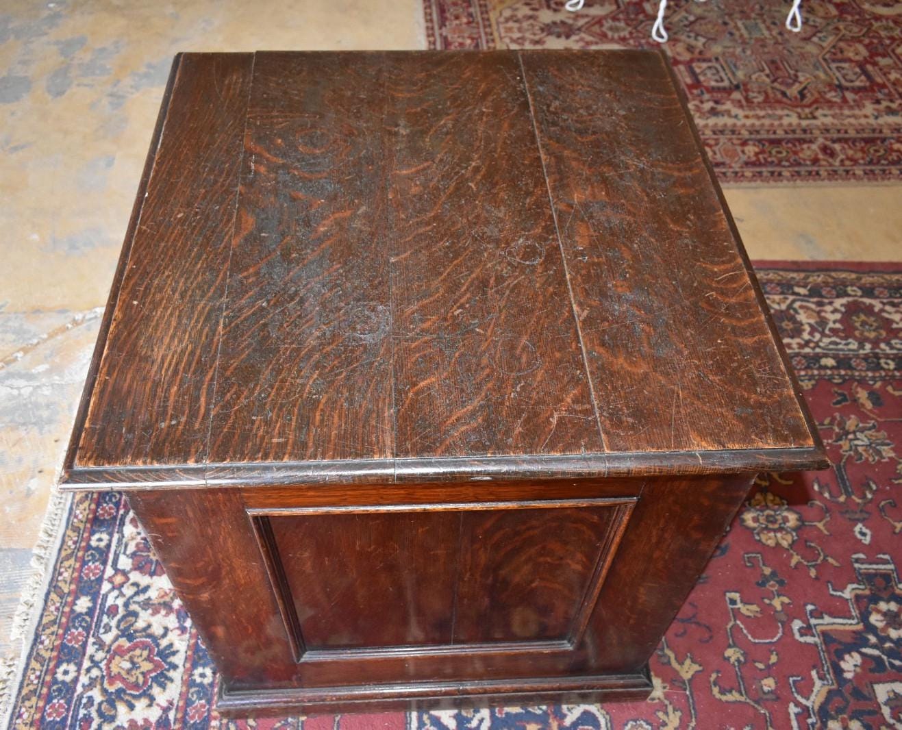 The oak shows a rich aged patina with honest wear consistent with age, including surface scratches, edge wear, and finish variation. These details reflect its authentic antique character.