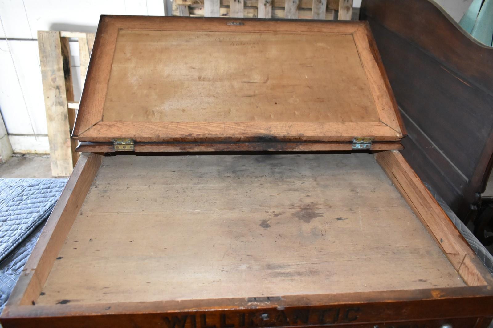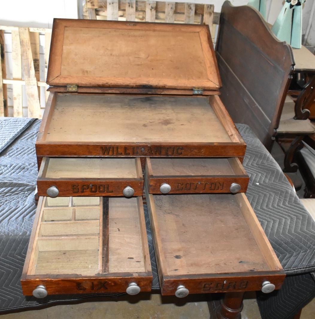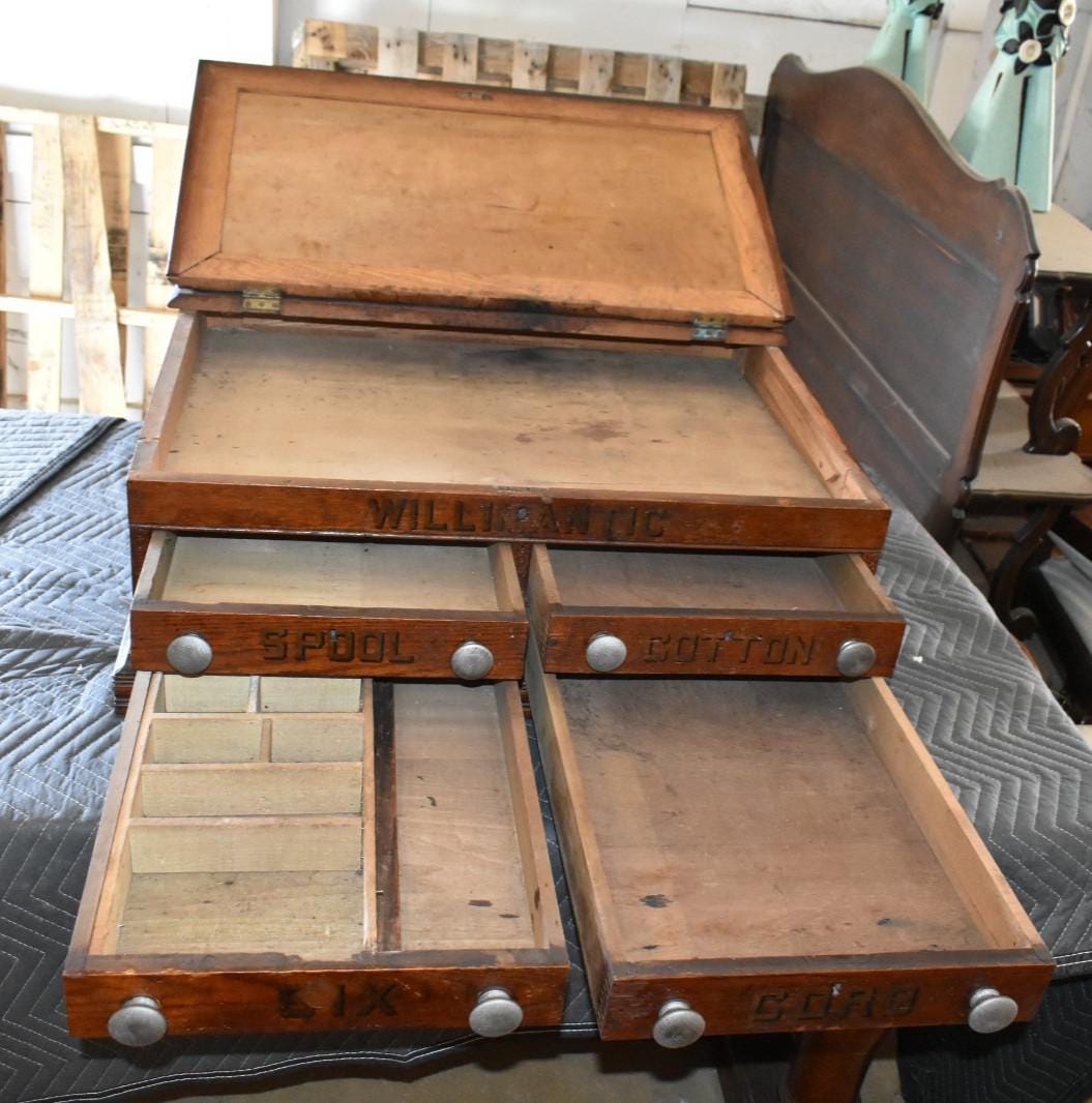 The front is stenciled “WILLIMANTIC,” referencing Willimantic, historically known as “Thread City,” one of the most important centers of thread and textile manufacturing in the United States during the late 19th century. This marking directly ties the cabinet to the American sewing and textile trade.