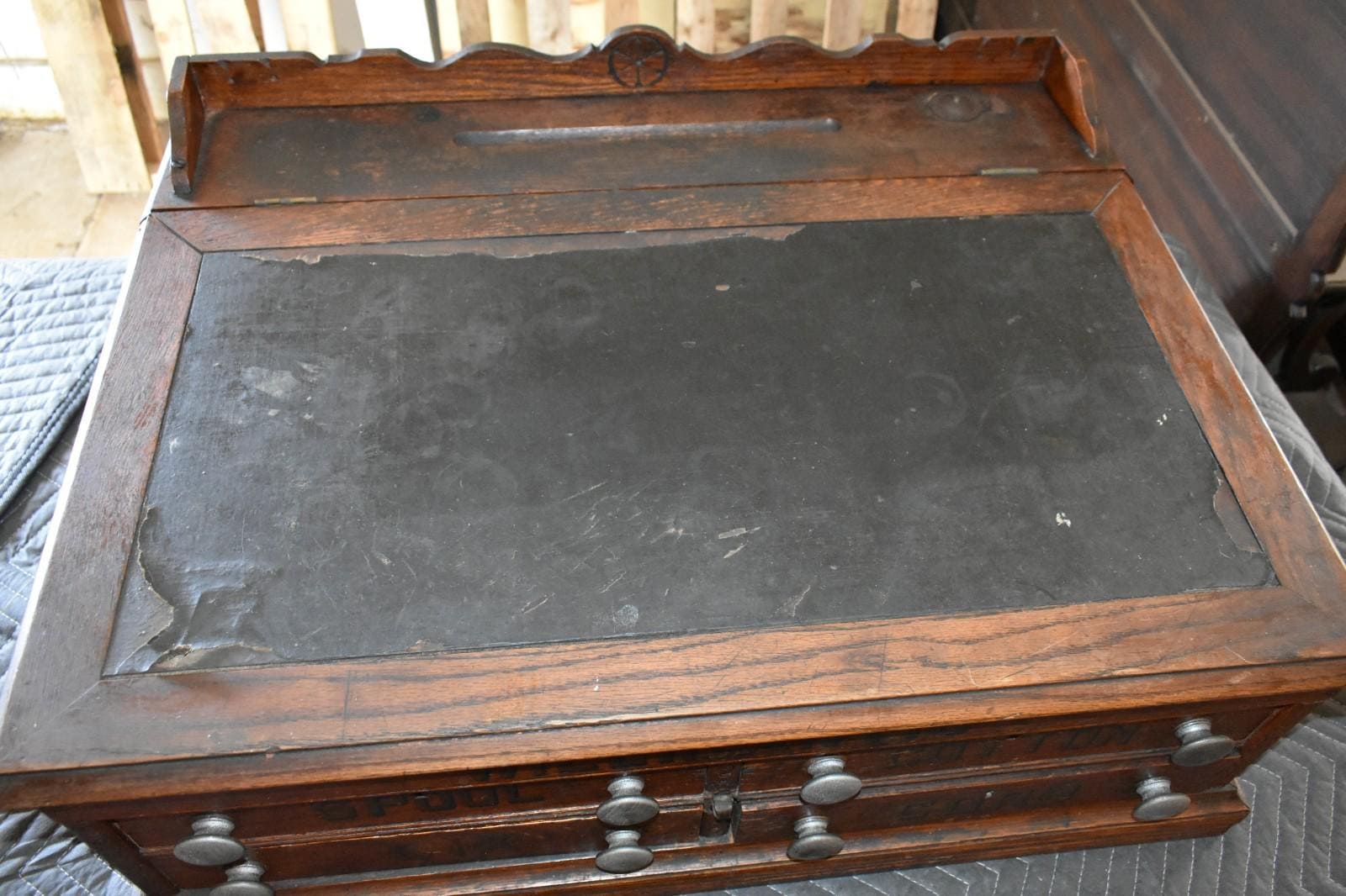 The cabinet features clearly labeled drawers reading SPOOL, COTTON, SIX, and CORD, along with interior dividers designed specifically for thread spools and small sewing supplies. The slanted top retains its original leather writing surface, showing age-appropriate wear, and includes an integrated ink well with hinged metal cover, confirming its use as a working writing and order desk.