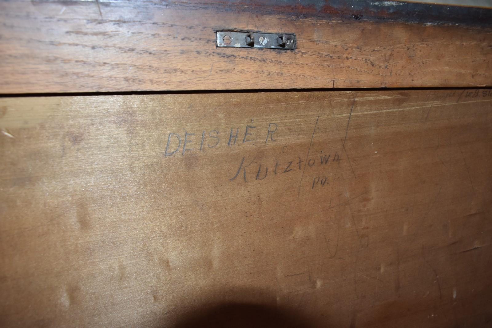 The cabinet bears a handwritten inscription reading Deisher, Kutztown, PA, likely identifying the original owner or business location. Given the cabinet’s design and labeled drawers, it was most likely used in a dry goods, sewing, or tailoring environment in the Kutztown area.