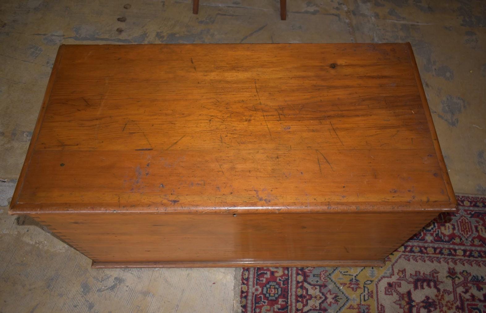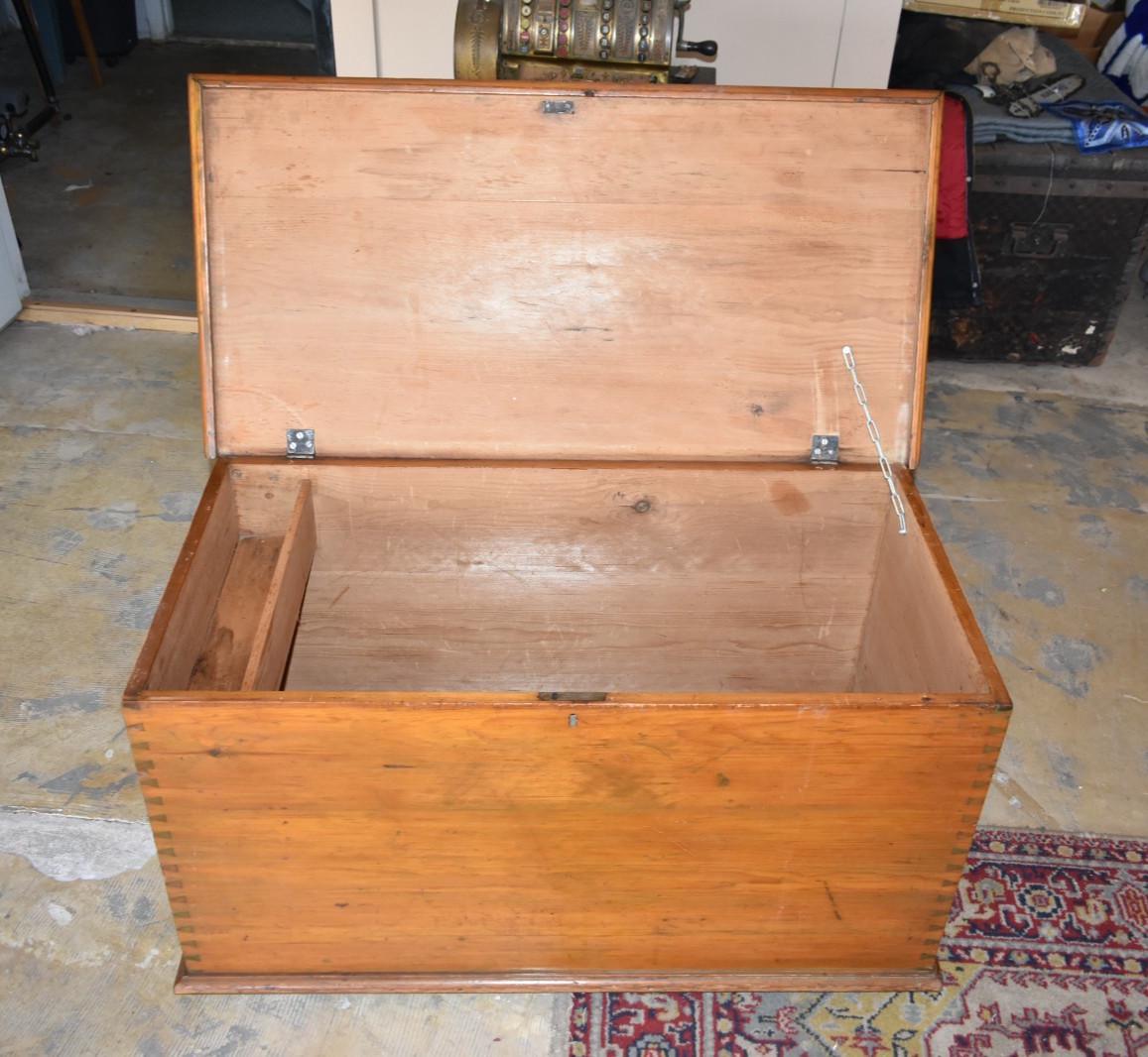 Antique wooden blanket chest / storage trunk featuring traditional dovetail construction and a hinged lift-top lid. The interior includes a built-in storage till, typical of 19th-century American utility chests used for blankets, linens, or household storage.
