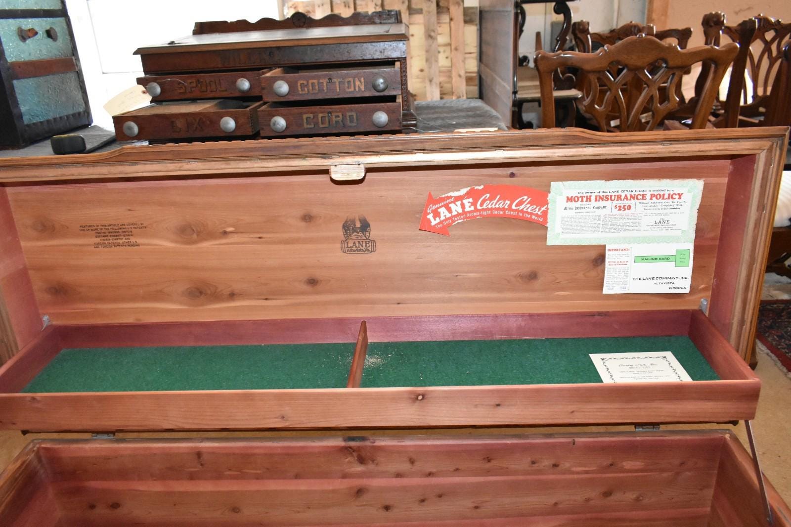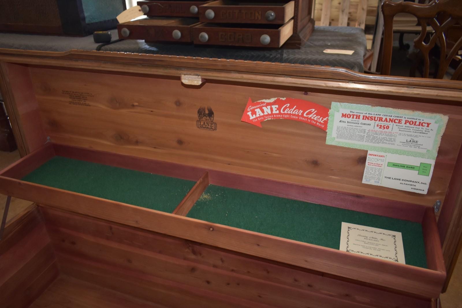 * Interior: Original Lane labels, stamps, and paperwork present