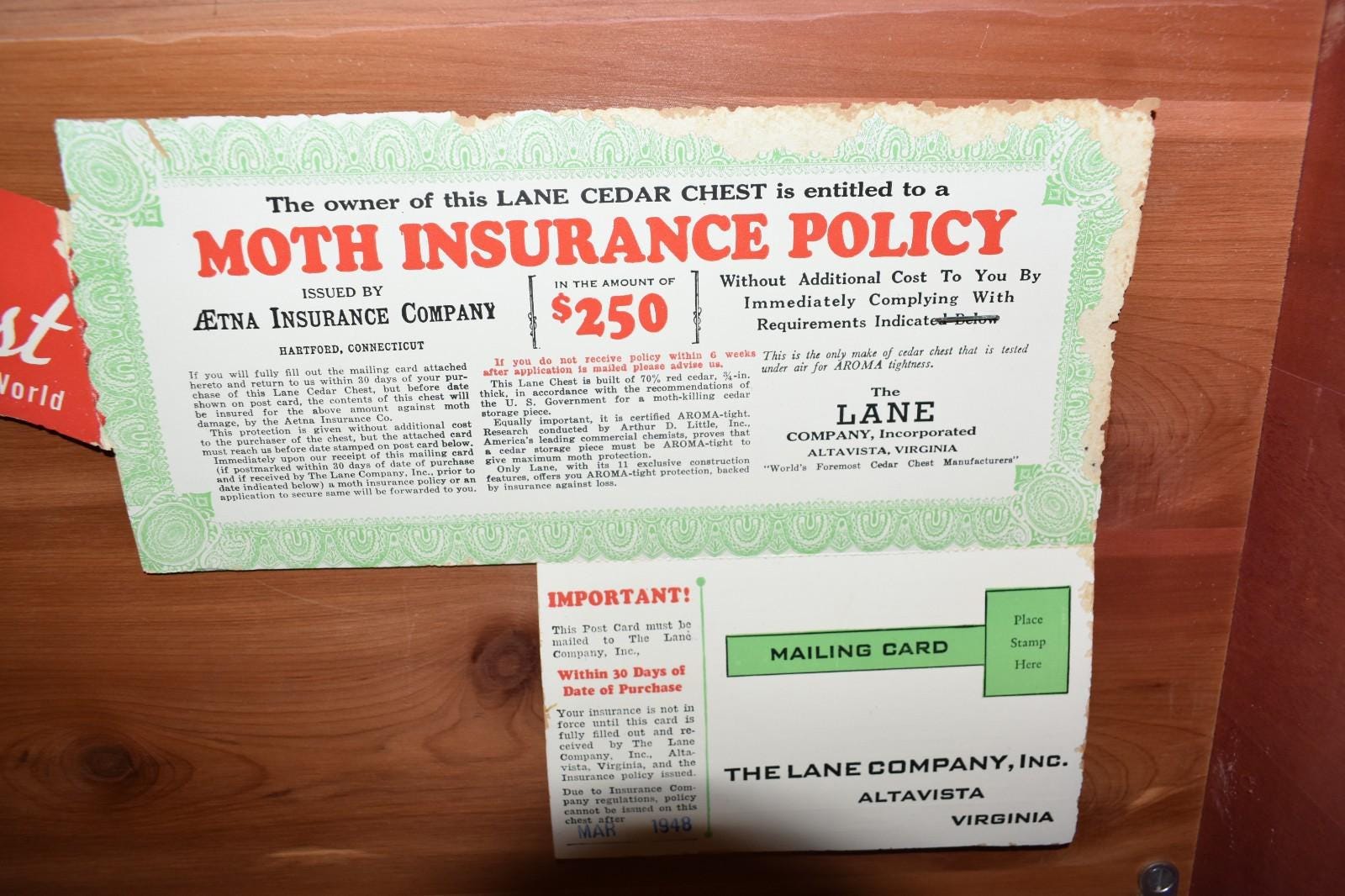 Striking vintage Art Deco / Waterfall–style cedar chest by the Lane Company, made in Altavista, Virginia, and retaining its original interior labels, stamps, and paperwork, including Lane’s iconic “Moth Insurance Policy.”