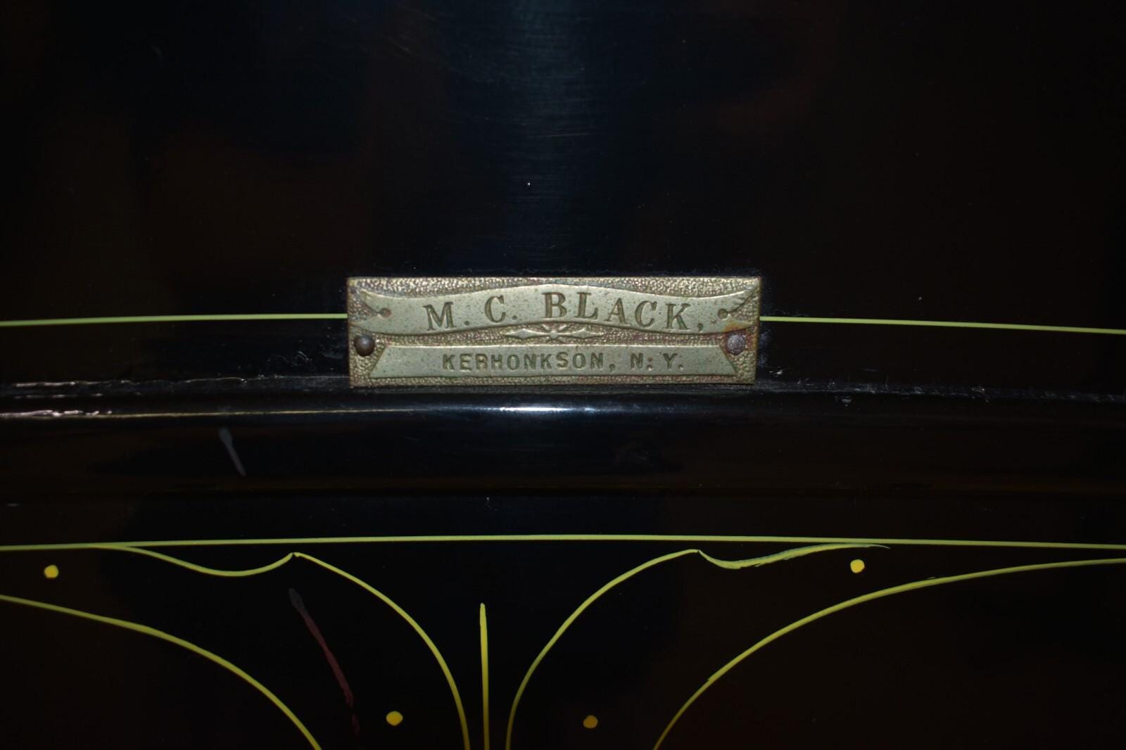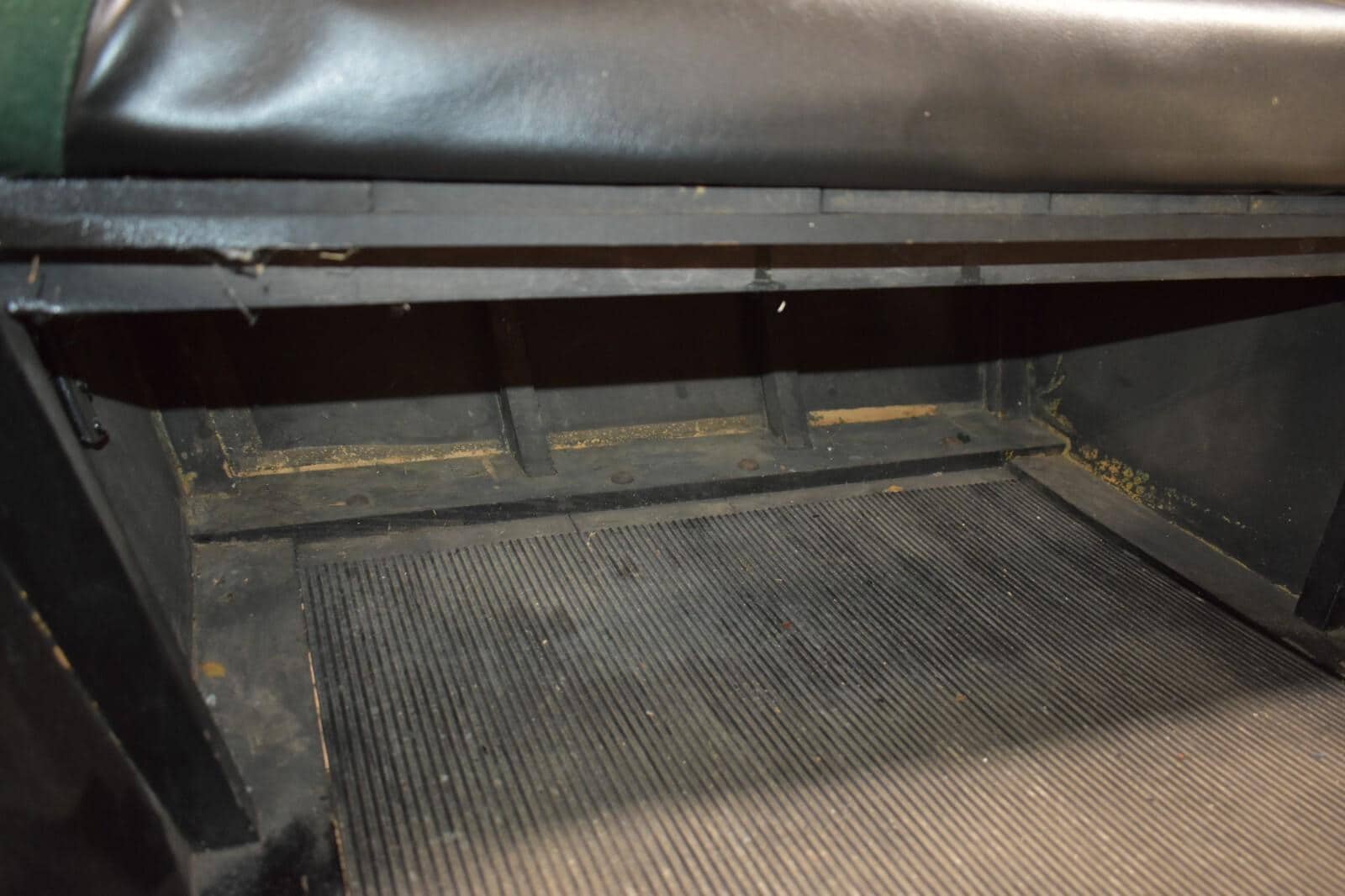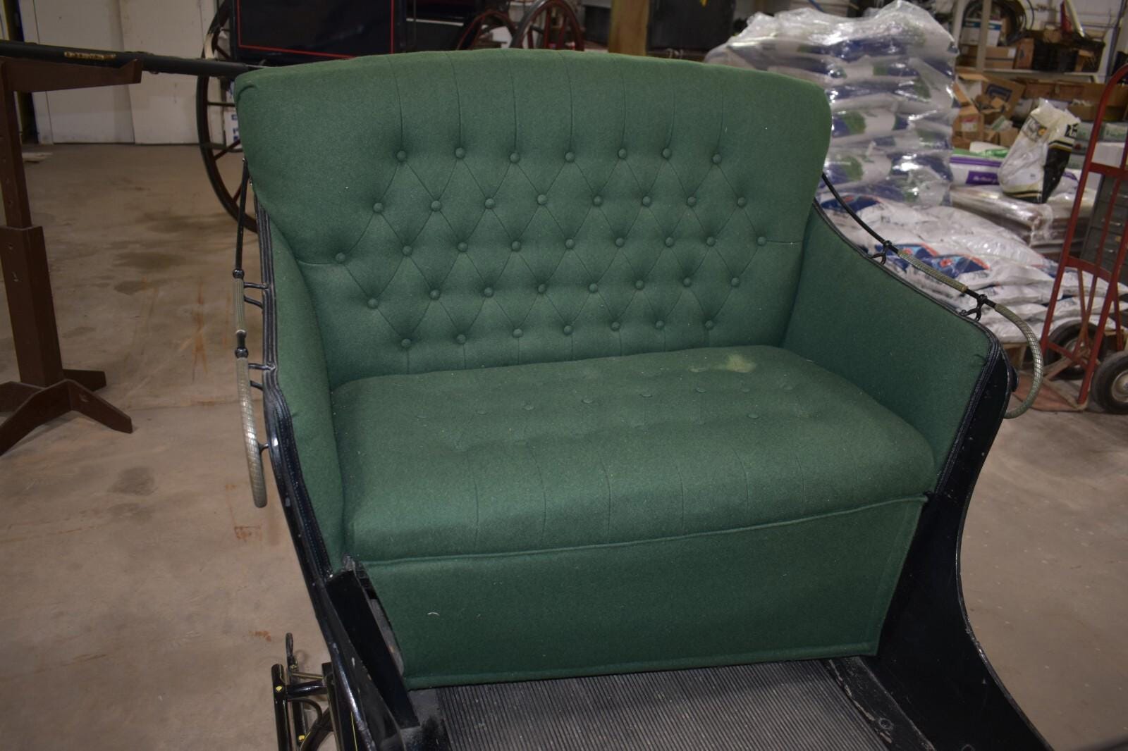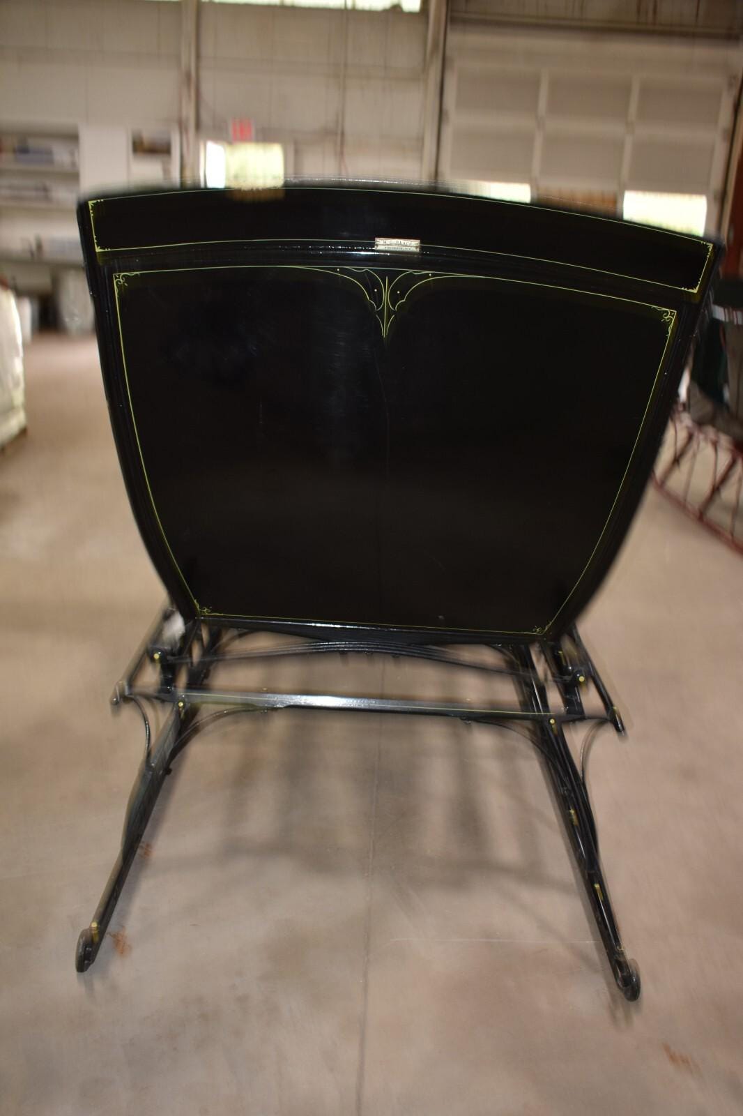 Black body with yellow striping. Rein rail. hand rails, side steps. whip holder, eagle heads on the dash. Green tufted upholstery. Rubber floor mats.
