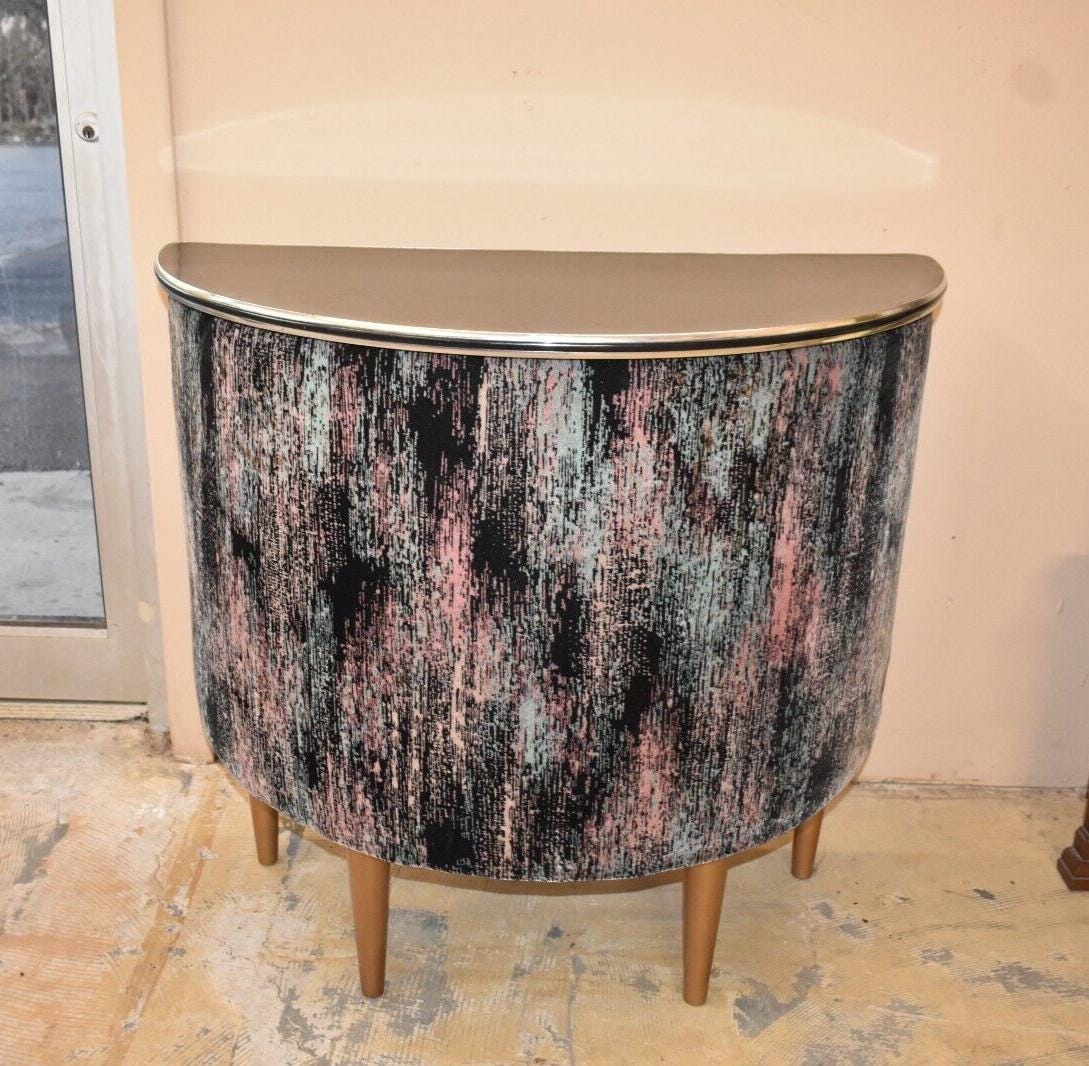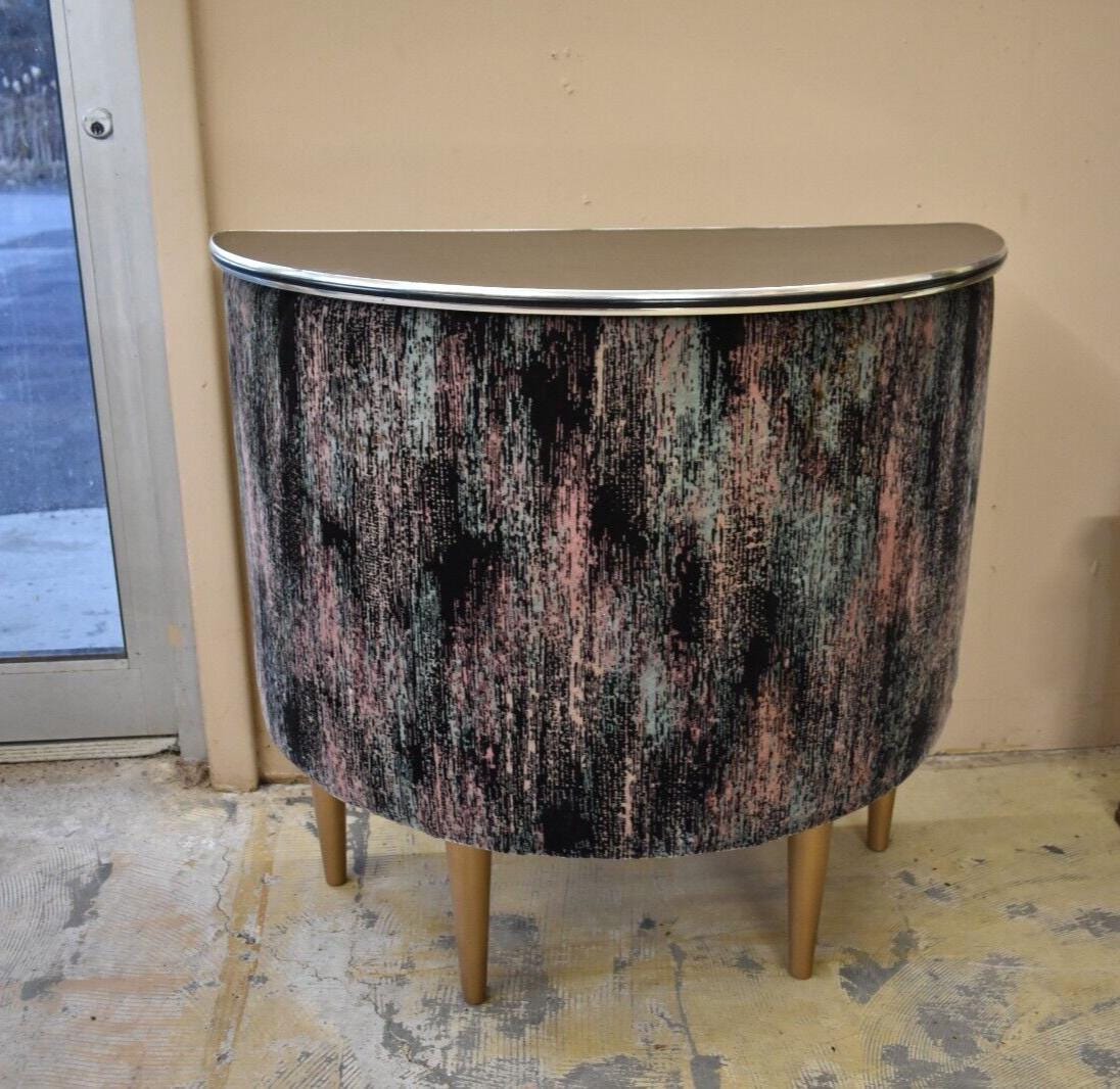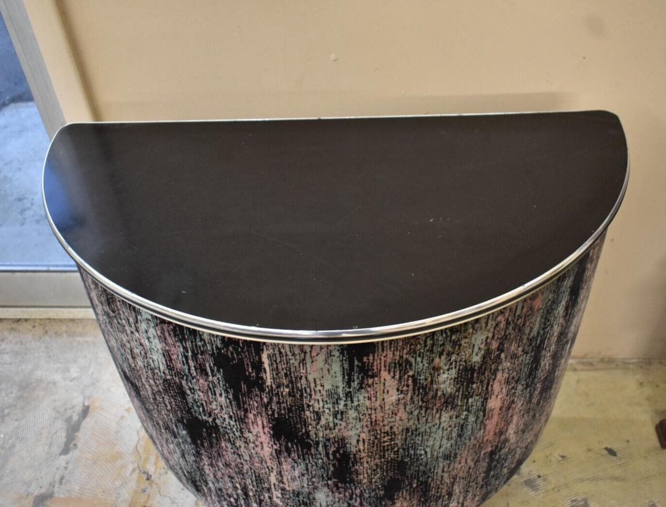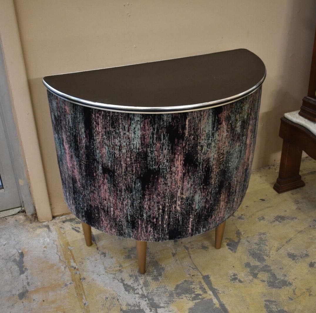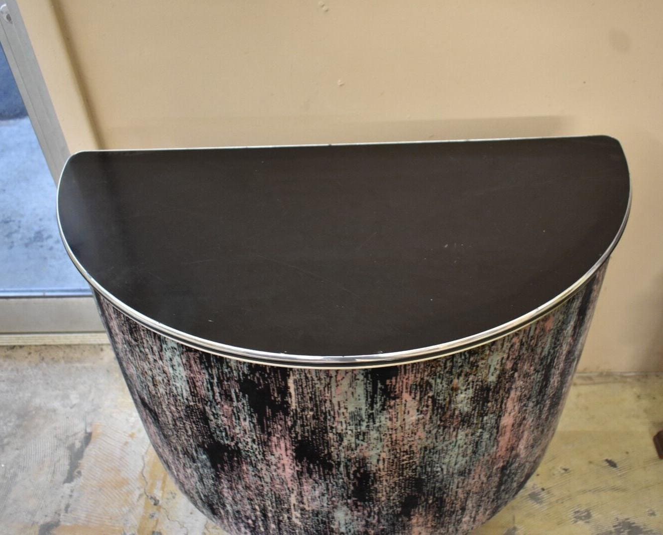 Vintage Mid Century Demilune Table with black laminate top and upholstered sides, and chrome trim.