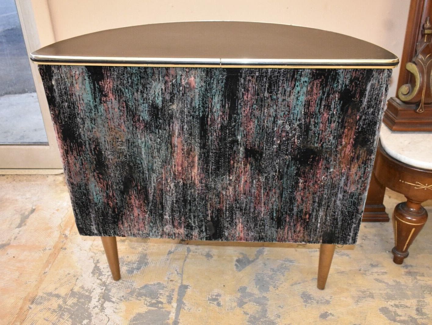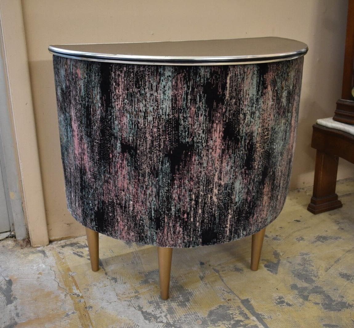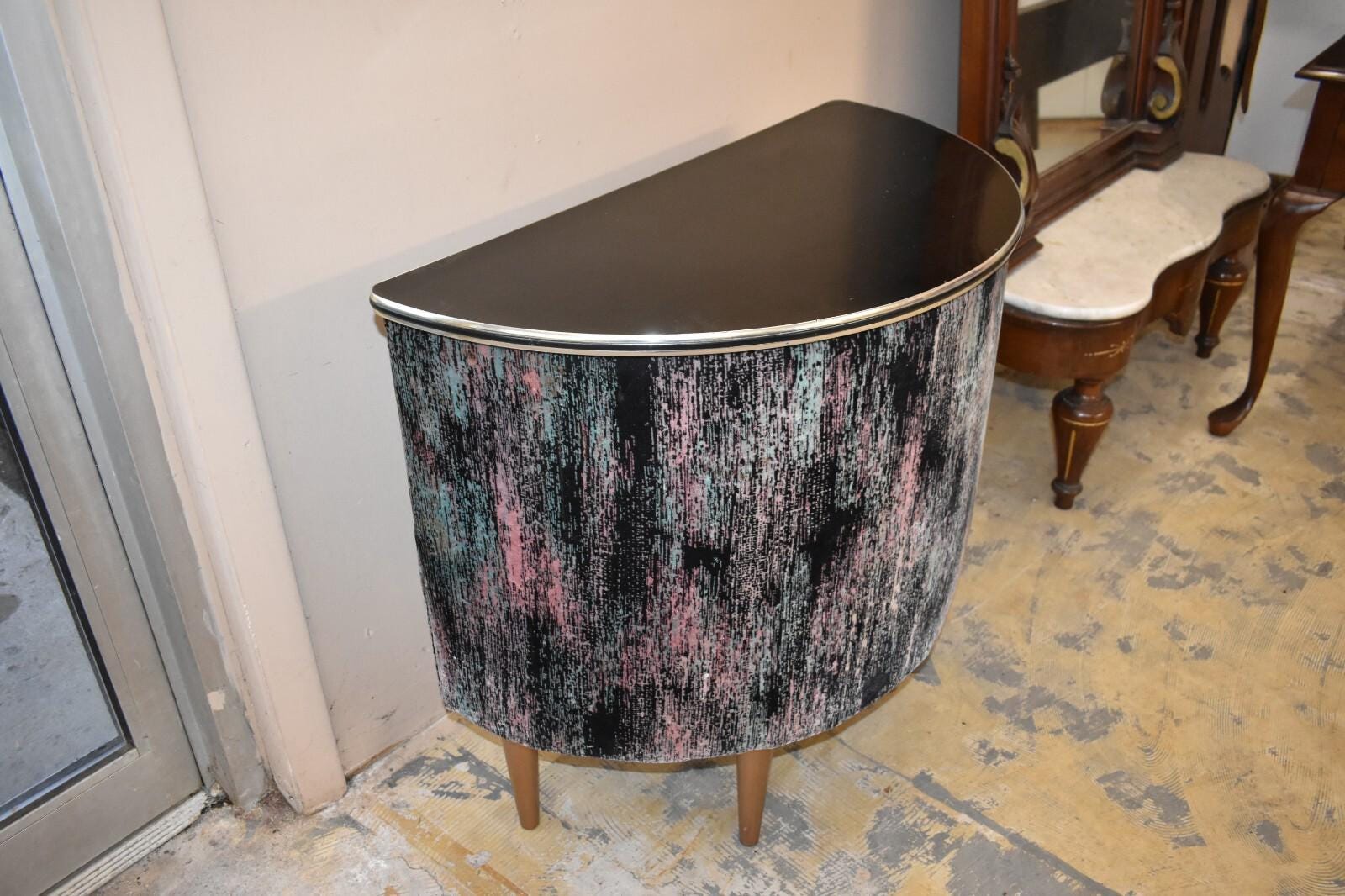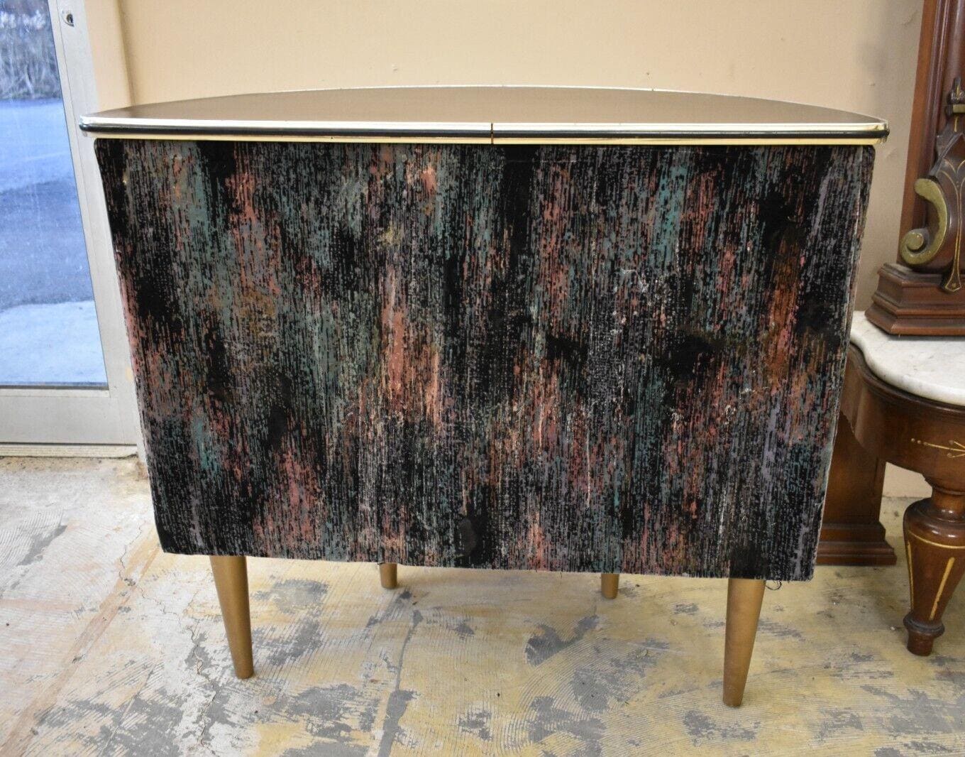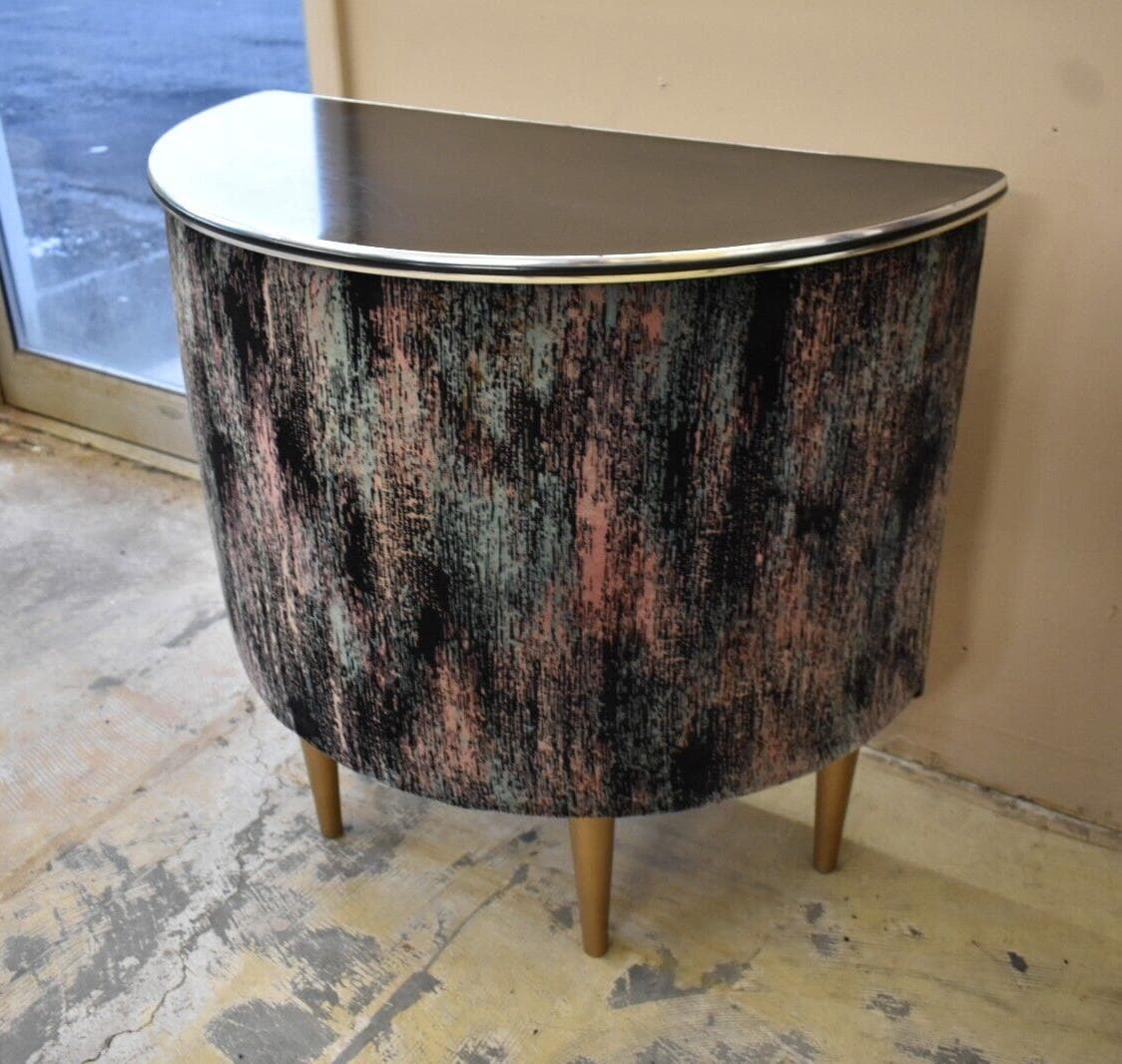 Vintage Mid Century Demilune Table with black laminate top and upholstered sides, and chrome trim.