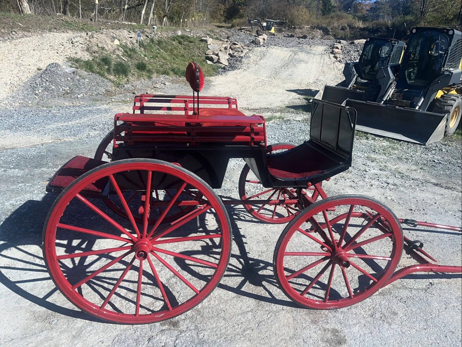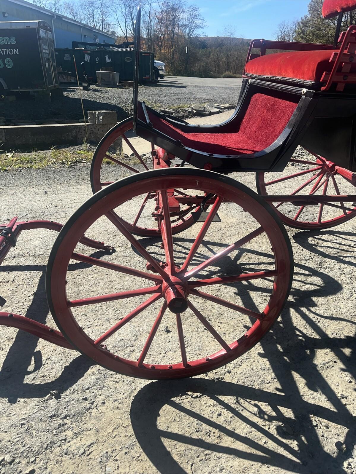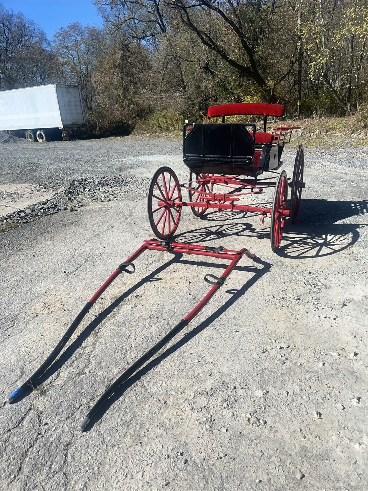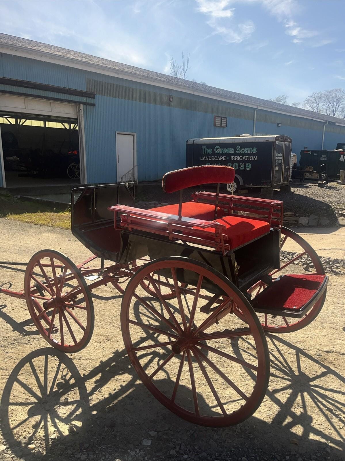 Black body with red running gear shafts with black striping. Patent leather dash. Red upholstery with maroon floor mats. Sturdy well built. New rubber on wheels. Also has a new whip holder. Side rear steps.