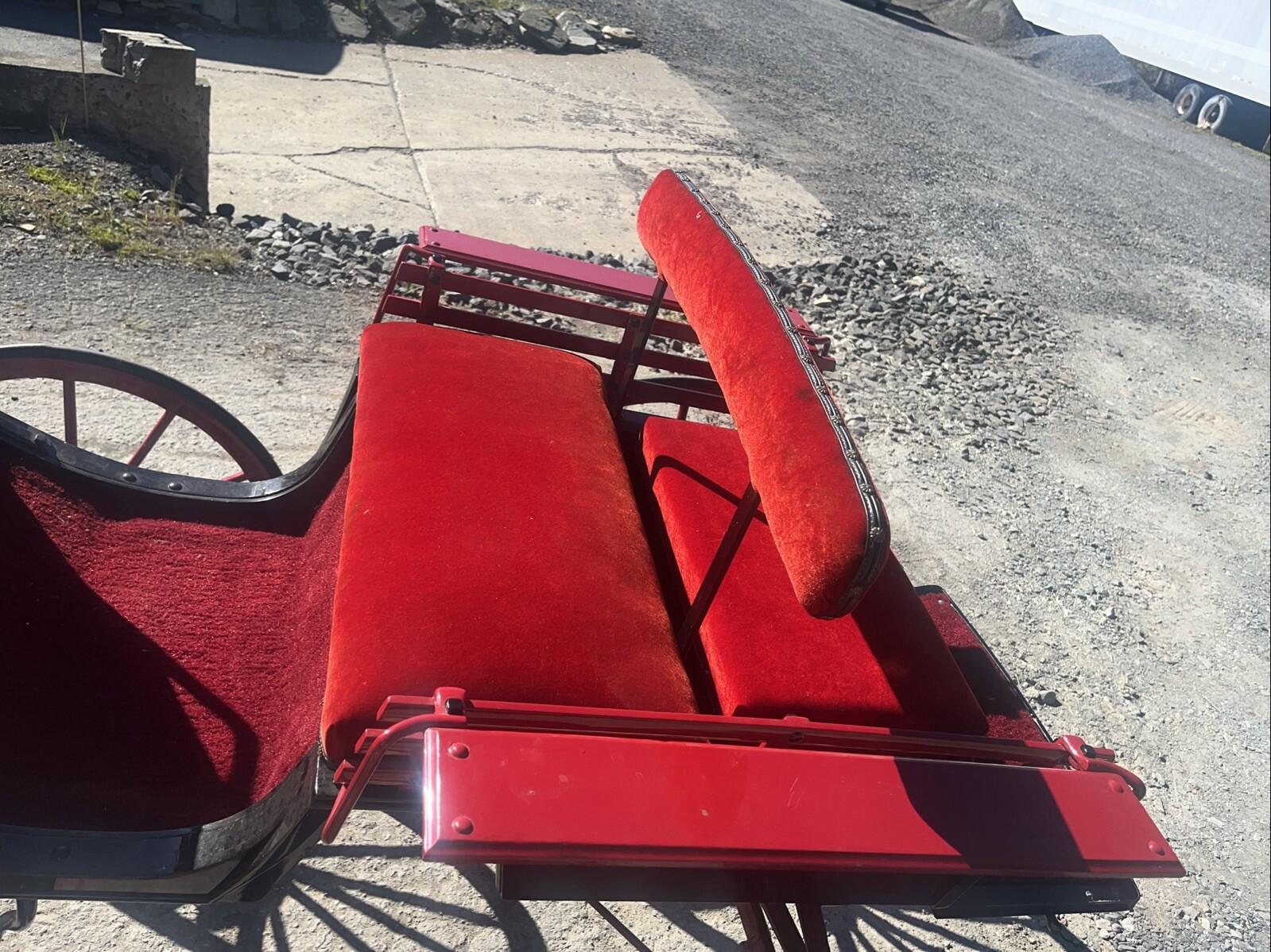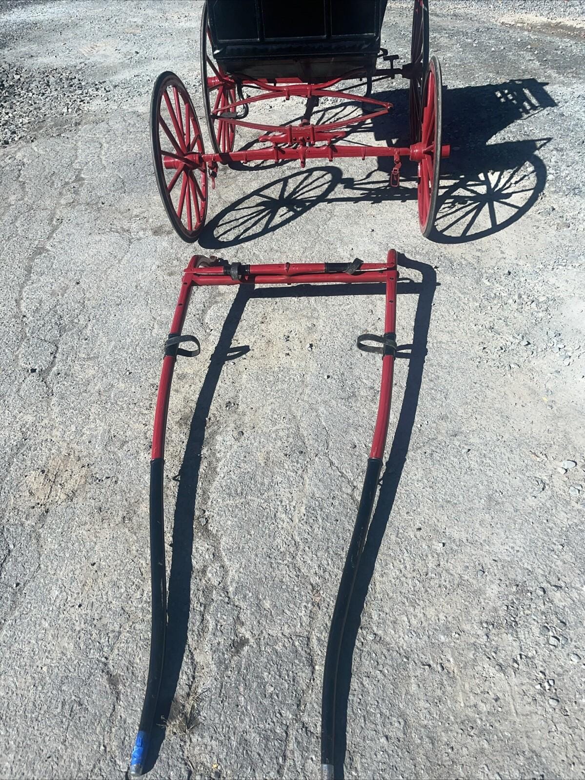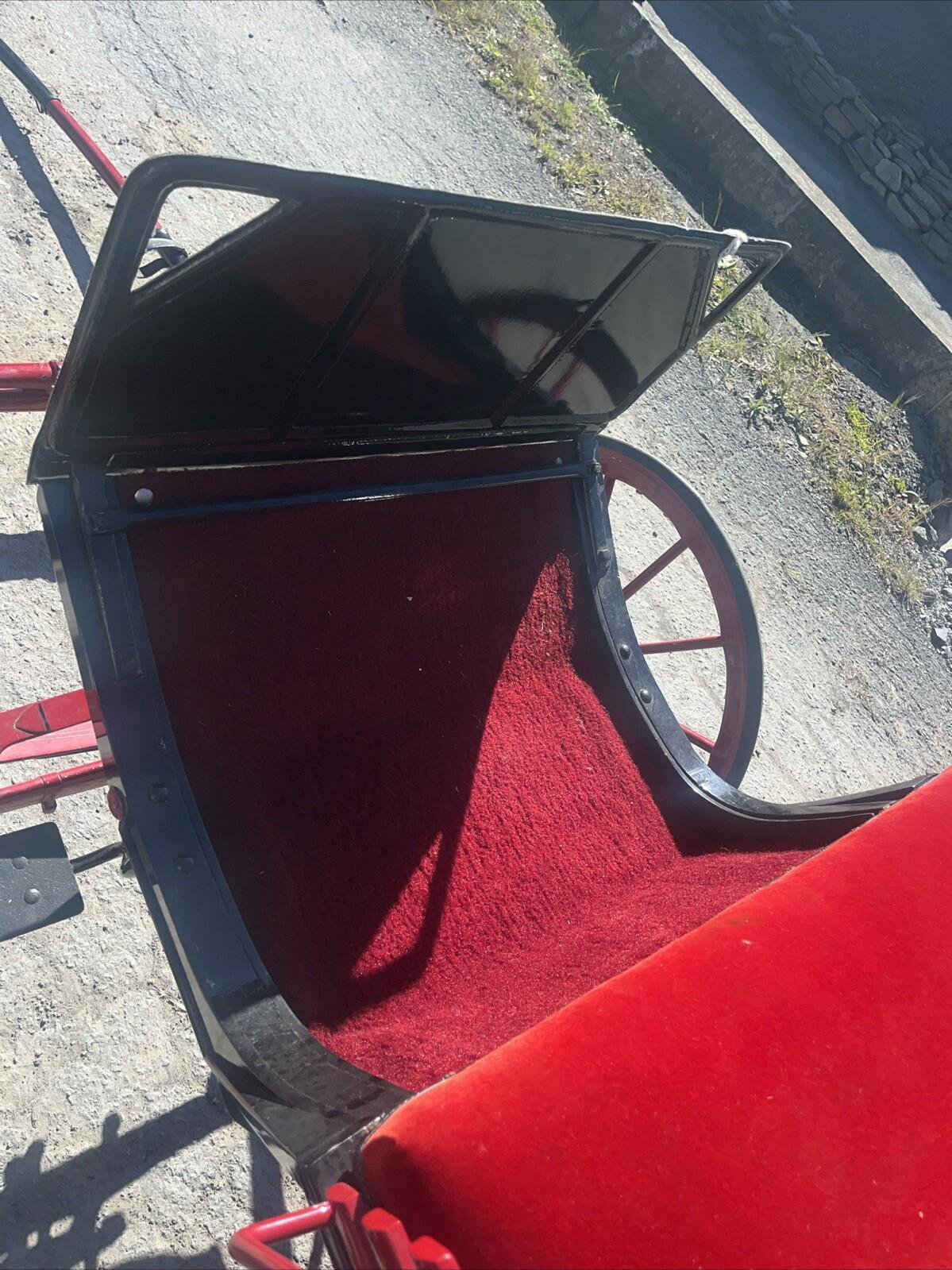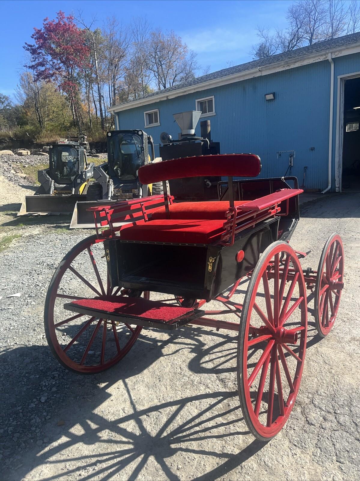 Black body with red running gear shafts with black striping. Patent leather dash. Red upholstery with maroon floor mats. Sturdy well built. New rubber on wheels. Also has a new whip holder. Side rear steps.