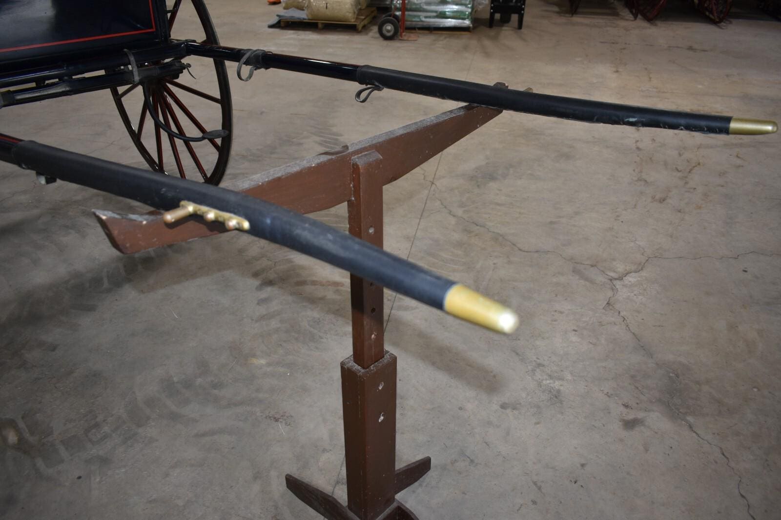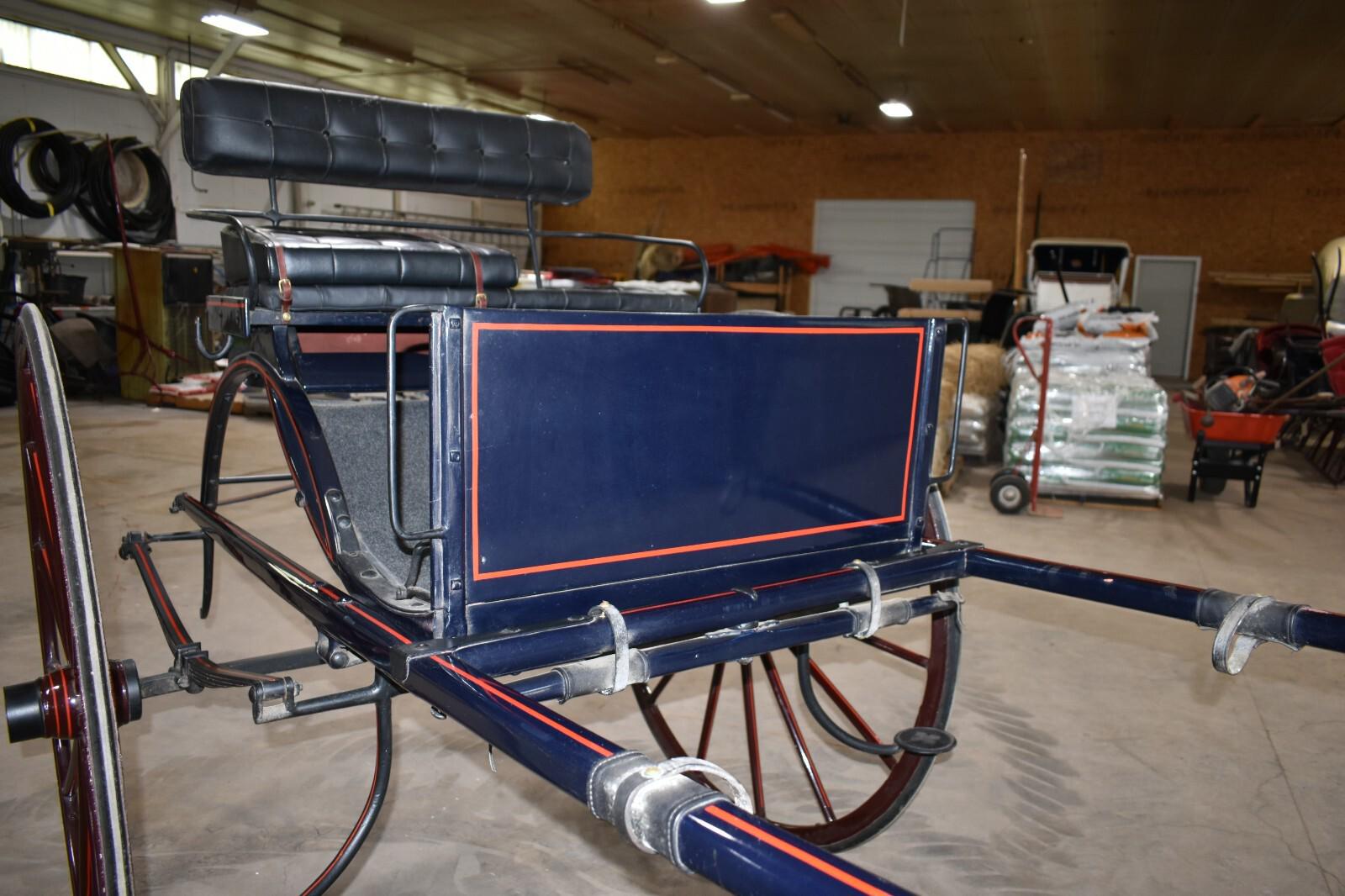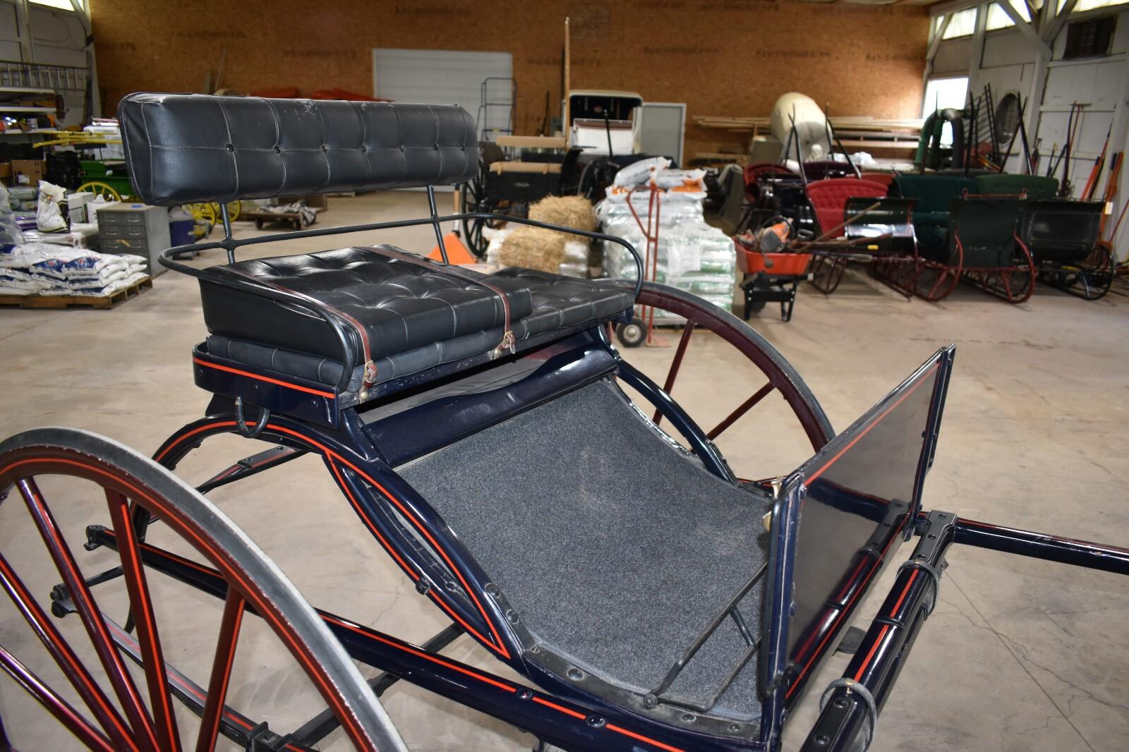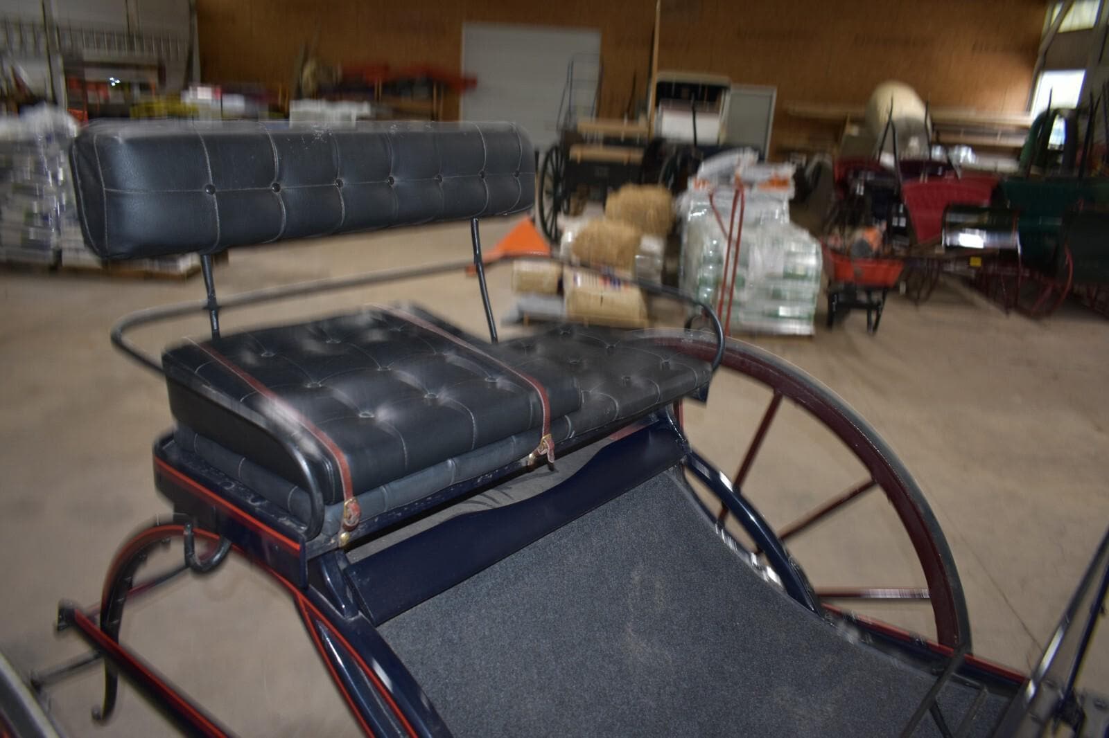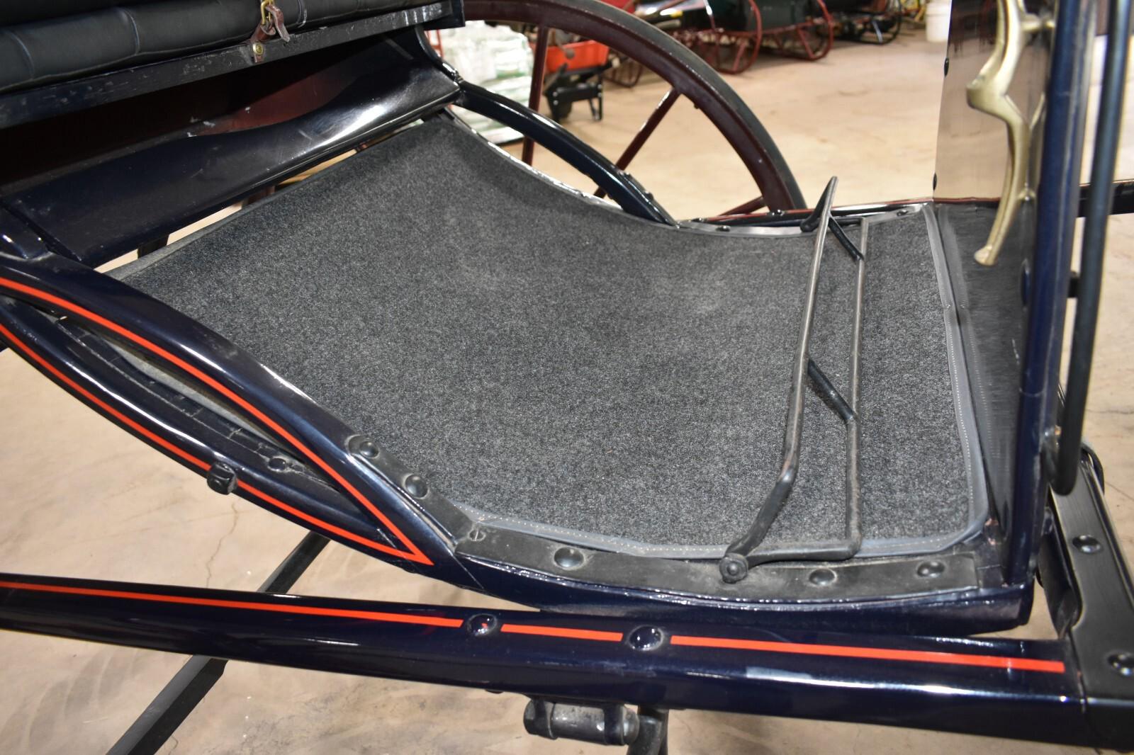Dark Blue body with red striping and black tufted upholstery with black floor mat.