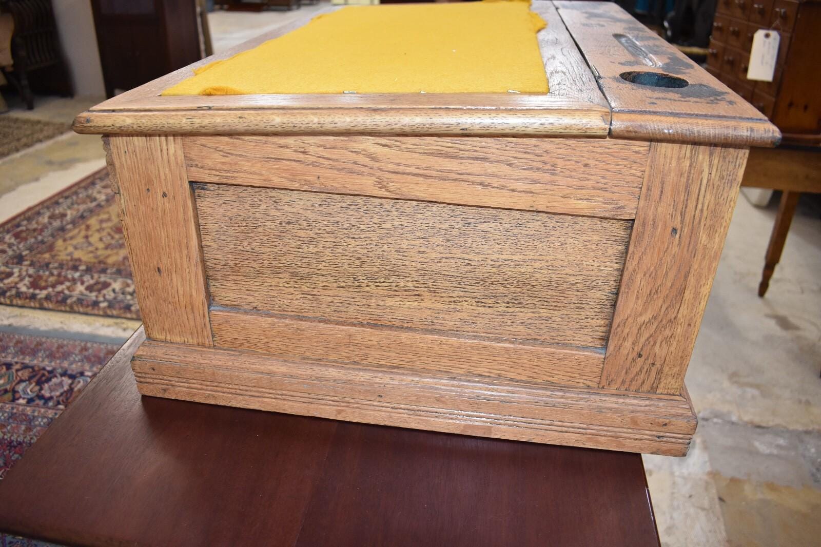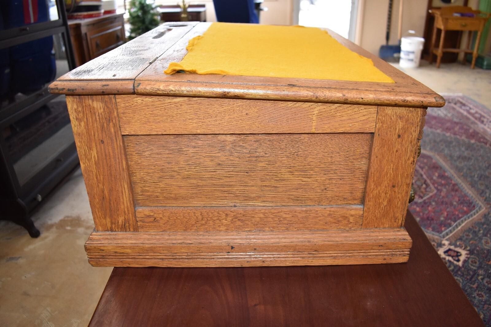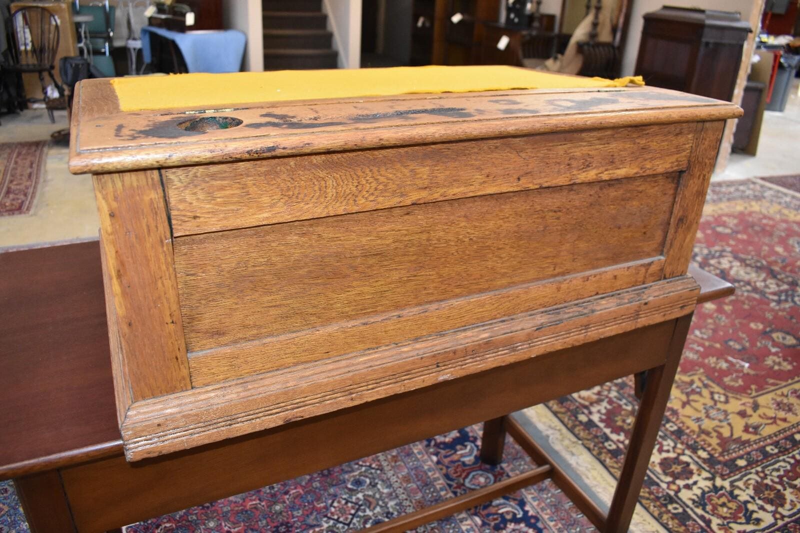 Condition: overall very good condition for age, with marks including scratches, etc that are normal for age/use. Staining to the top. Solid well made piece. Probably was refinished at some point.