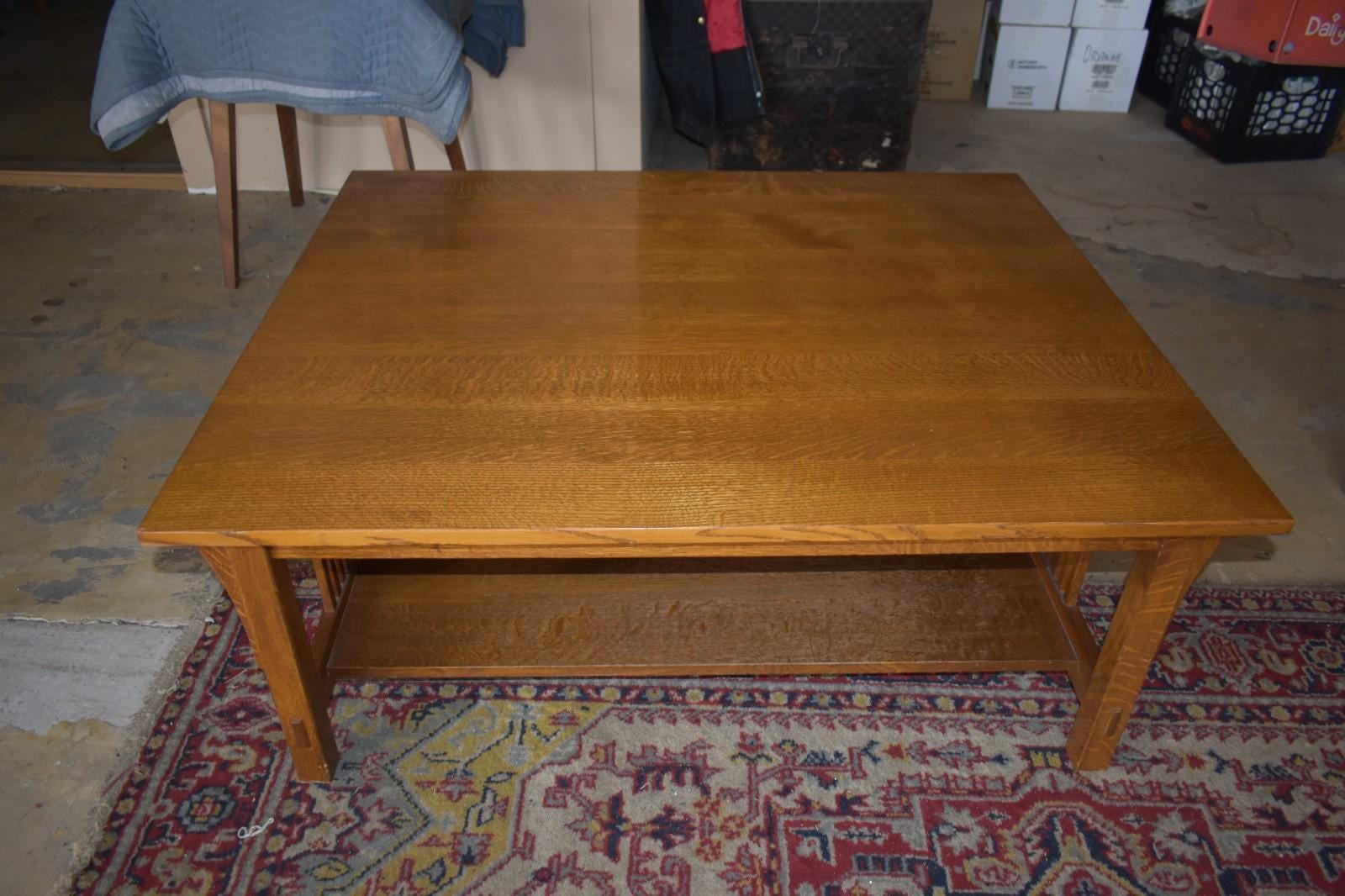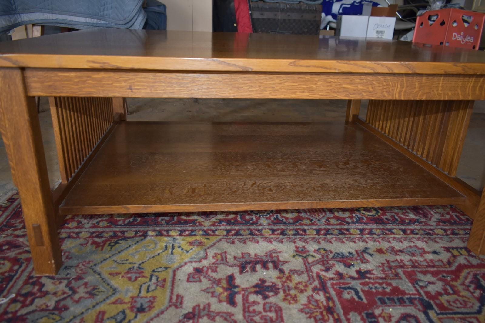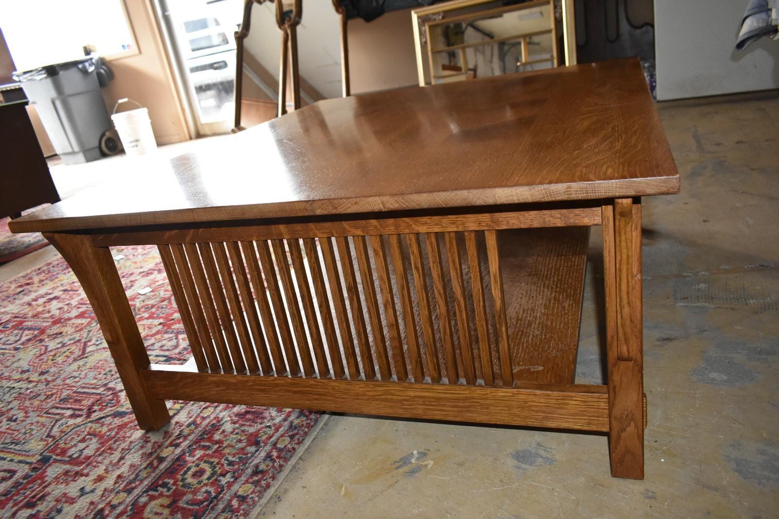 The table showcases strong vertical slat sides, thick square legs with through-tenon style details, and a substantial lower shelf. The oak grain is especially attractive across the top and shelf.