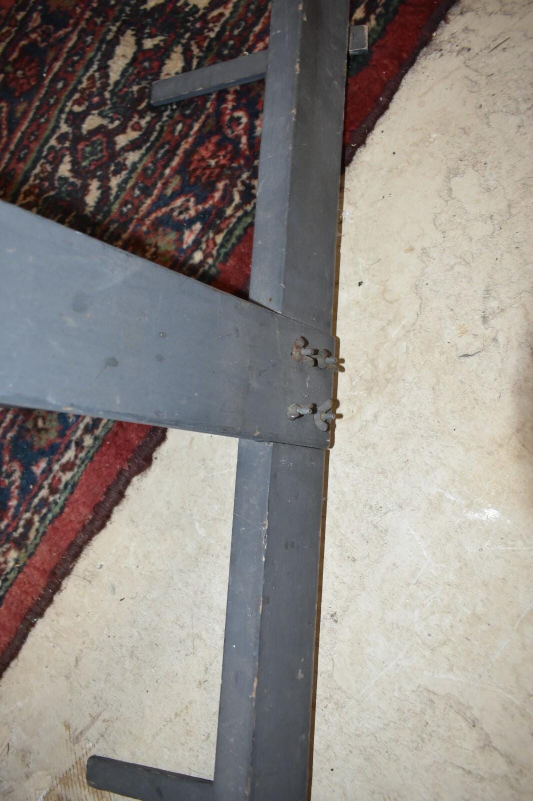 Wood easel frame painted grey with metal hardware.