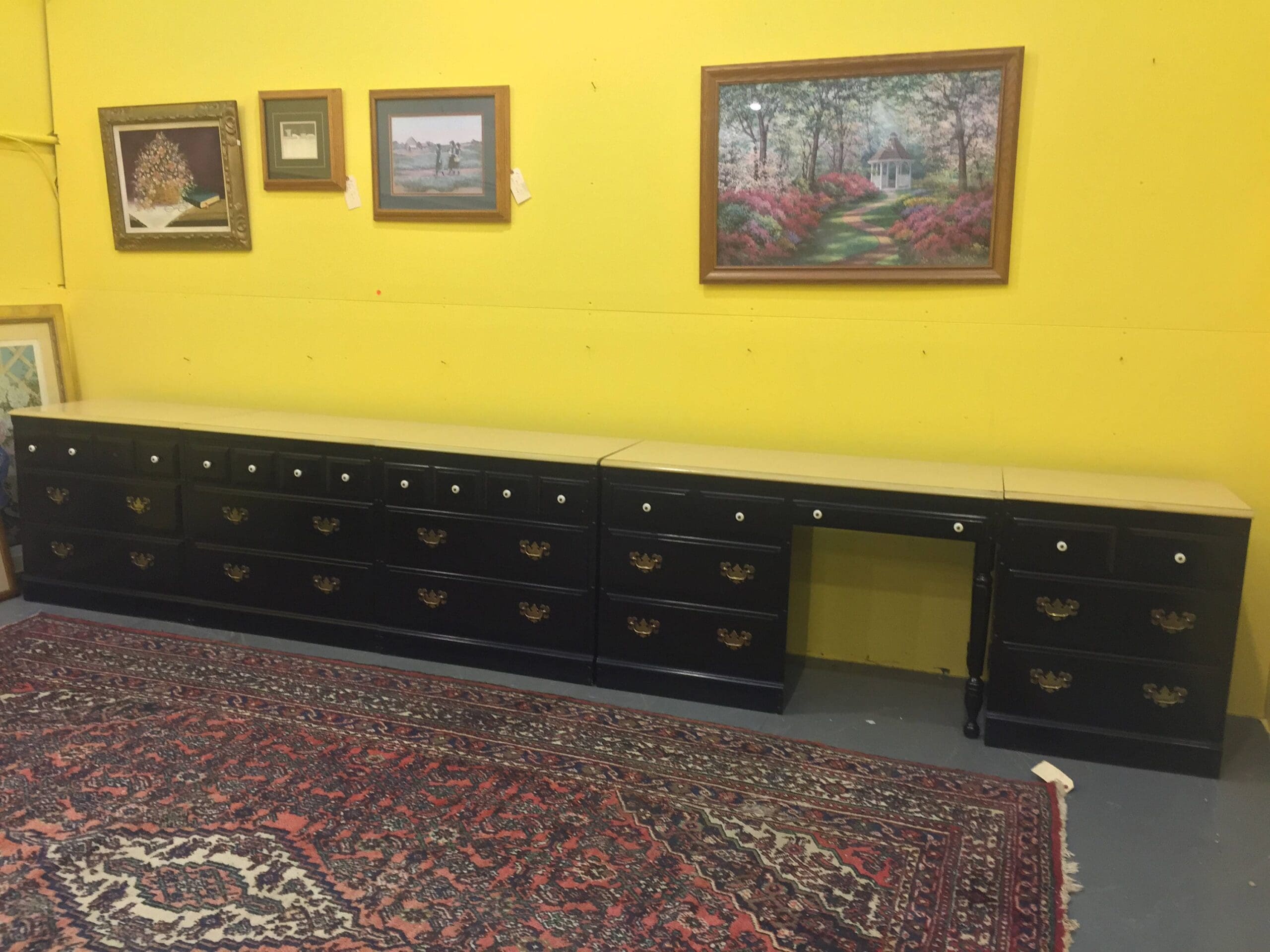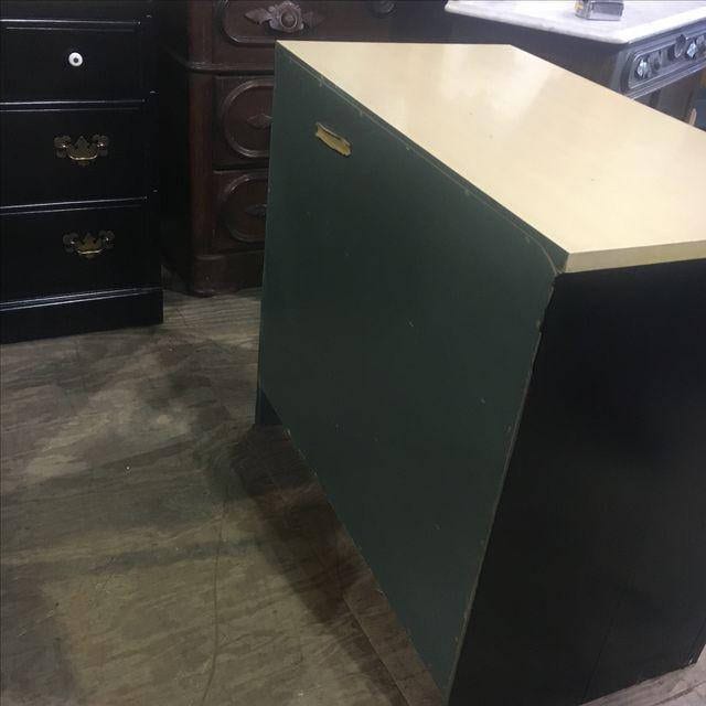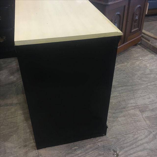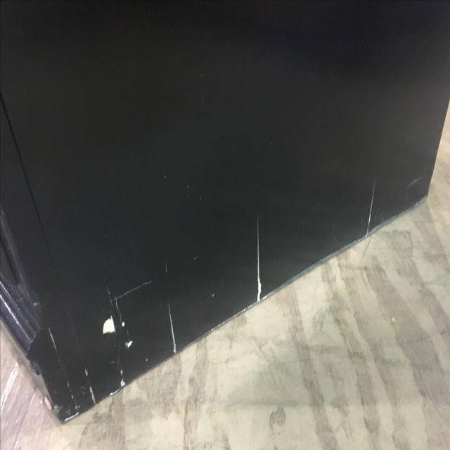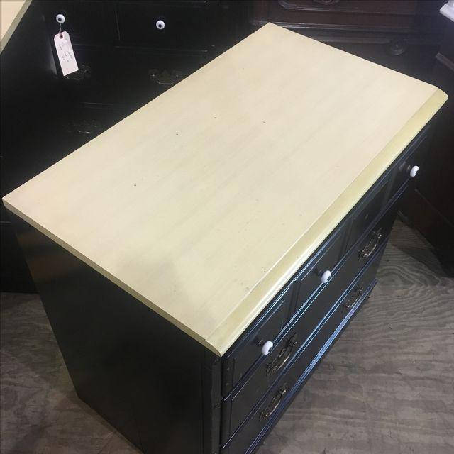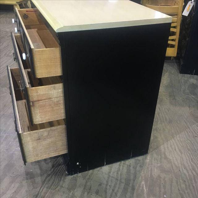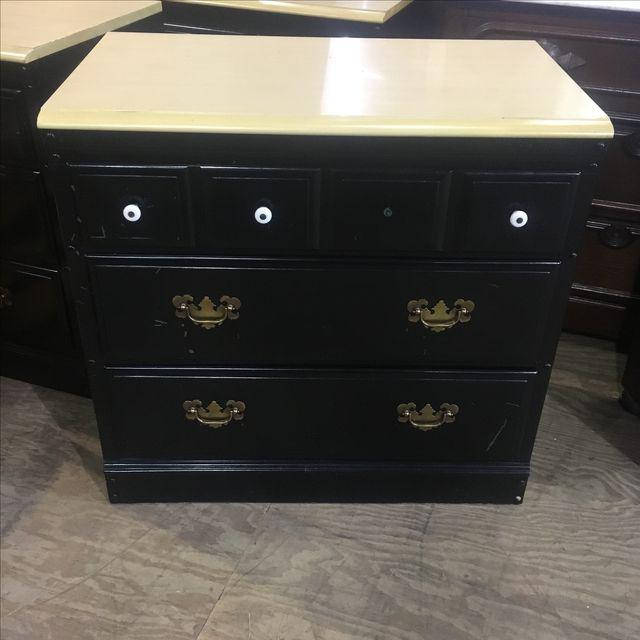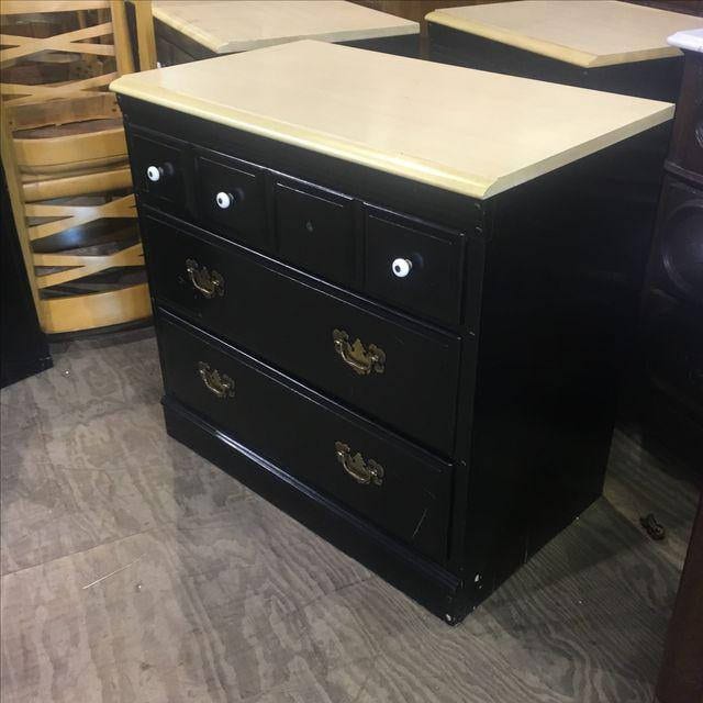 Part of a matching 4 piece set. Painted black. Missing one knob. Laminate top. Marks from use. Some splitting to the sides as photographed.