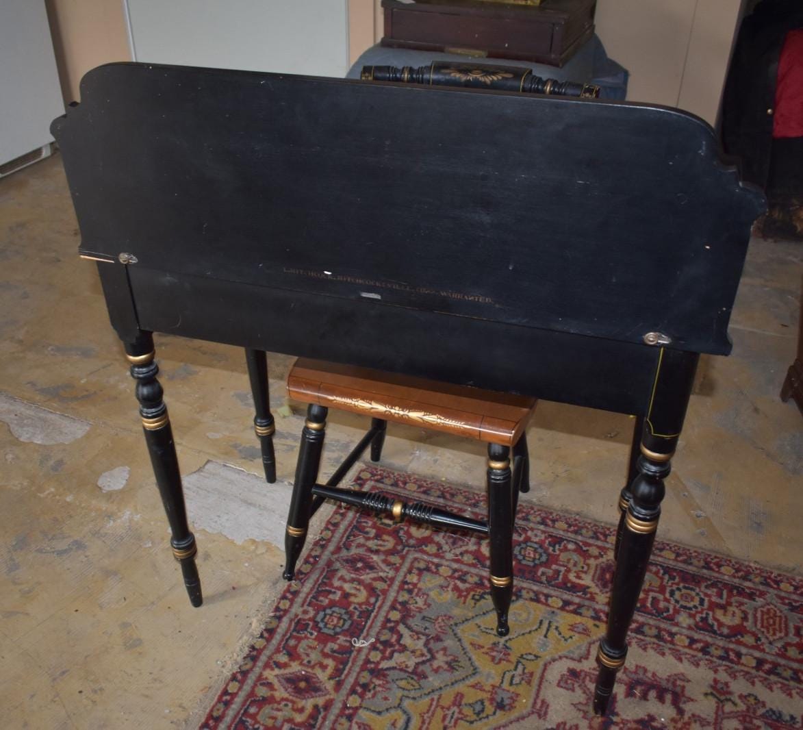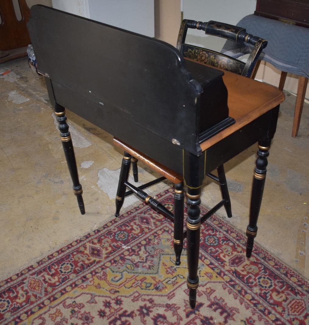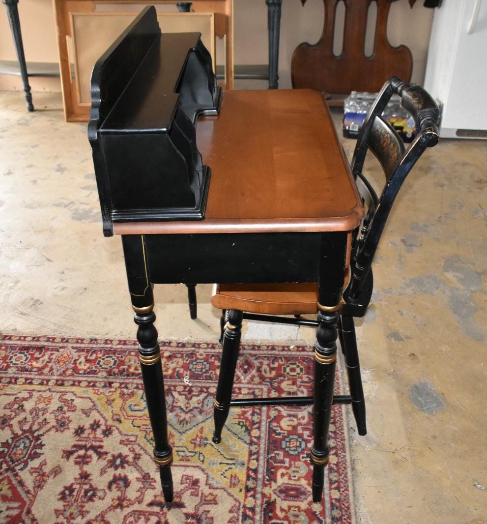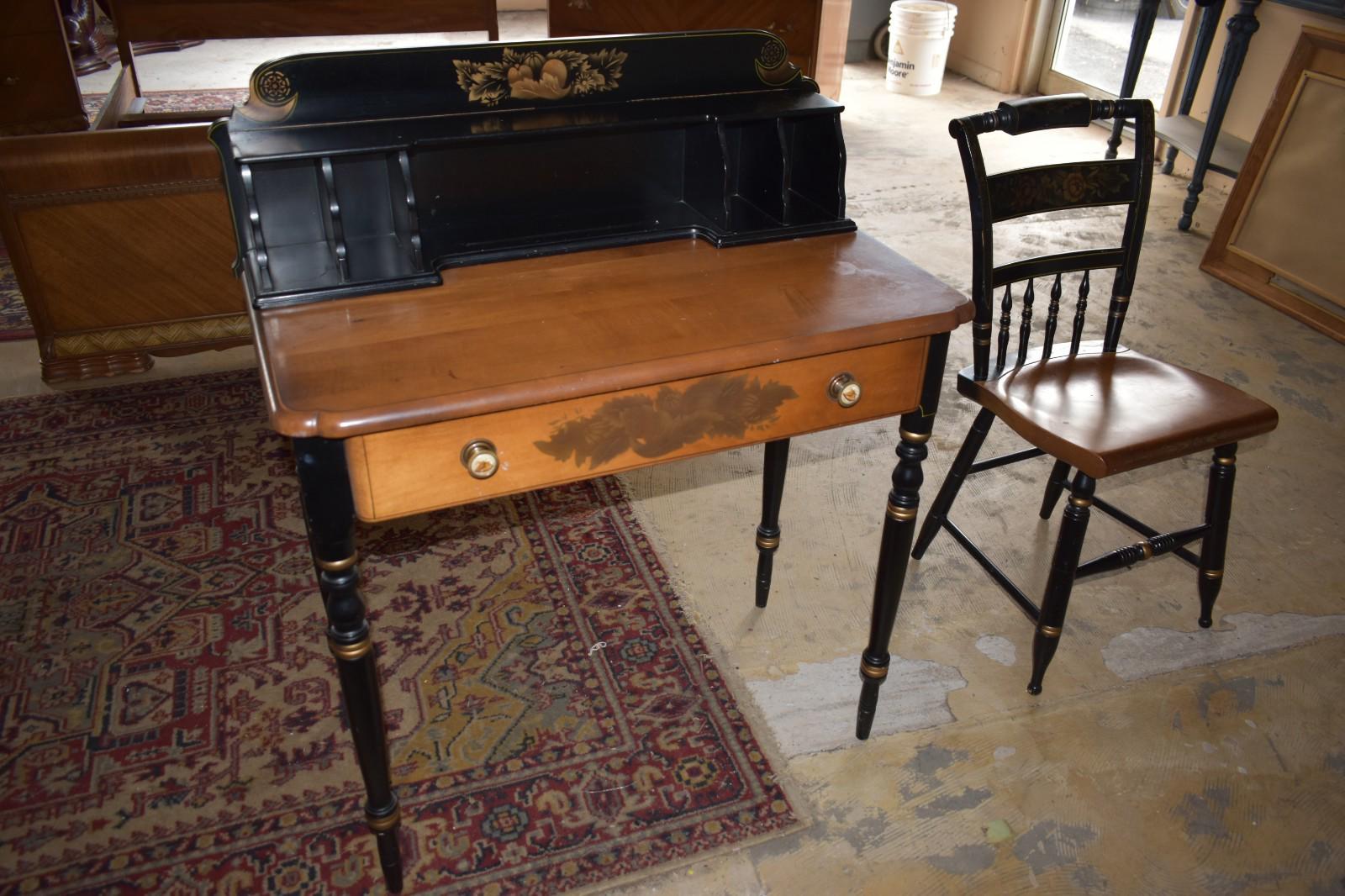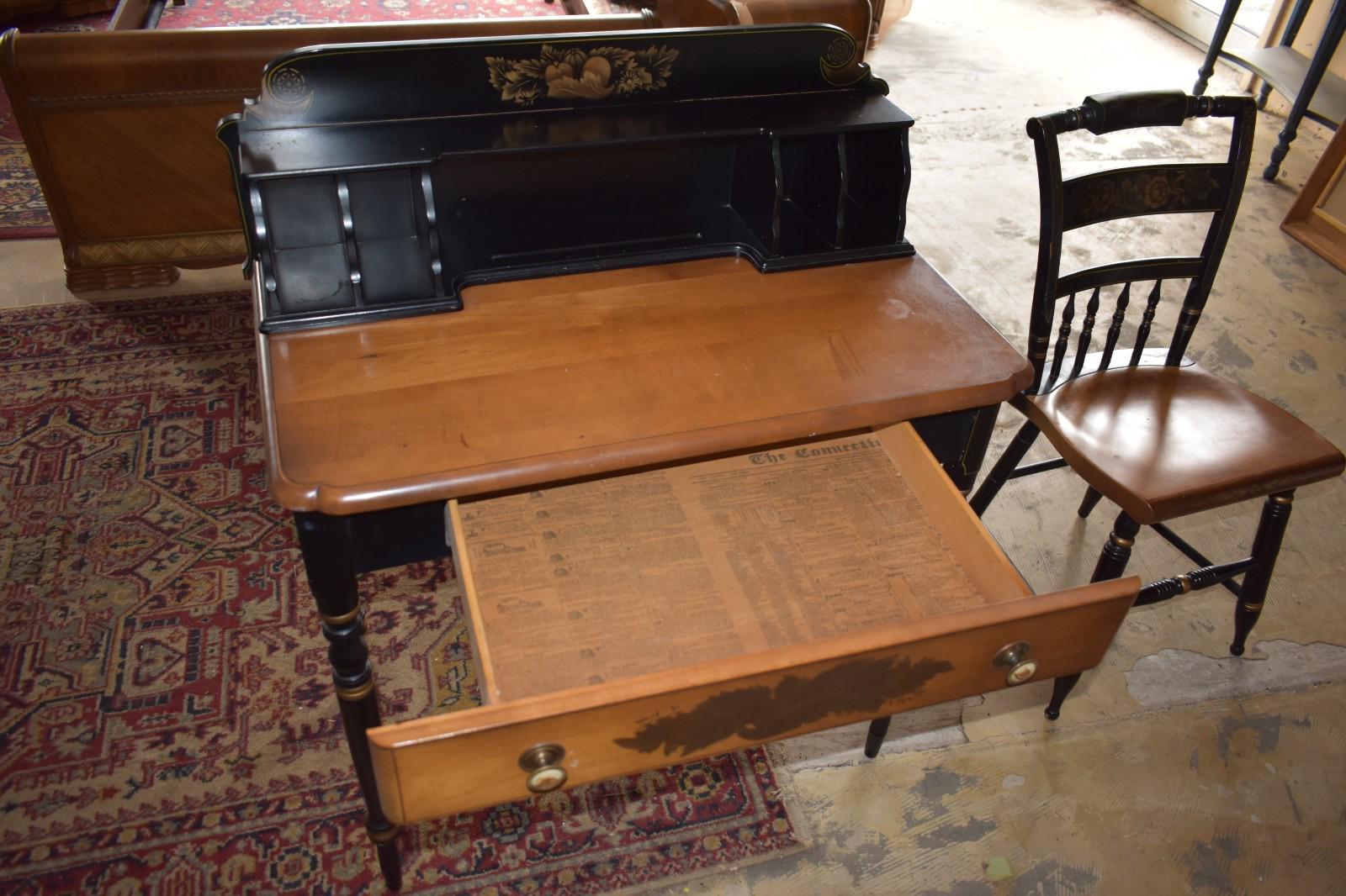 Charming stenciled black and maple writing desk with matching Hitchcock chair, retaining original back stamp reading: