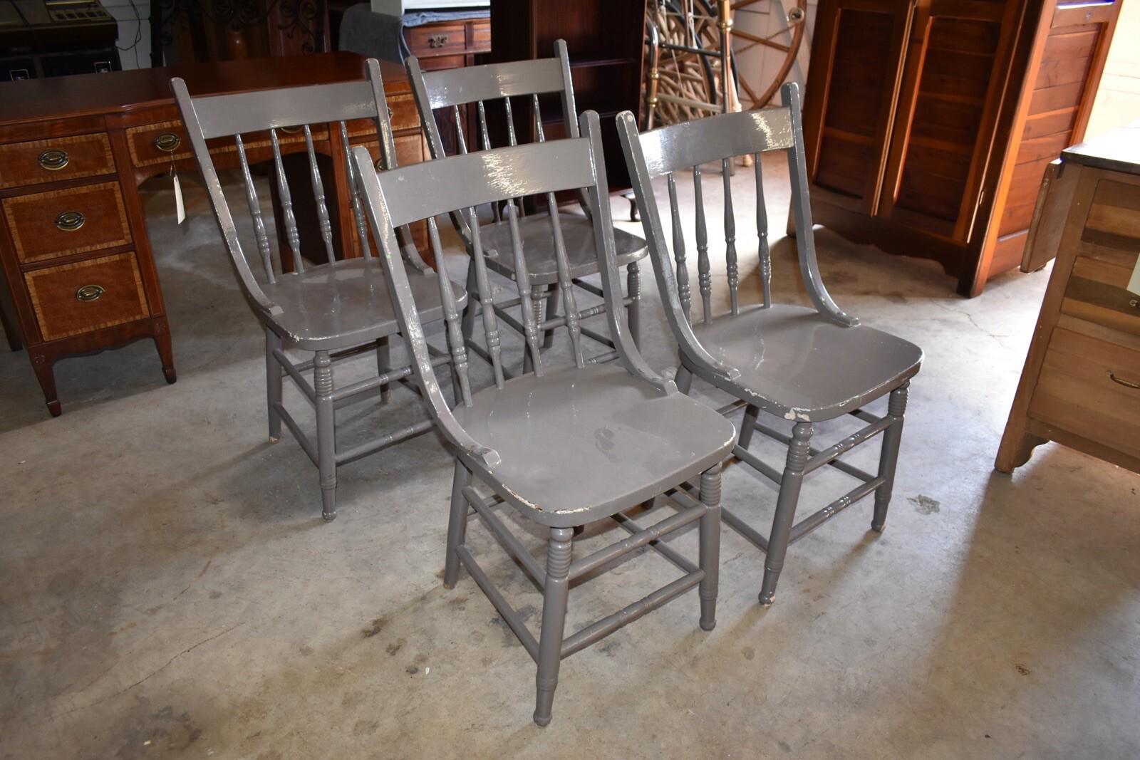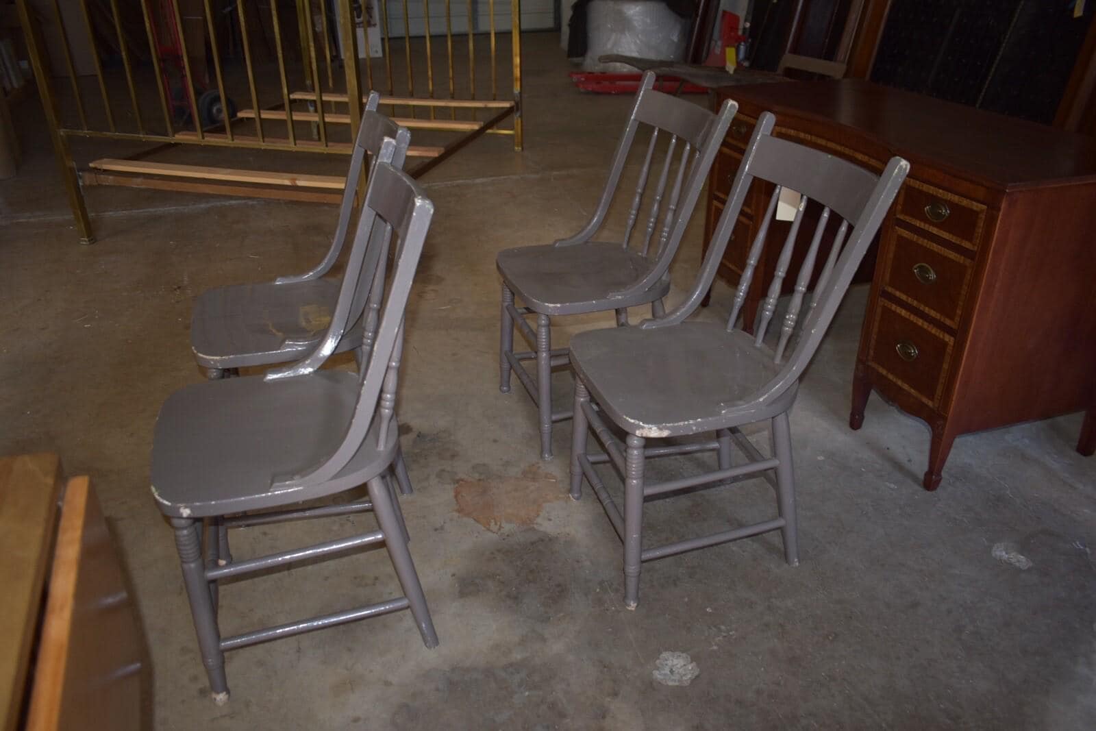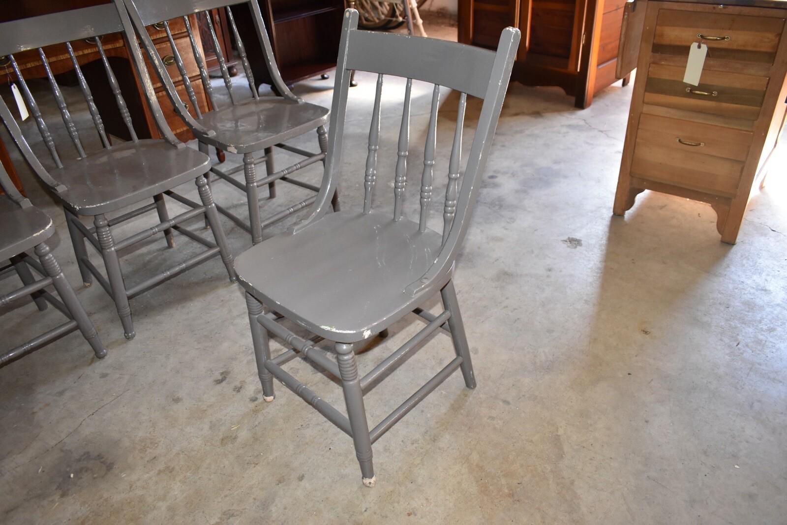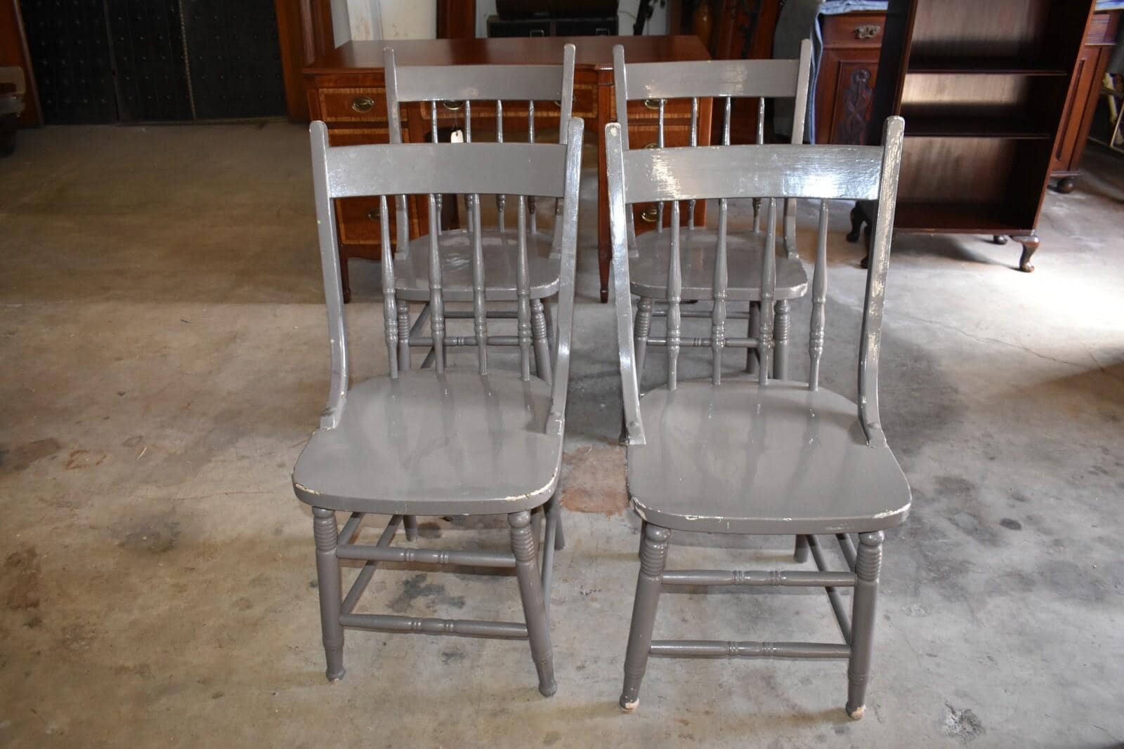 Beautiful set of 4 slate gray chairs. Sturdy and solid backed side chairs, featuring a gorgeous glossy finish.
