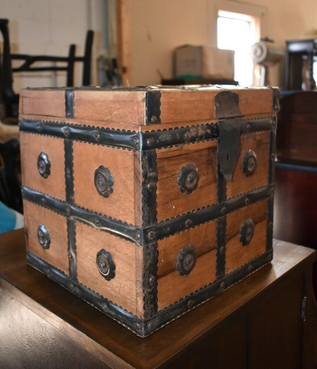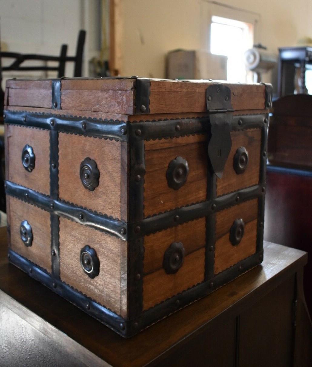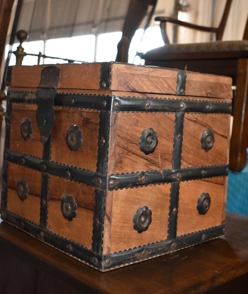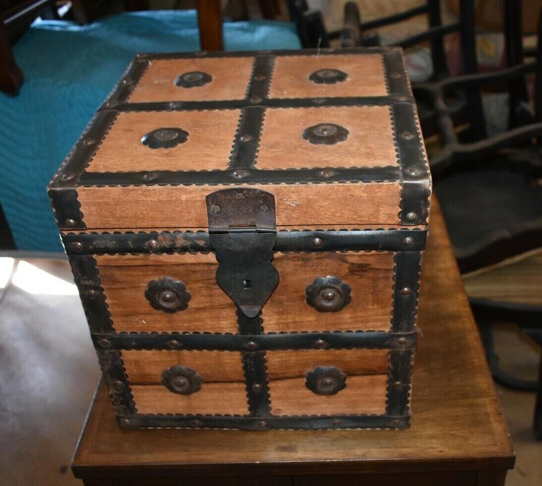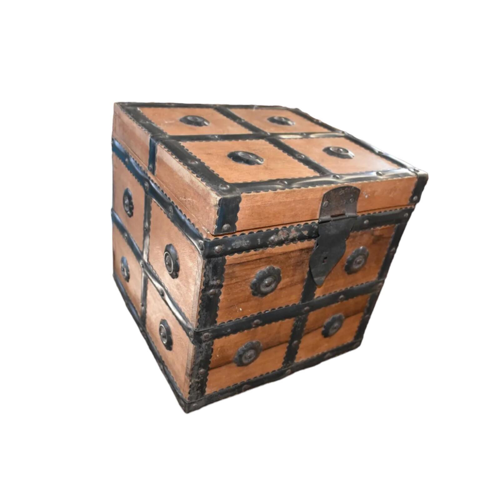 Very Unique Small Square Wood Box with Metal Straps and Medallions