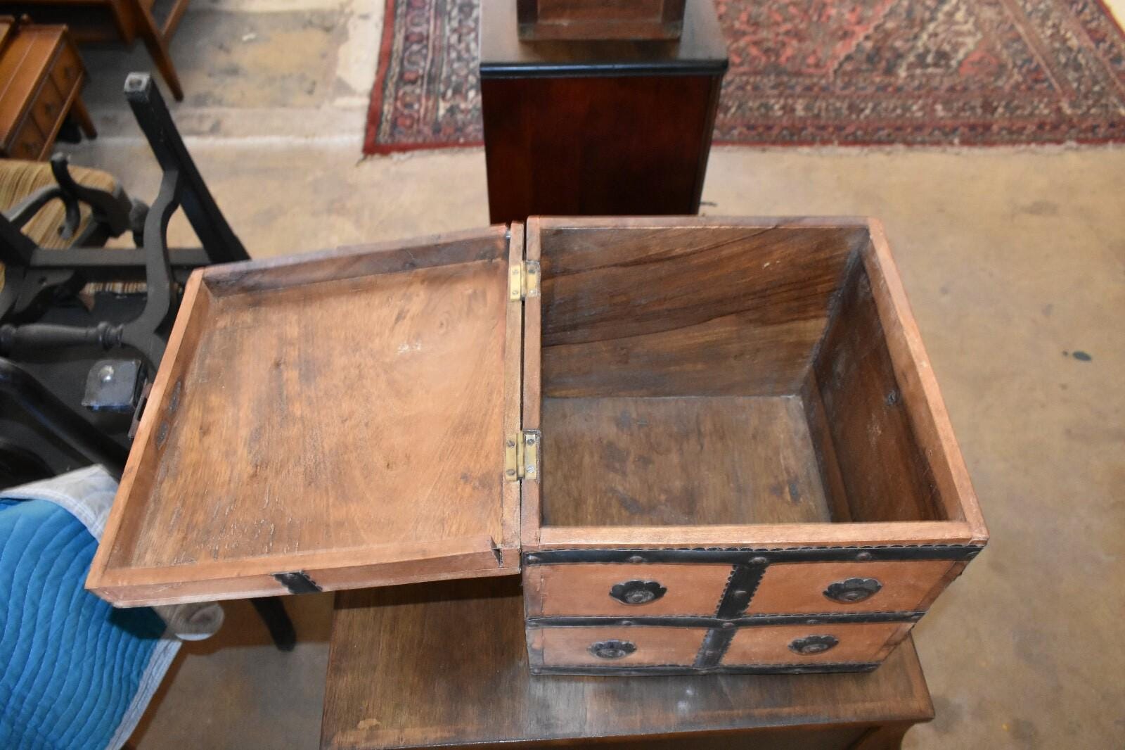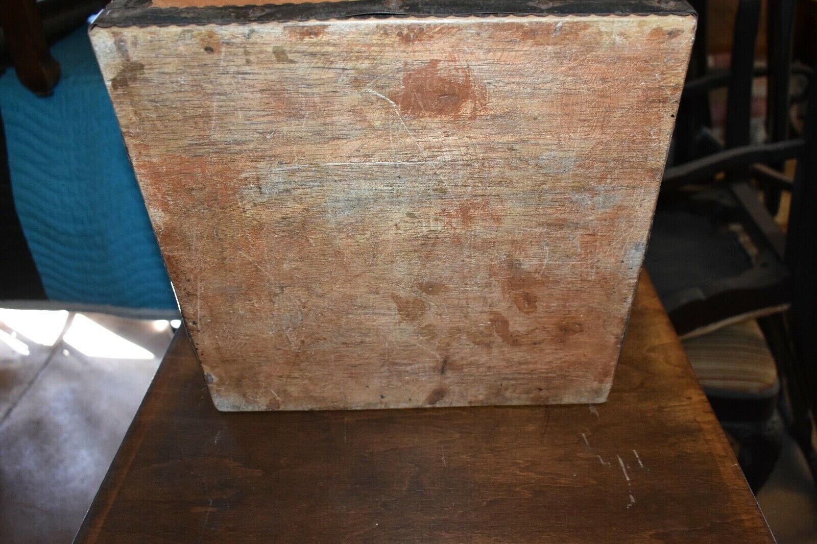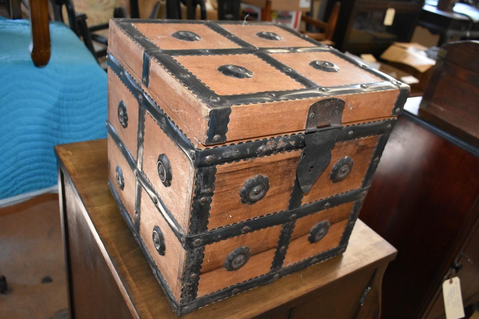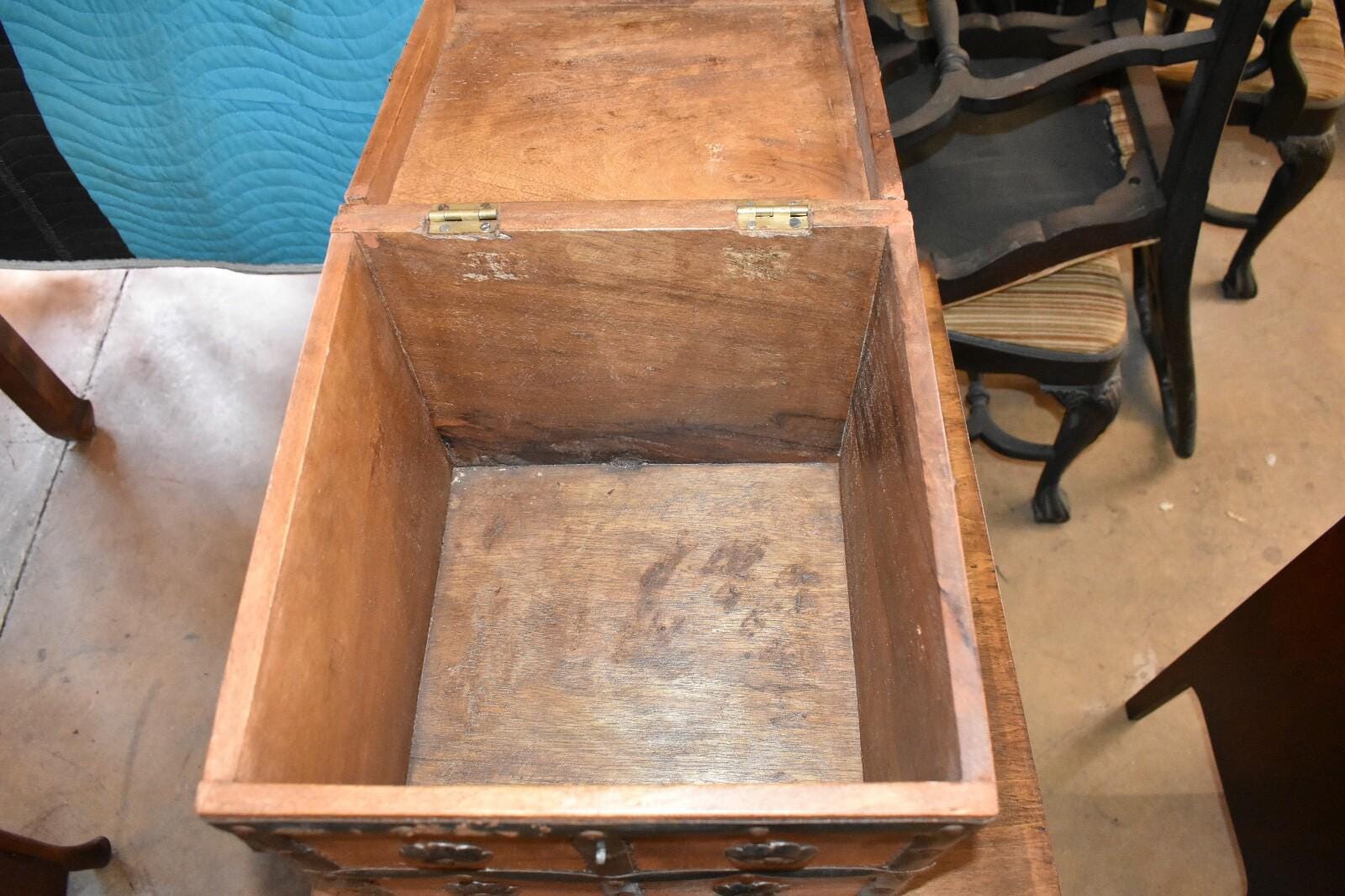 Very Unique Small Square Wood Box with Metal Straps and Medallions