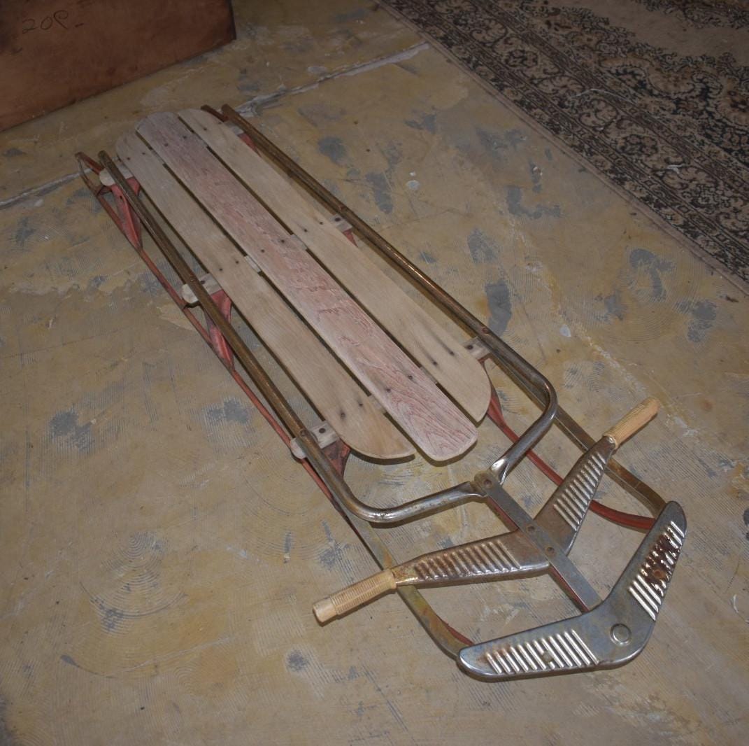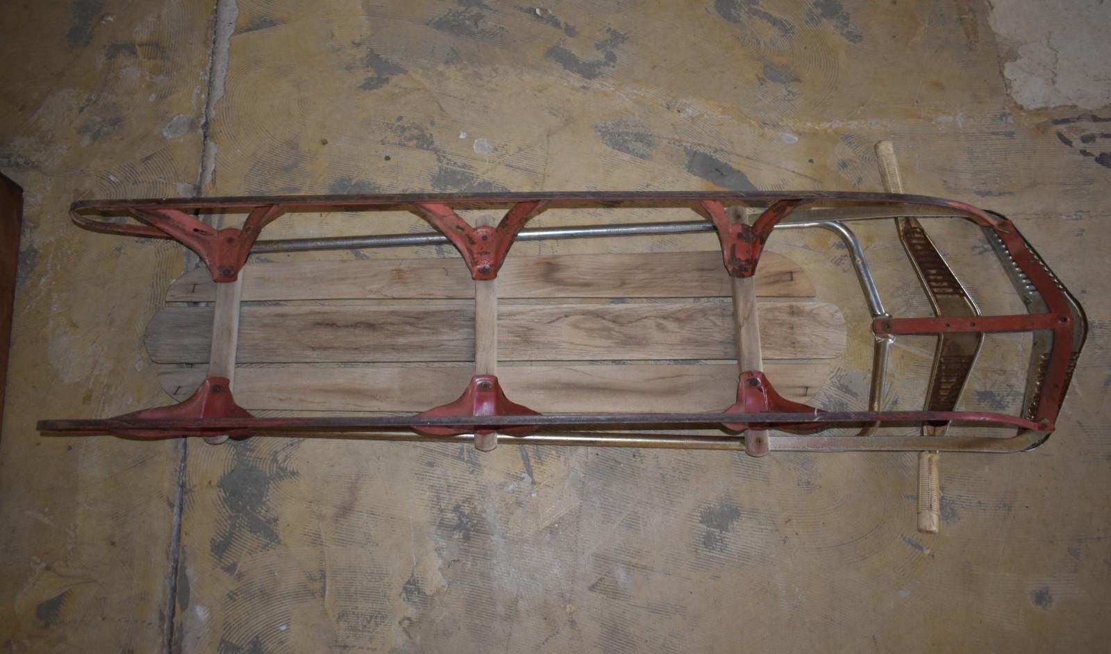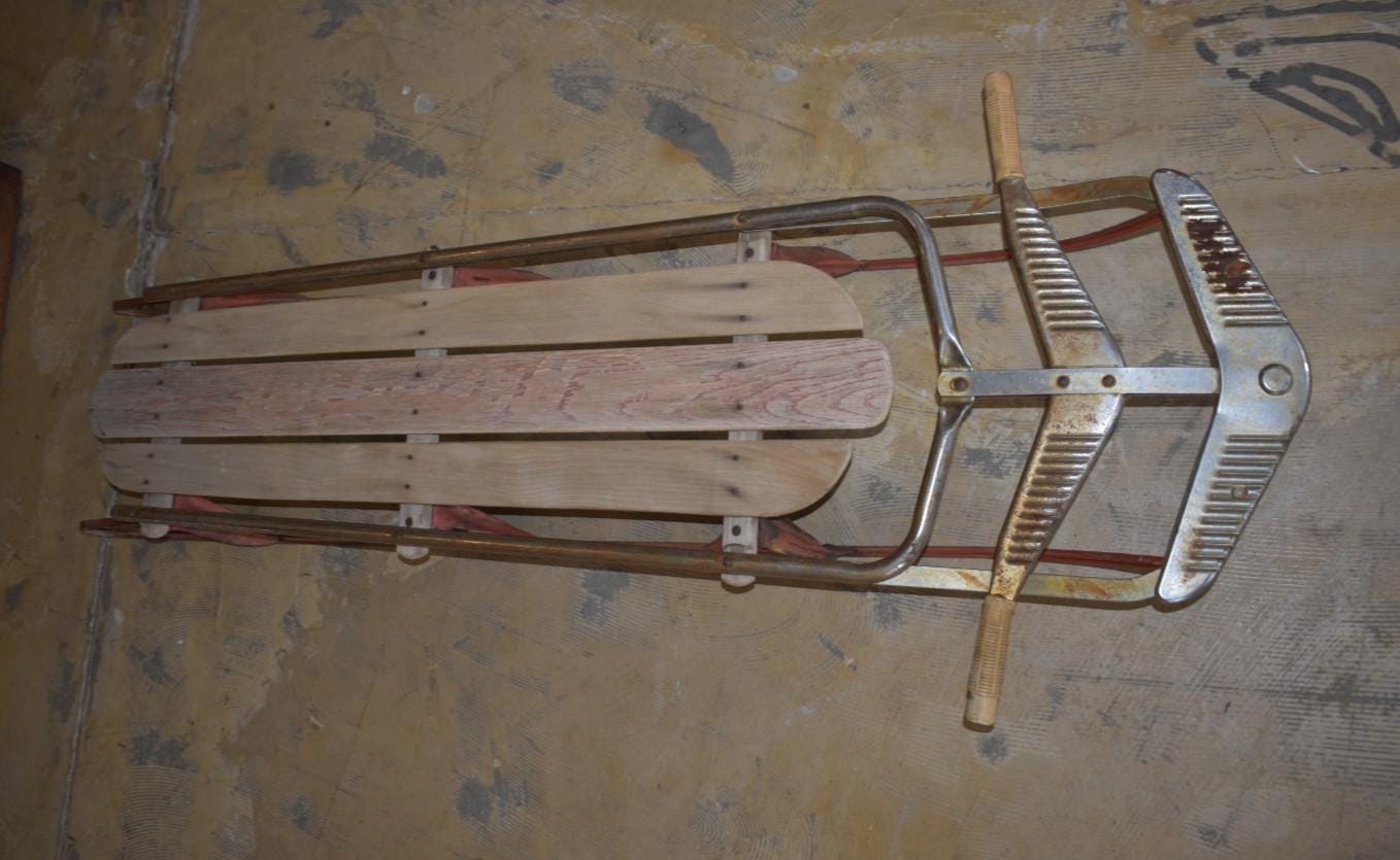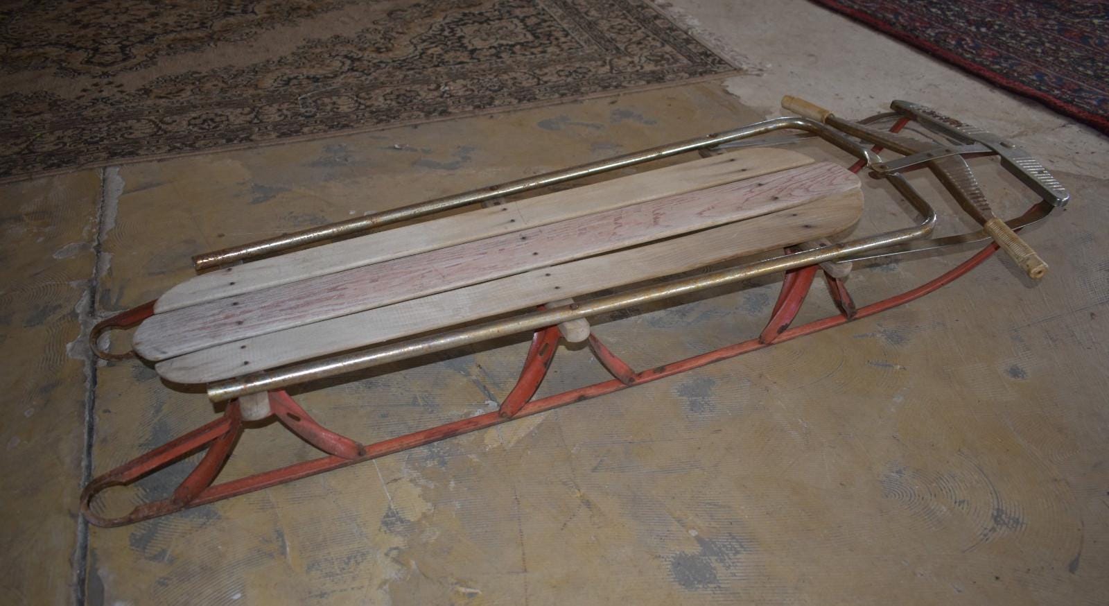 Step back into mid-century winters with this vintage wood and metal steerable sled, dating from the 1950s–1960s. This classic piece features:* Wooden slats seat and deck (some boards show natural age wear and weathering)