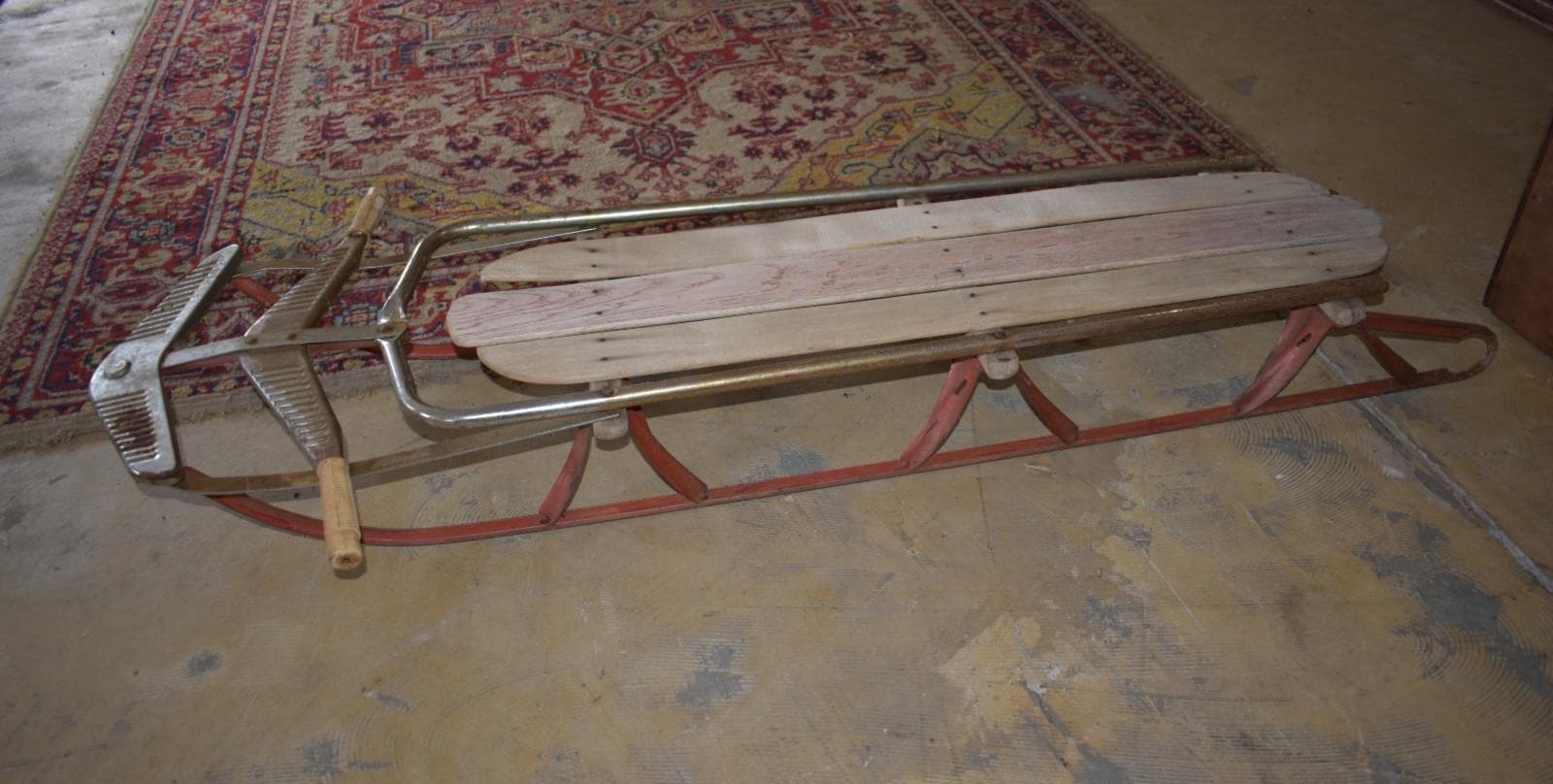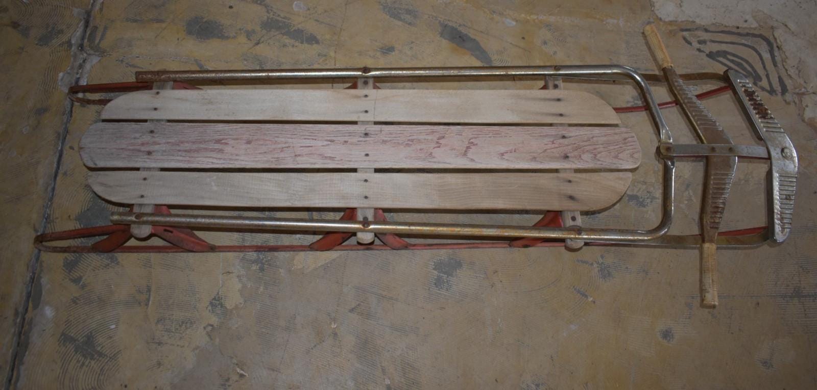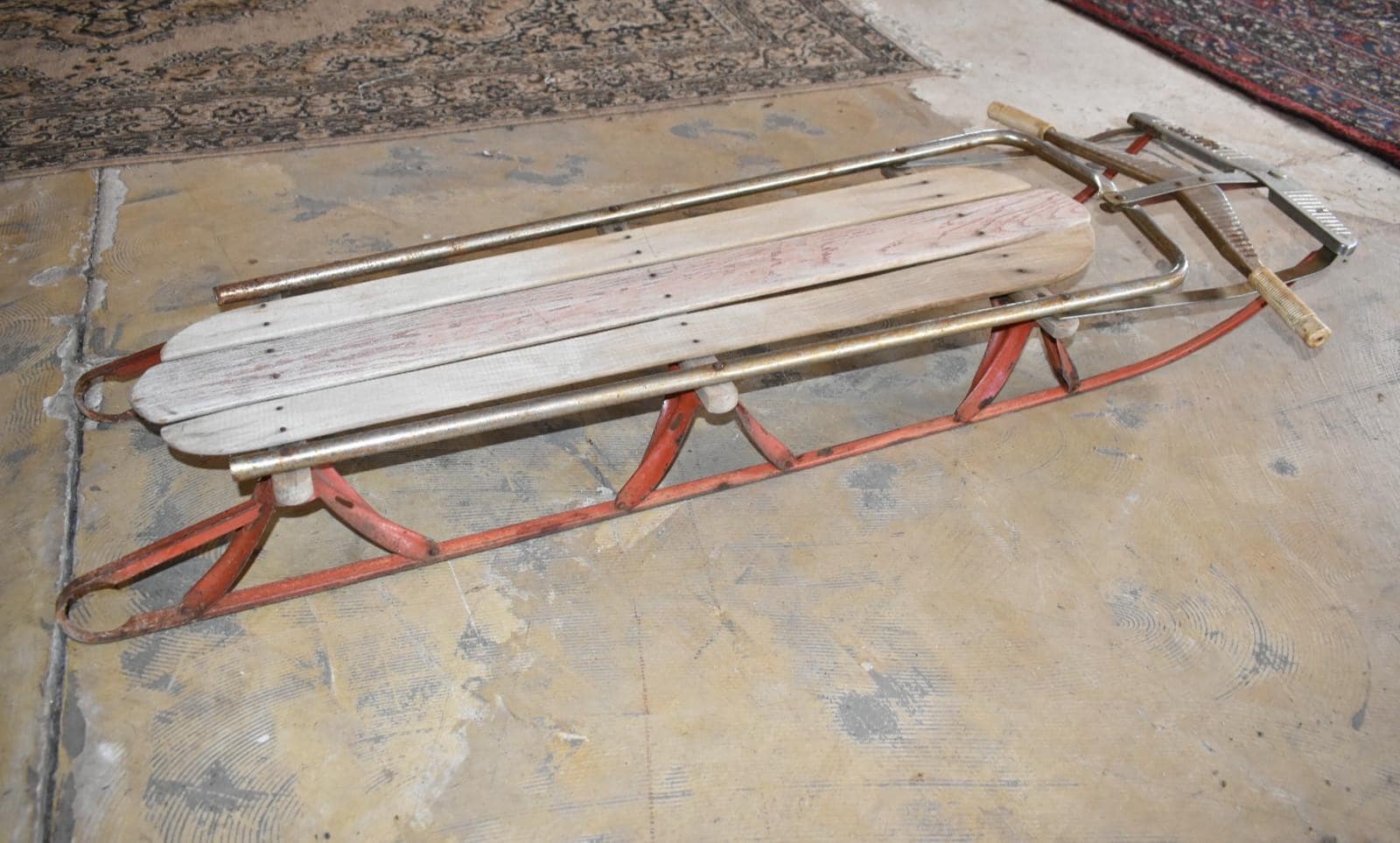 Step back into mid-century winters with this vintage wood and metal steerable sled, dating from the 1950s–1960s. This classic piece features:* Wooden slats seat and deck (some boards show natural age wear and weathering)
