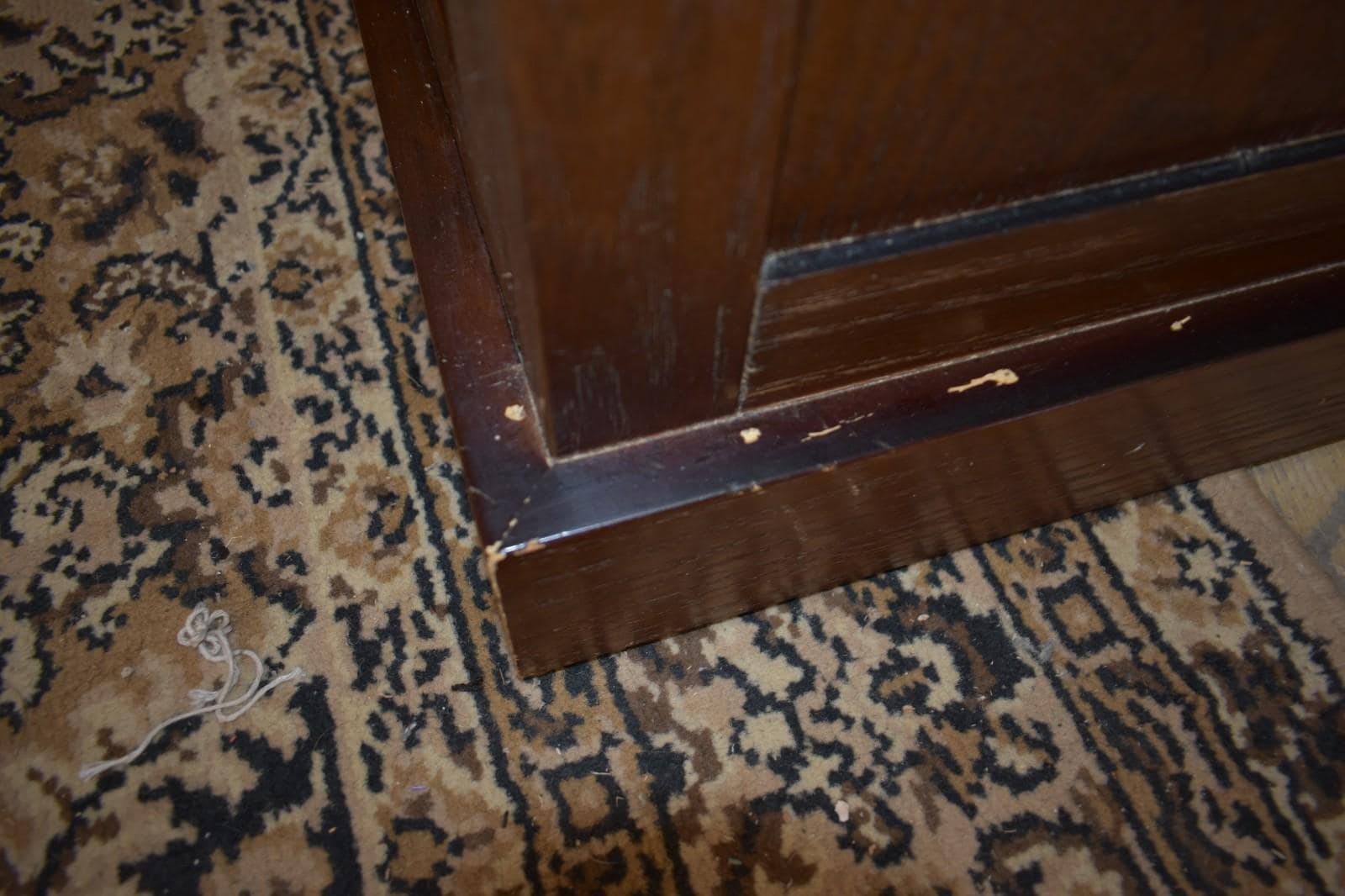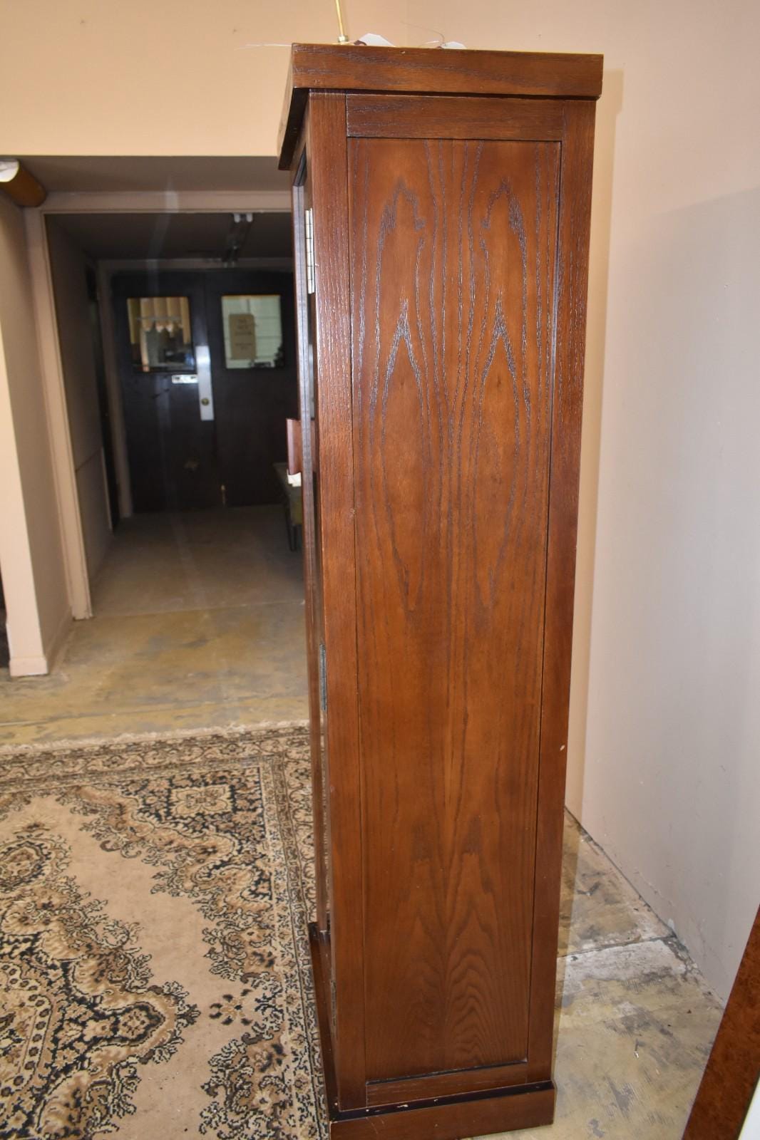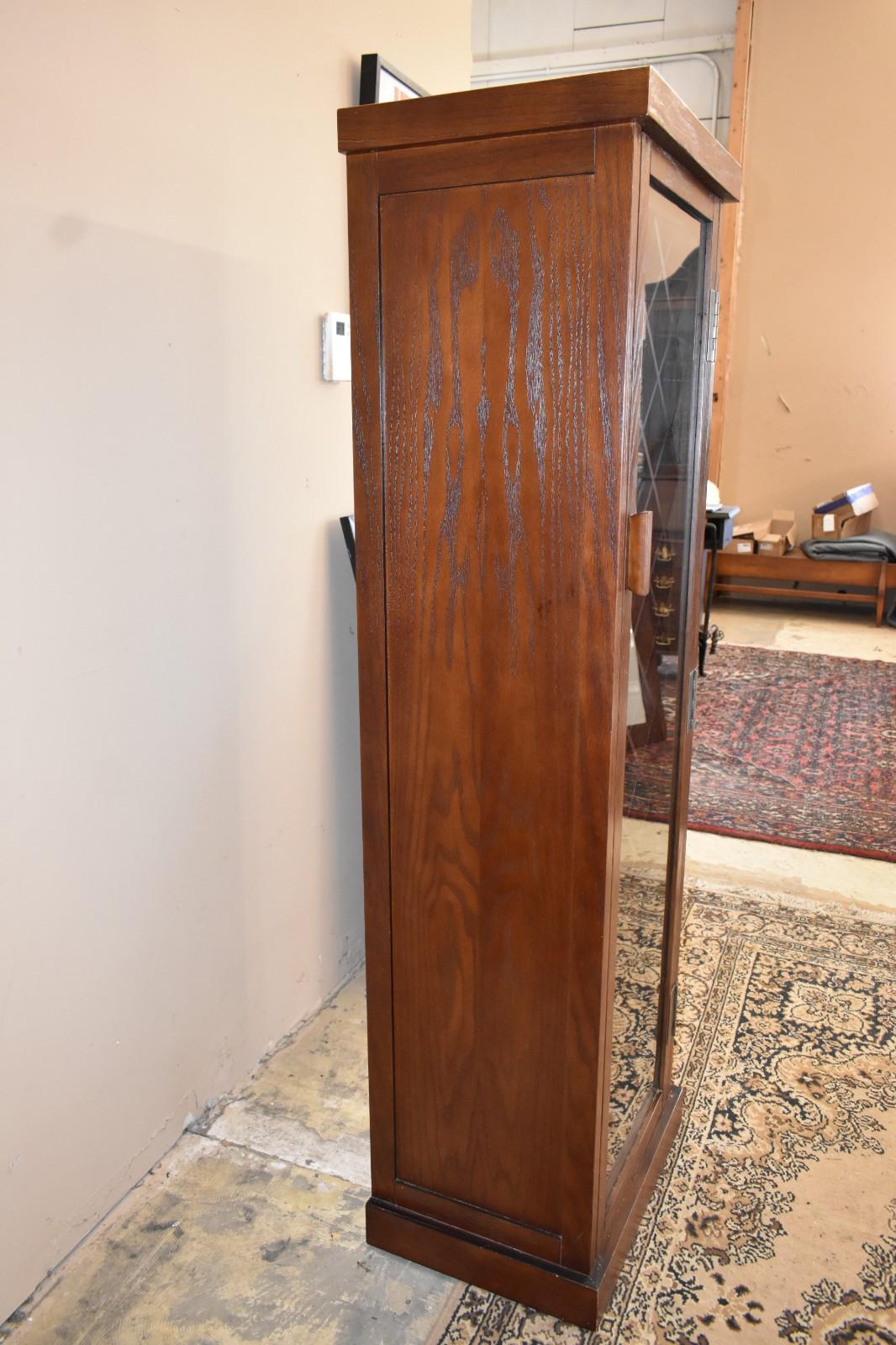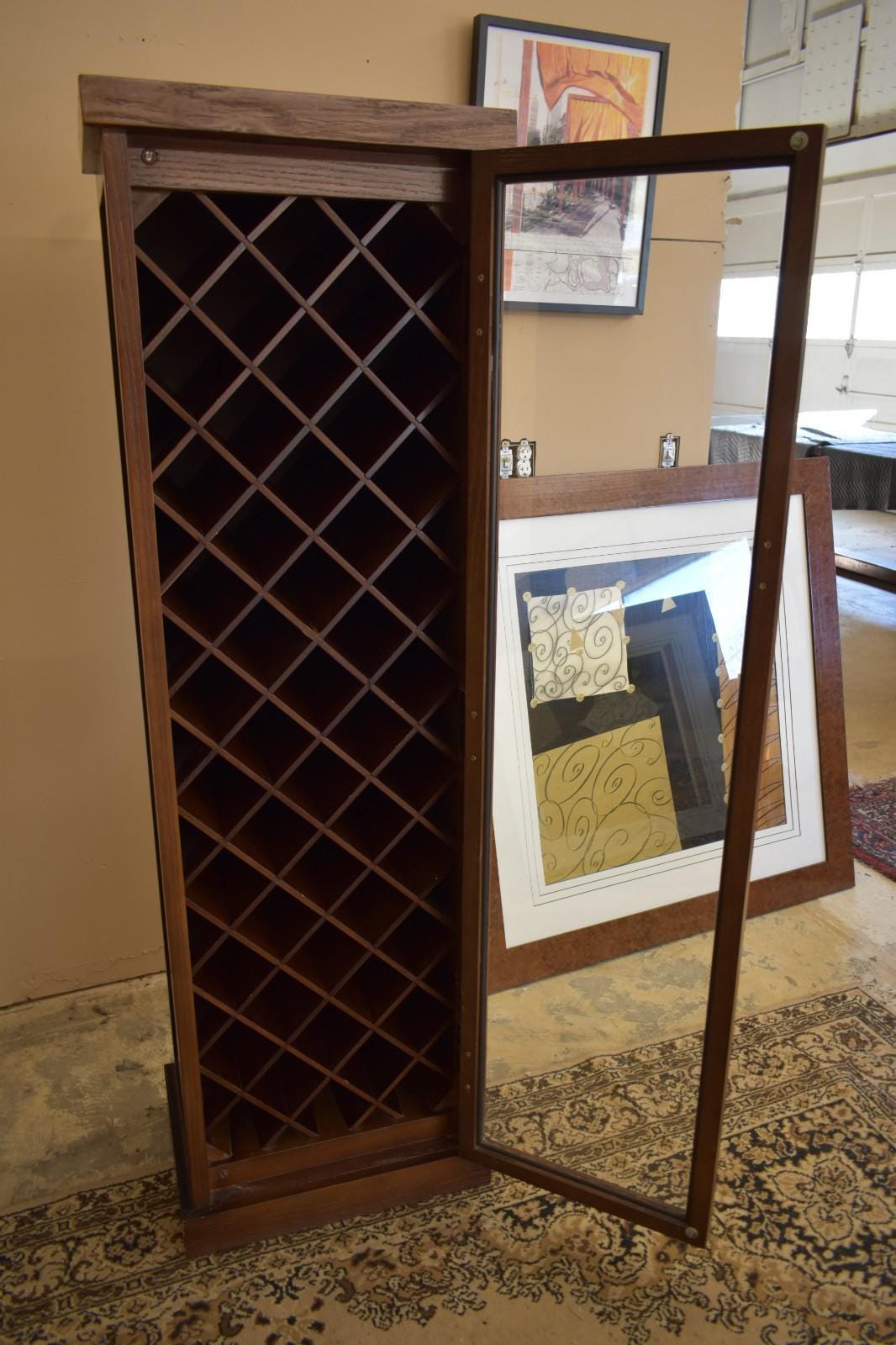 The cabinet is solidly constructed with a hinged glass door and interior wooden bottle grid. Please note visible wear consistent with age and use, including small scuffs, finish wear, and minor edge chips near the base, as shown in photos. These do not affect function and are typical for a vintage piece.