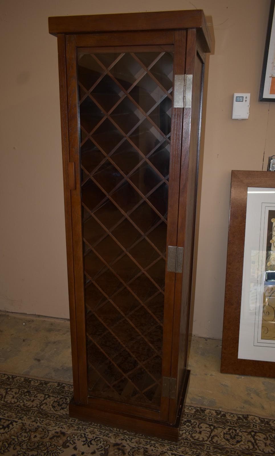 Vintage tall wood wine cabinet featuring a glass-front door with diamond lattice wine bottle storage. The cabinet offers generous vertical storage (48 bottles) with individual bottle compartments, making it ideal for wine, spirits, or display storage.
