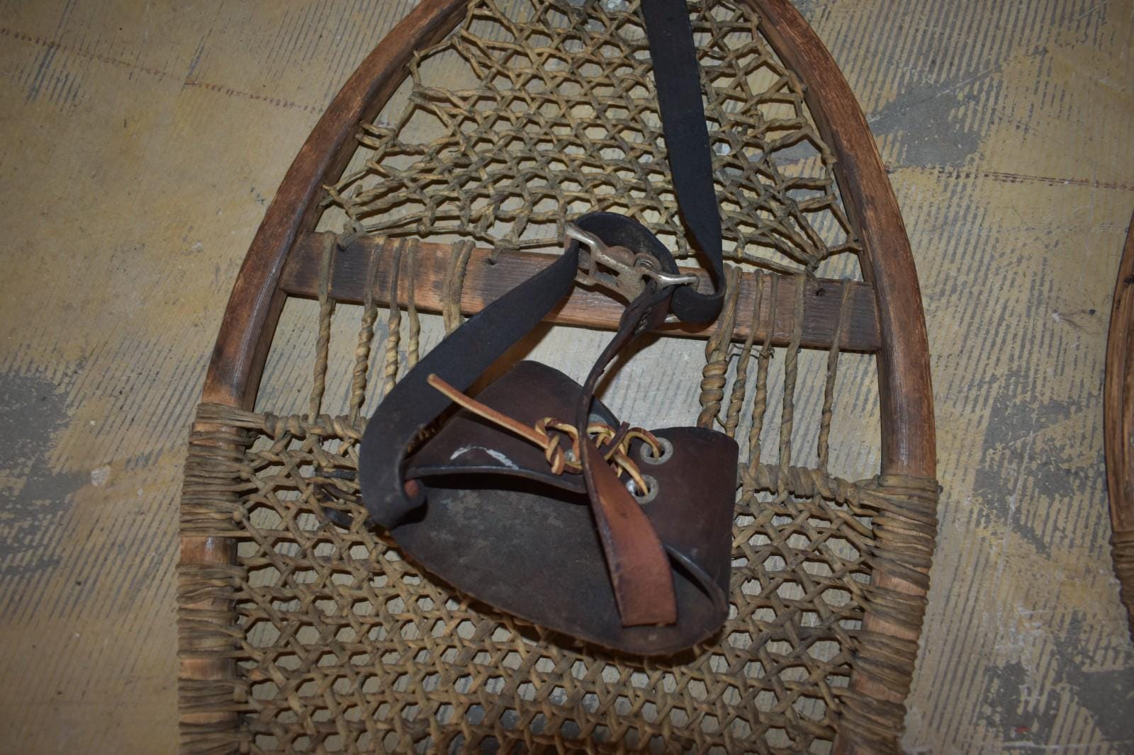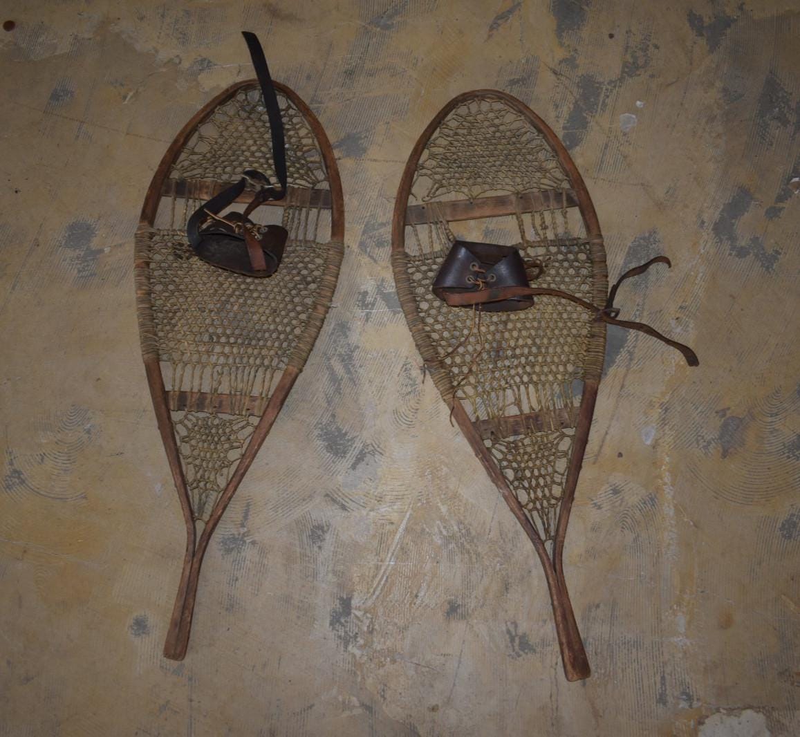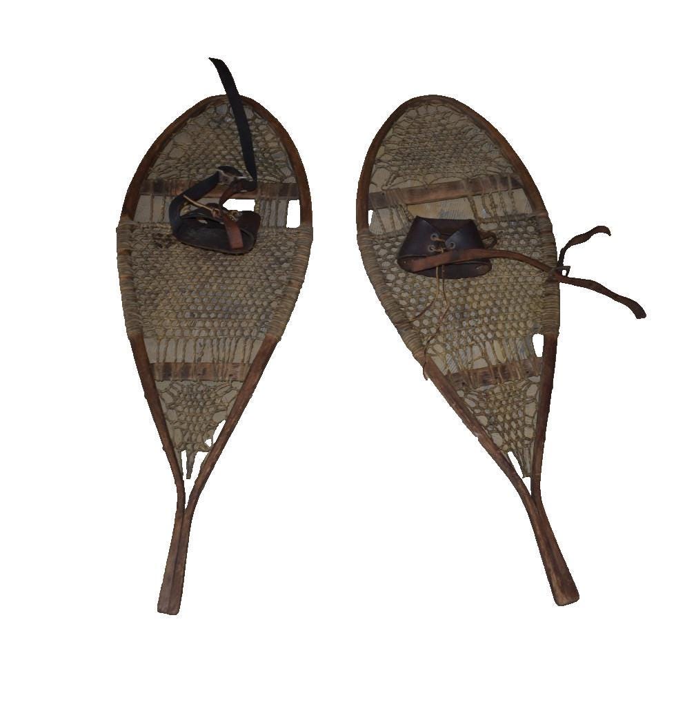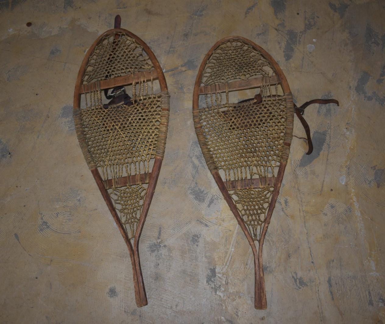 Authentic pair of vintage wooden snowshoes, likely dating from the 1940sā50s. Handcrafted with bentwood frames, traditional rawhide webbing, and original leather bindings. These feature teardrop-shaped frames with rawhide lacing that shows natural wear and age patina, but remains intact. Leather foot harnesses and straps are present, with expected cracking and dryness from age.