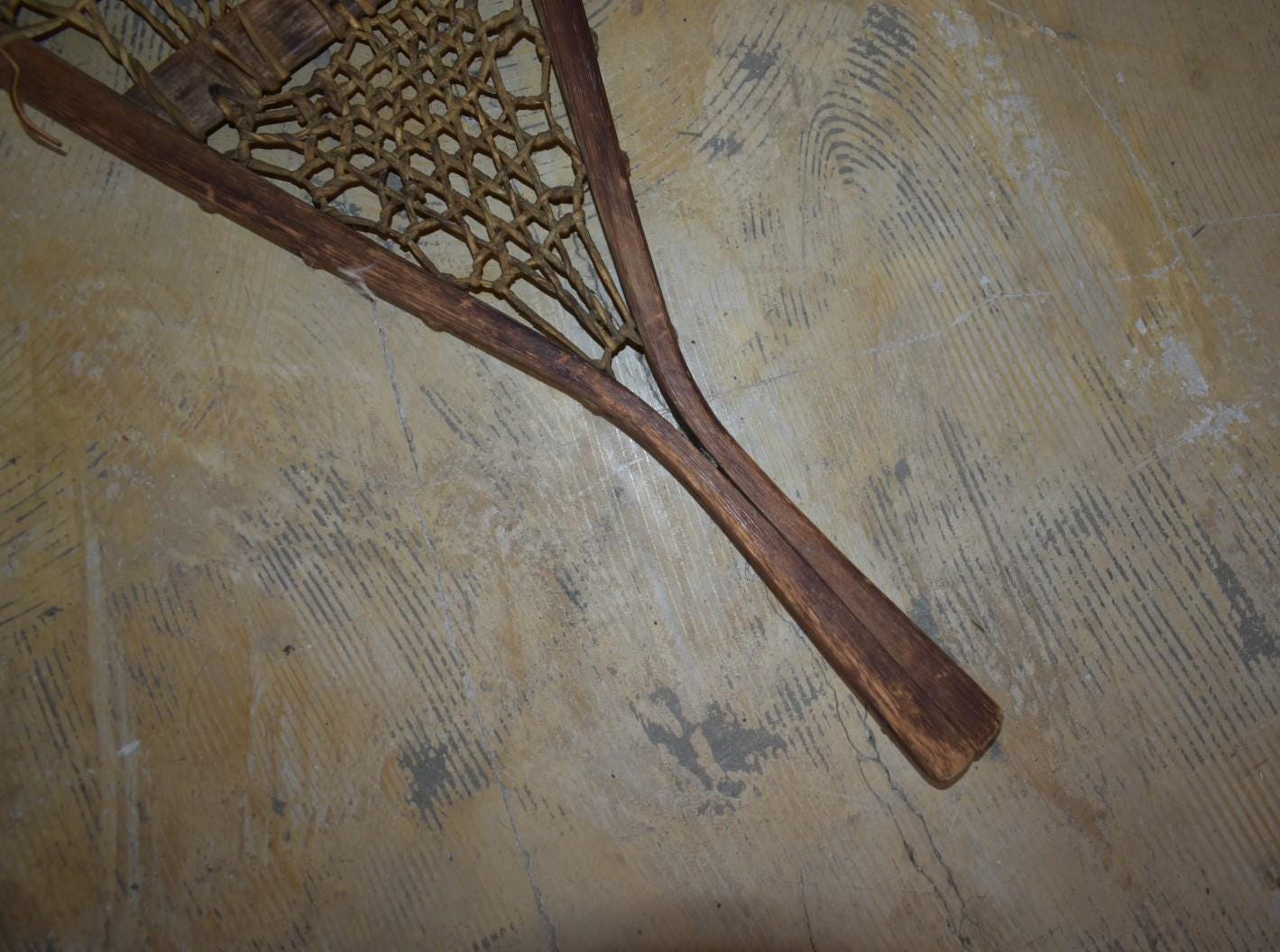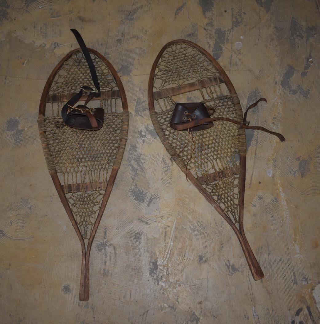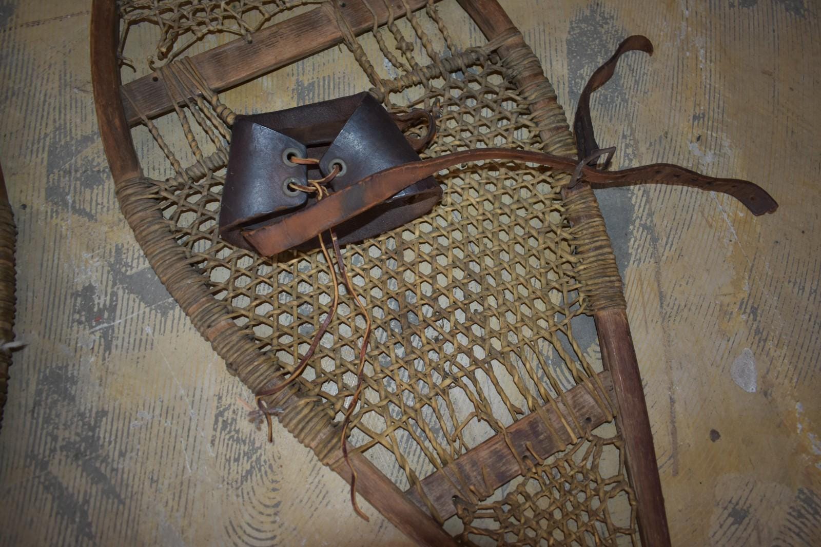Authentic pair of vintage wooden snowshoes, likely dating from the 1940sā50s. Handcrafted with bentwood frames, traditional rawhide webbing, and original leather bindings. These feature teardrop-shaped frames with rawhide lacing that shows natural wear and age patina, but remains intact. Leather foot harnesses and straps are present, with expected cracking and dryness from age.