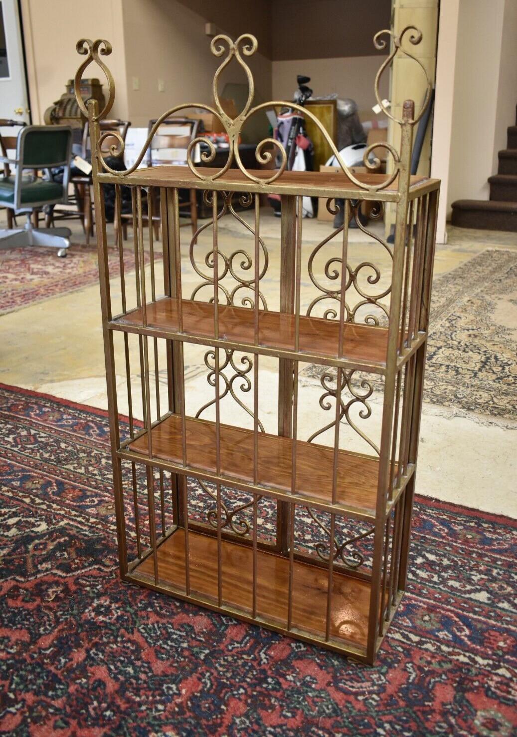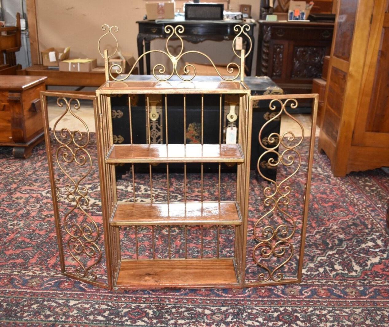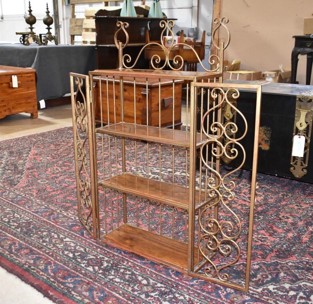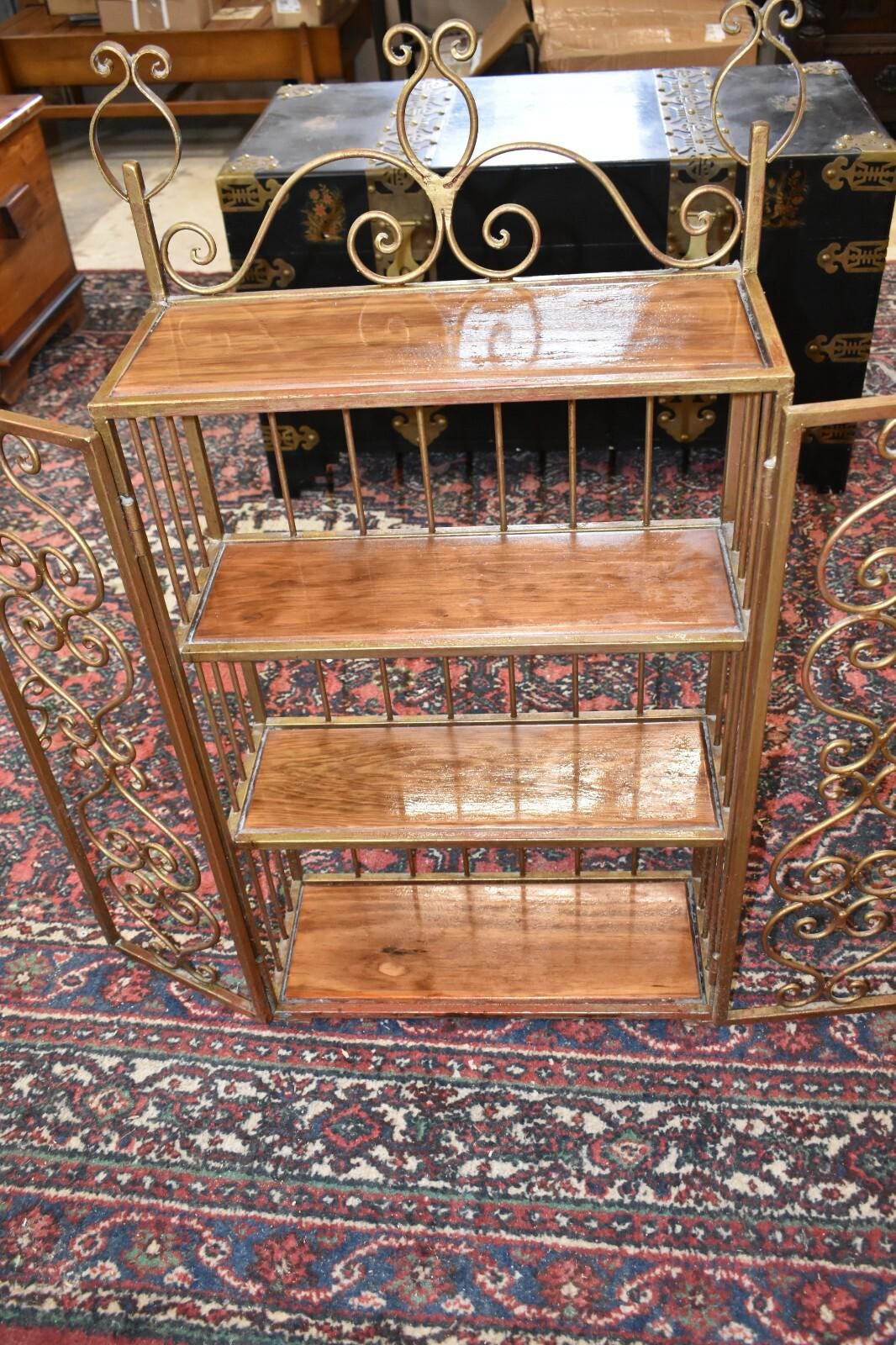 A metal/iron shelving unit with 3 interior shelves one upper shelf on the outside.