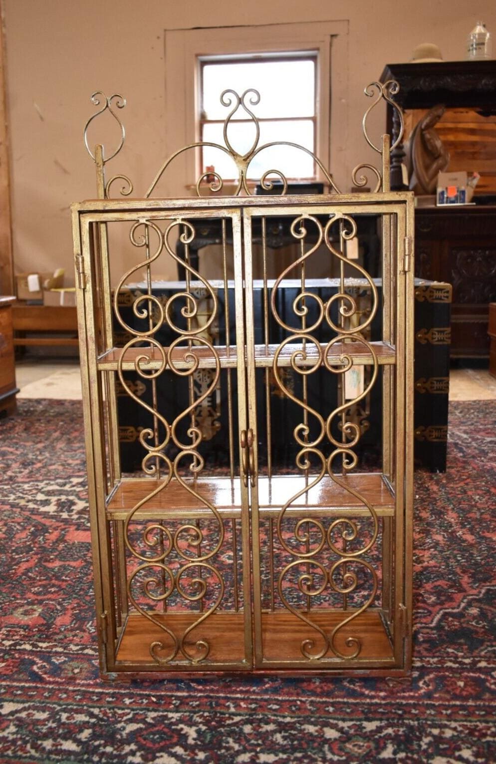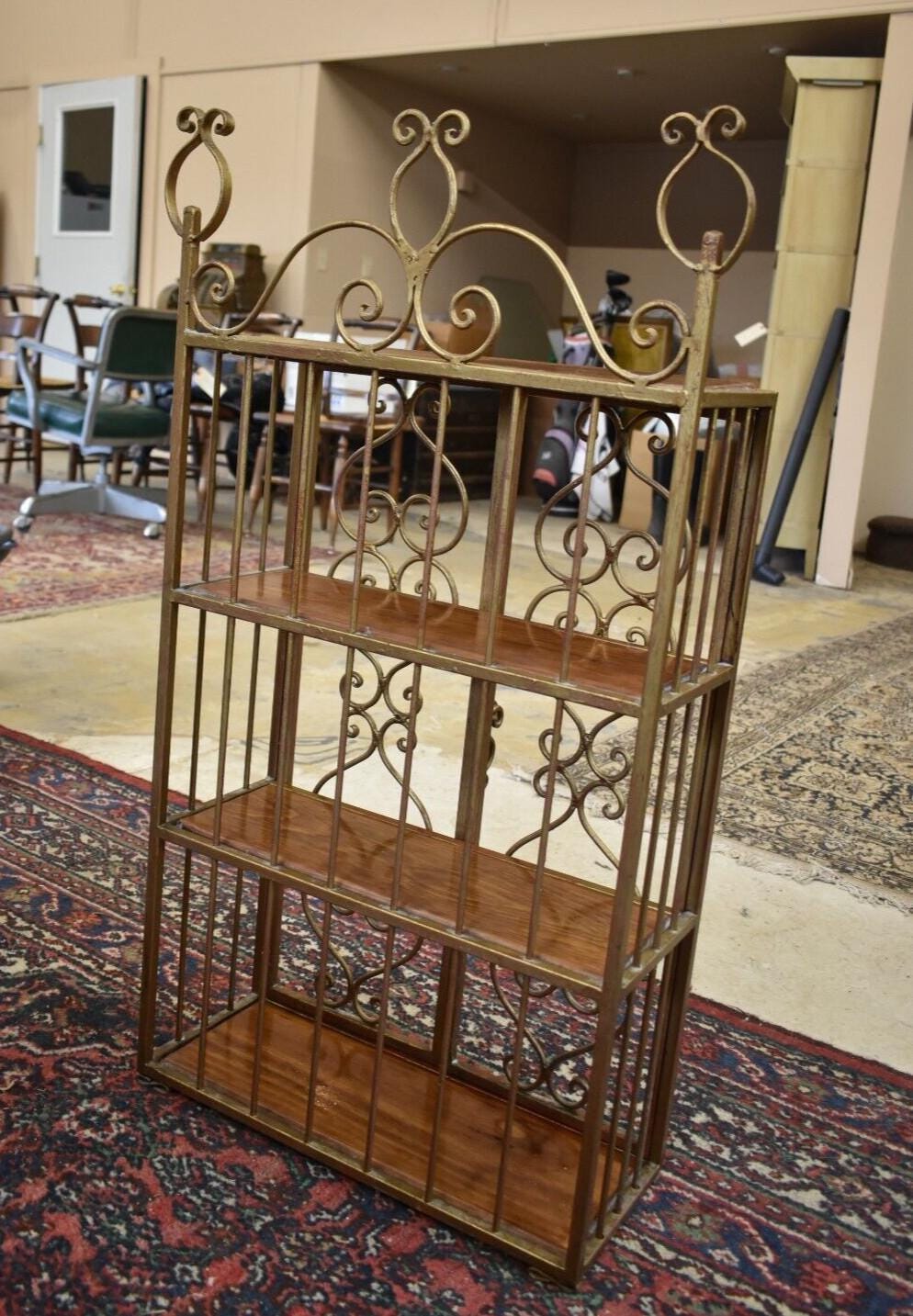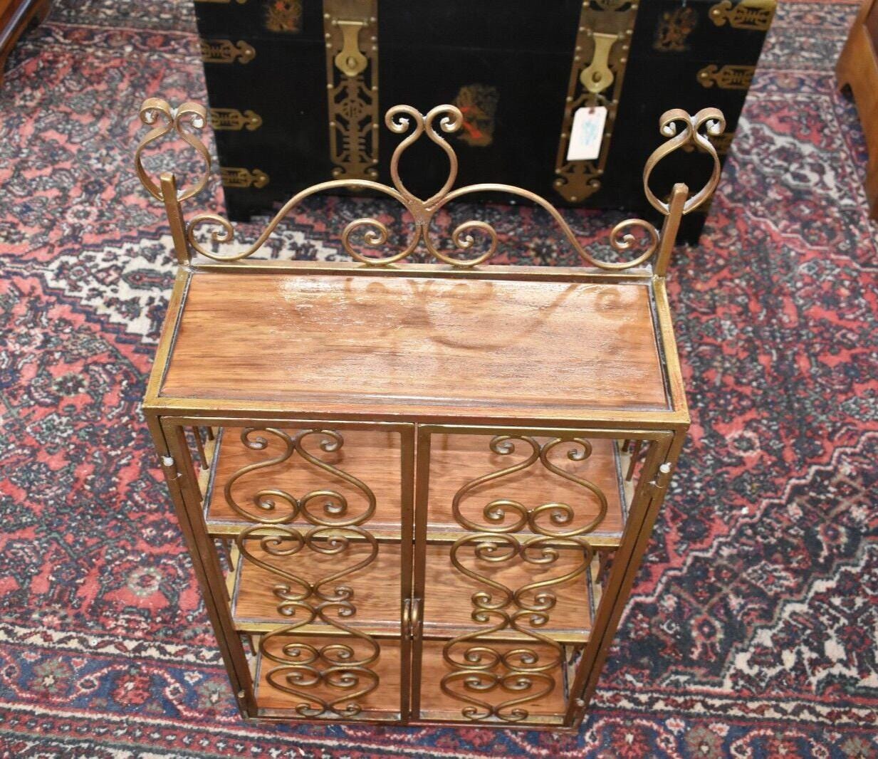 A metal/iron shelving unit with 3 interior shelves one upper shelf on the outside.