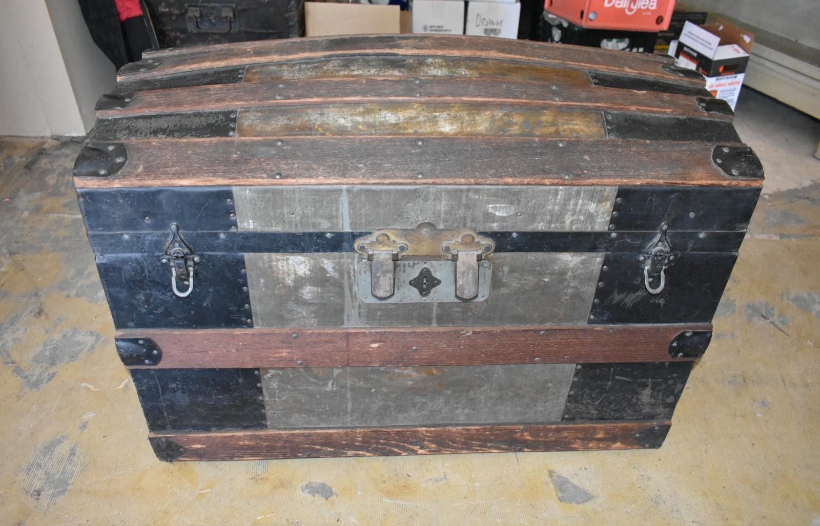 Antique Wood Slat Dome Top Steamer Trunk Primitive Travel Chest 1900